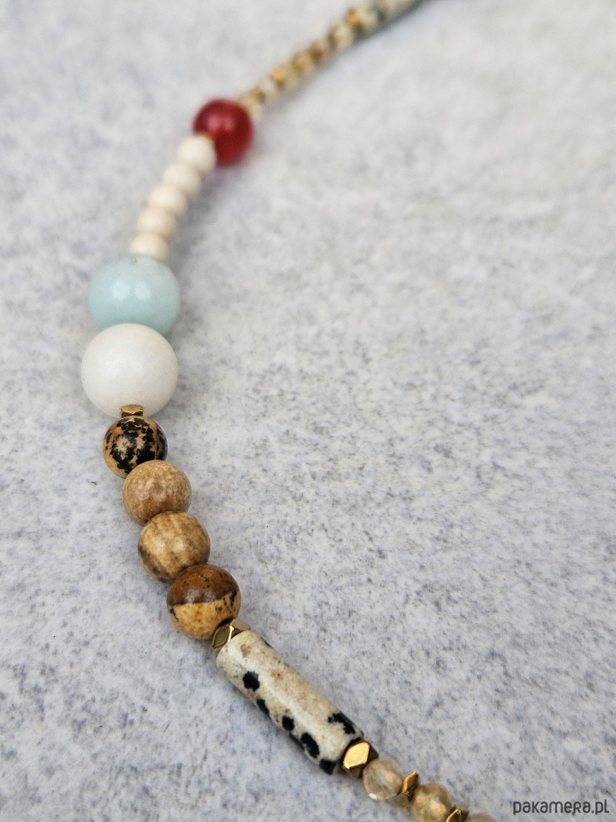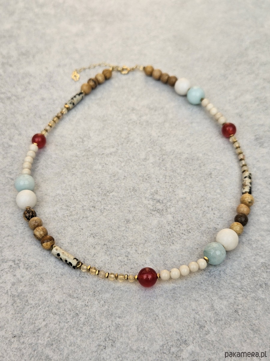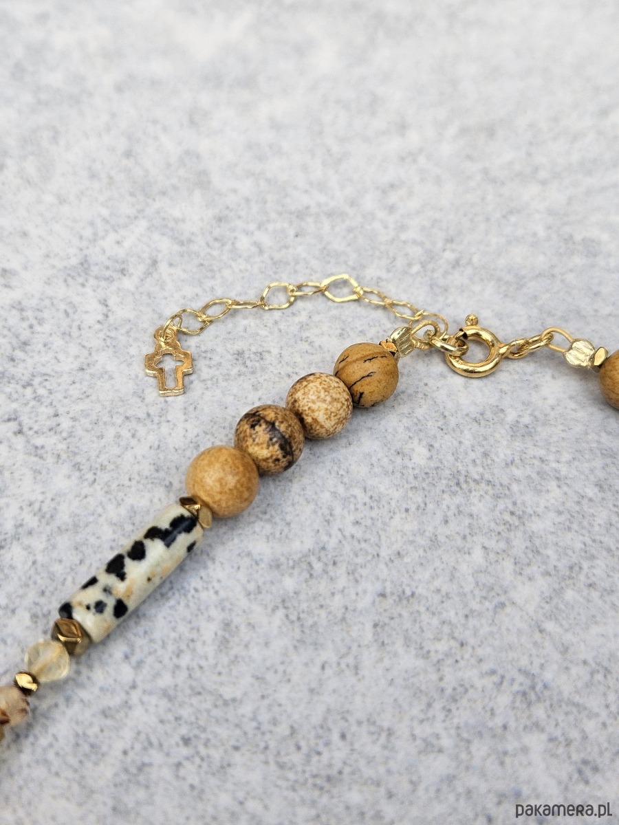 Unikatowy naszyjnik wykonany z precyzyjnie dobranych kamieni naturalnych, którego długość wynosi 40 cm, z dodatkową 3-centymetrową przedłużką, zakończoną ozdobą ze srebra złoconego. W tej kompozycji znajdziesz kamienie o średnicy od 2 do 12 mm, takie jak słoneczny cytryn, harmonijny jadeit, jaspis dalmatyński, organiczny kamień rzeczny, uziemiający jaspis krajobrazowy oraz potężny hematyt. Ta biżuteria to znacznie więcej niż ozdoba. To amulet obfitości i wewnętrznej siły, stworzony, by wspierać Cię na co dzień. Energia cytrynu przyciąga bogactwo i sukces, dodając optymizmu i pewności siebie w realizacji celów. Jadeit, kamień szczęścia i mądrości, wprowadza do życia harmonię i spokój, jednocześnie chroniąc przed negatywną energią. Jaspis dalmatyński przypomina o dziecięcej radości i beztrosce, pomagając porzucić zmartwienia, podczas gdy jaspis krajobrazowy i kamień rzeczny łączą nas z energią Matki Ziemi, dając poczucie stabilności i bezpieczeństwa. Całość dopełnia hematyt, kamień wojowników, który dodaje odwagi, siły woli i potężnie uziemia, chroniąc Twoją aurę. Nosząc ten naszyjnik, otaczasz się wibracją sukcesu, spokoju i niezachwianej siły.