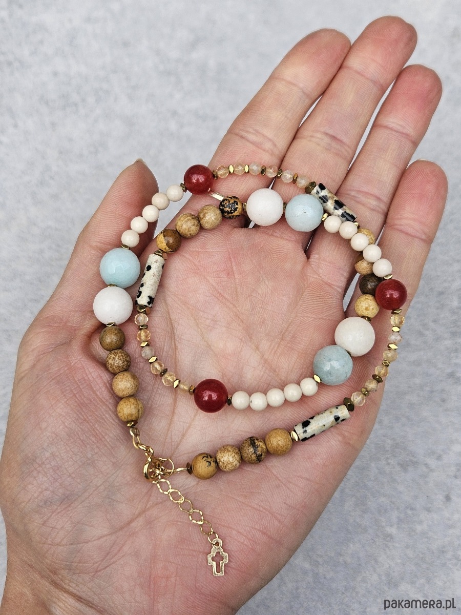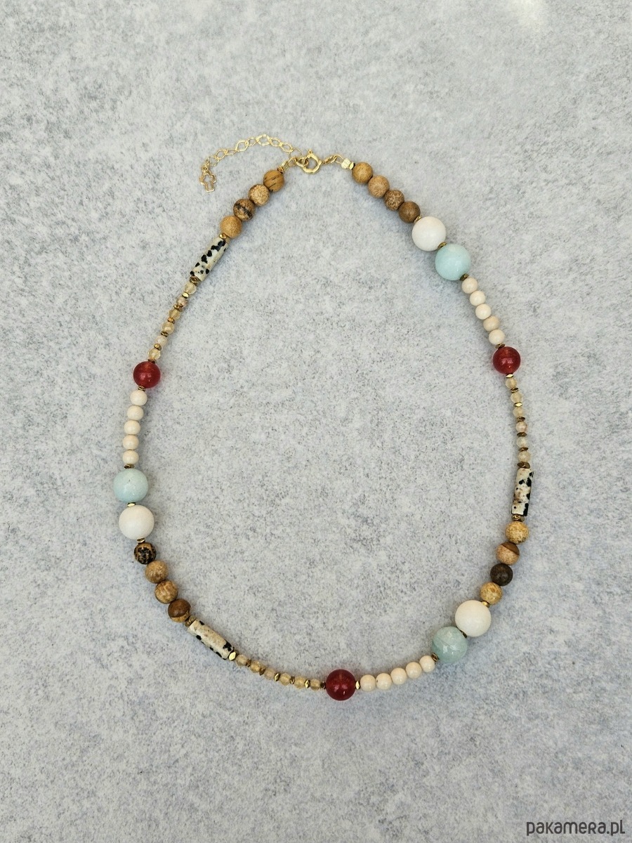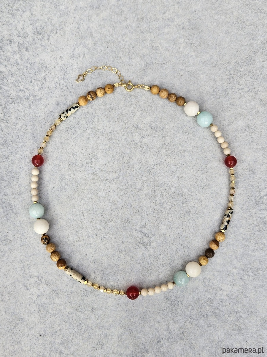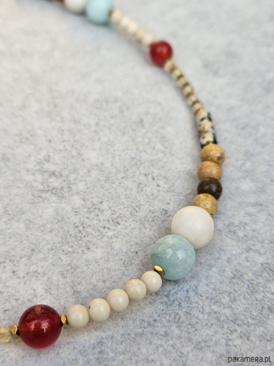 Unikatowy naszyjnik wykonany z precyzyjnie dobranych kamieni naturalnych, którego długość wynosi 40 cm, z dodatkową 3-centymetrową przedłużką, zakończoną ozdobą ze srebra złoconego. W tej kompozycji znajdziesz kamienie o średnicy od 2 do 12 mm, takie jak słoneczny cytryn, harmonijny jadeit, jaspis dalmatyński, organiczny kamień rzeczny, uziemiający jaspis krajobrazowy oraz potężny hematyt. Ta biżuteria to znacznie więcej niż ozdoba. To amulet obfitości i wewnętrznej siły, stworzony, by wspierać Cię na co dzień. Energia cytrynu przyciąga bogactwo i sukces, dodając optymizmu i pewności siebie w realizacji celów. Jadeit, kamień szczęścia i mądrości, wprowadza do życia harmonię i spokój, jednocześnie chroniąc przed negatywną energią. Jaspis dalmatyński przypomina o dziecięcej radości i beztrosce, pomagając porzucić zmartwienia, podczas gdy jaspis krajobrazowy i kamień rzeczny łączą nas z energią Matki Ziemi, dając poczucie stabilności i bezpieczeństwa. Całość dopełnia hematyt, kamień wojowników, który dodaje odwagi, siły woli i potężnie uziemia, chroniąc Twoją aurę. Nosząc ten naszyjnik, otaczasz się wibracją sukcesu, spokoju i niezachwianej siły.