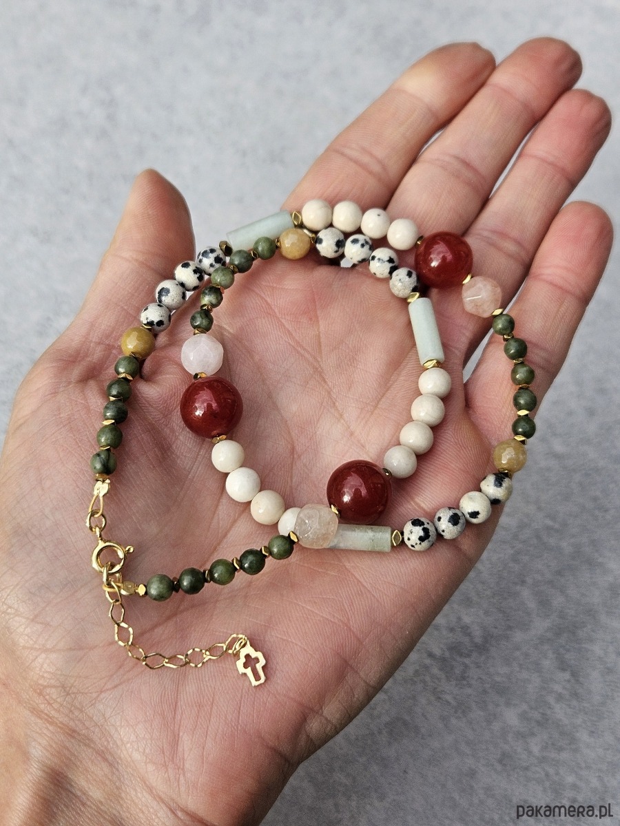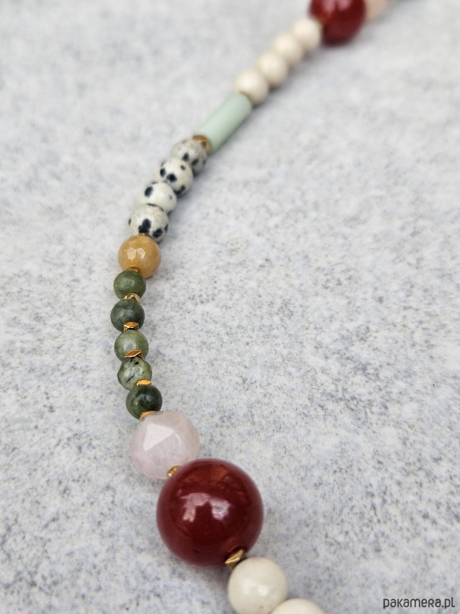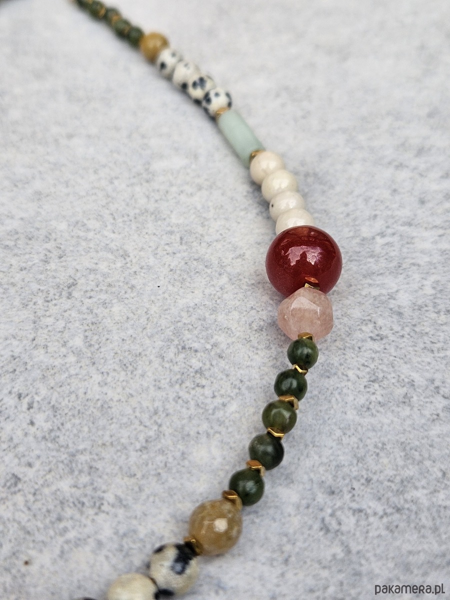 Naszyjnik pełen delikatności i mocy, stworzony z myślą o harmonii serca i ducha. Jego długość to 40 cm, a dzięki 3-centymetrowej przedłużce ze srebra złoconego możesz idealnie dopasować go do siebie. Zarówno zapięcie, jak i ozdobne wykończenie wykonane są z pozłacanego srebra, co nadaje mu szlachetnego blasku. Kompozycja składa się z fasetowanych i gładkich kamieni o średnicy od 2 do 12 mm: agat indyjski, zielony jadeit, jaspis dalmatyński, kwarc różowy, kamień słoneczny, amazonit, kamień rzeczny oraz hematyt. To biżuteria, która jest manifestacją miłości, radości i wewnętrznej równowagi. Kwarc różowy, kamień bezwarunkowej miłości, otula serce czułością i uzdrawia emocjonalne rany. Amazonit dodaje odwagi w wyrażaniu swoich myśli i uczuć, wspierając autentyczną komunikację. Kamień słoneczny wnosi do życia światło, optymizm i energię do działania, rozpraszając wszelkie smutki. Agat indyjski i jadeit wprowadzają harmonię, pomagając znaleźć spokój i stabilność w dynamicznym świecie. Radosną nutę wnosi jaspis dalmatyński, a kamień rzeczny i hematyt zapewniają solidne uziemienie i ochronę. Ten naszyjnik to Twój osobisty talizman, który przypomina, że prawdziwa siła płynie z otwartego serca i wewnętrznej równowagi.