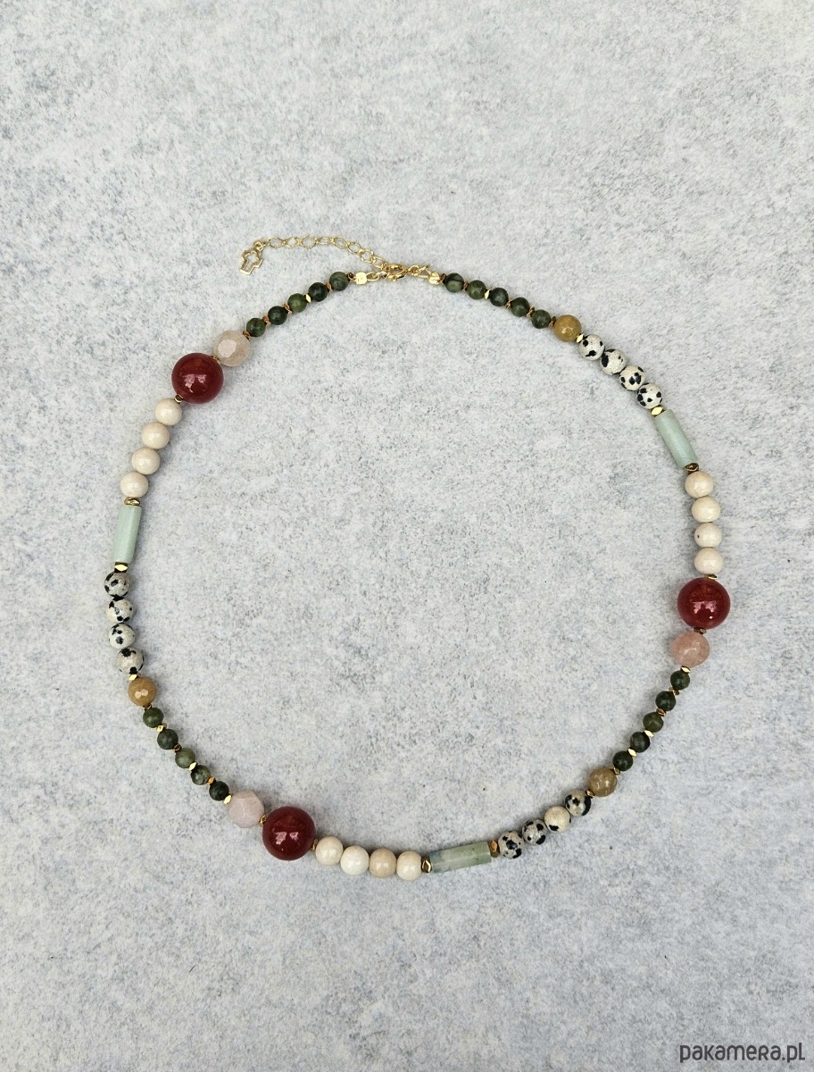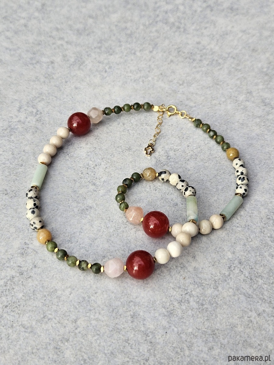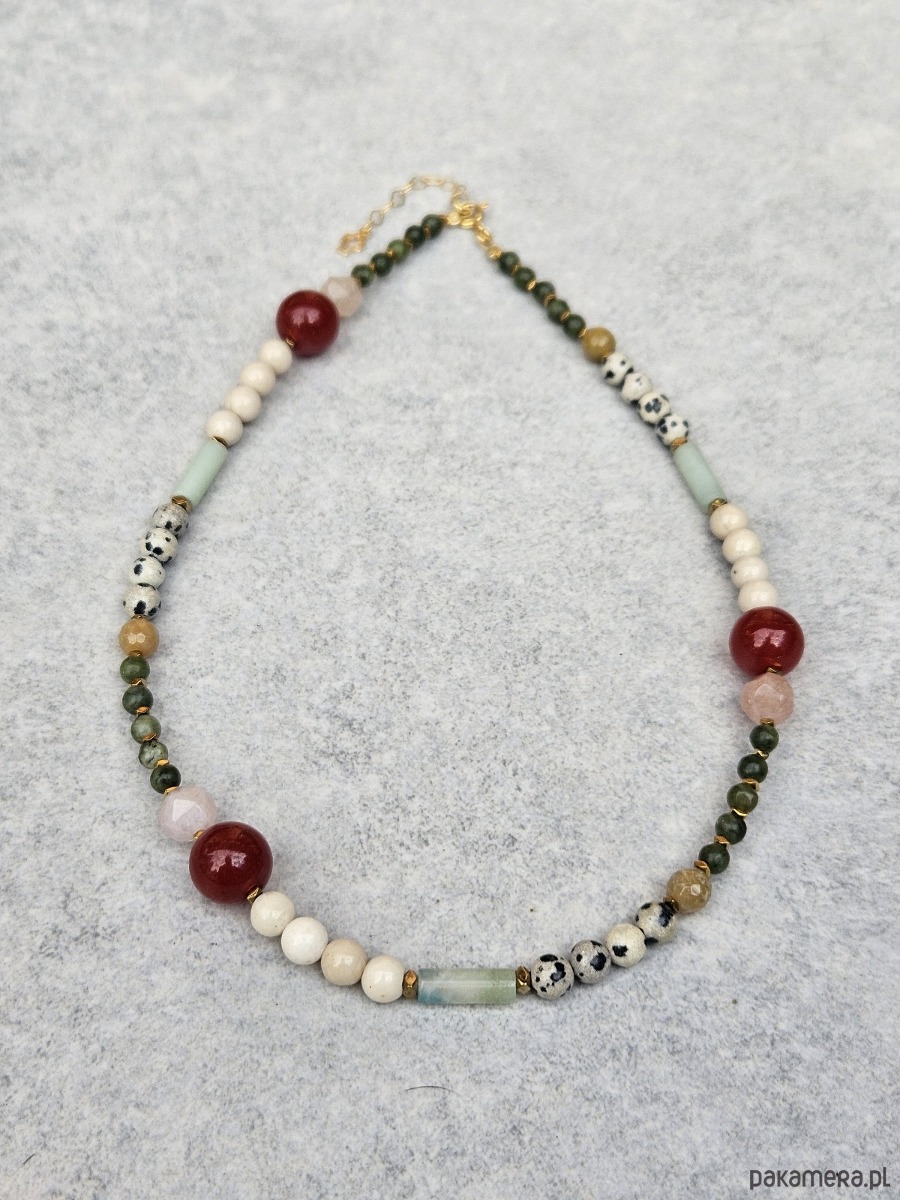 Naszyjnik pełen delikatności i mocy, stworzony z myślą o harmonii serca i ducha. Jego długość to 40 cm, a dzięki 3-centymetrowej przedłużce ze srebra złoconego możesz idealnie dopasować go do siebie. Zarówno zapięcie, jak i ozdobne wykończenie wykonane są z pozłacanego srebra, co nadaje mu szlachetnego blasku. Kompozycja składa się z fasetowanych i gładkich kamieni o średnicy od 2 do 12 mm: agat indyjski, zielony jadeit, jaspis dalmatyński, kwarc różowy, kamień słoneczny, amazonit, kamień rzeczny oraz hematyt. To biżuteria, która jest manifestacją miłości, radości i wewnętrznej równowagi. Kwarc różowy, kamień bezwarunkowej miłości, otula serce czułością i uzdrawia emocjonalne rany. Amazonit dodaje odwagi w wyrażaniu swoich myśli i uczuć, wspierając autentyczną komunikację. Kamień słoneczny wnosi do życia światło, optymizm i energię do działania, rozpraszając wszelkie smutki. Agat indyjski i jadeit wprowadzają harmonię, pomagając znaleźć spokój i stabilność w dynamicznym świecie. Radosną nutę wnosi jaspis dalmatyński, a kamień rzeczny i hematyt zapewniają solidne uziemienie i ochronę. Ten naszyjnik to Twój osobisty talizman, który przypomina, że prawdziwa siła płynie z otwartego serca i wewnętrznej równowagi.