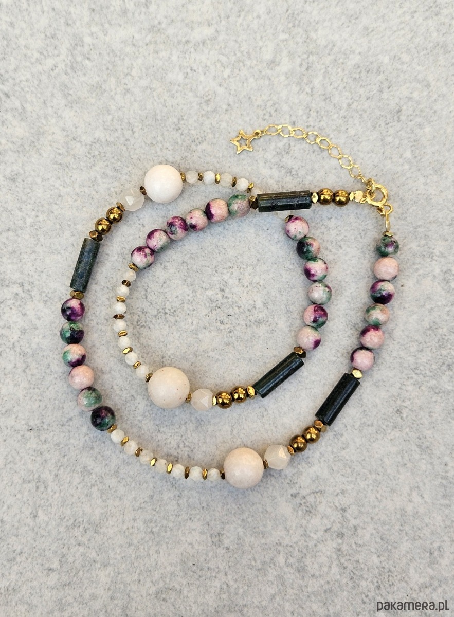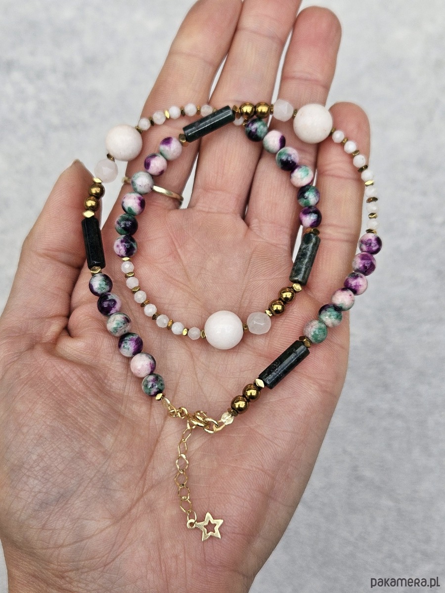 Zapraszam Cię do świata subtelnej, kobiecej energii z tym niezwykle eterycznym naszyjnikiem. Jego długość to 40 cm, a 3-centymetrowa przedłużka ze złoconego srebra pozwala na idealne dopasowanie. Zapięcie i ozdobne detale, wykonane z tego samego kruszcu, podkreślają jego delikatny charakter. Sercem tej biżuterii są kamienie o średnicy od 2 do 12 mm, emanujące łagodnością i miłością: magiczny kamień księżycowy, harmonizujący agat indyjski, spokojny jadeit oraz pełen ciepła kwarc różowy. To naszyjnik, który jest hołdem dla kobiecej intuicji, łagodności i wewnętrznej mądrości. Kamień księżycowy, z jego mistyczną poświatą, łączy z cyklami natury, wzmacnia intuicję i pomaga odkryć drzemiącą w Tobie moc. Kwarc różowy, znany jako kamień bezwarunkowej miłości, otwiera serce na przyjmowanie i dawanie uczuć, leczy emocjonalne rany i wprowadza w stan głębokiego spokoju. Jadeit to symbol harmonii i dobrobytu, który przyciąga do życia szczęście i przyjaźń, jednocześnie chroniąc przed złą energią. Agat indyjski natomiast wprowadza równowagę emocjonalną, pomaga zaakceptować siebie i dodaje siły w trudniejszych chwilach. Noszenie tej kompozycji to jak otulenie się delikatnym, uzdrawiającym woalem, który wspiera Twoją kobiecą naturę i pozwala jej w pełni rozkwitnąć.