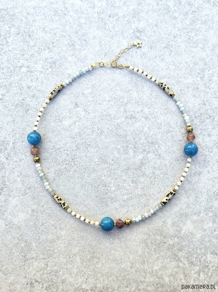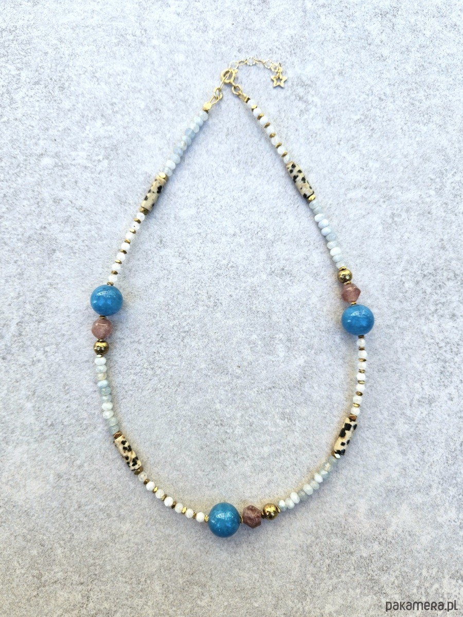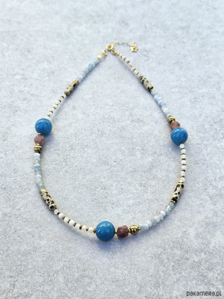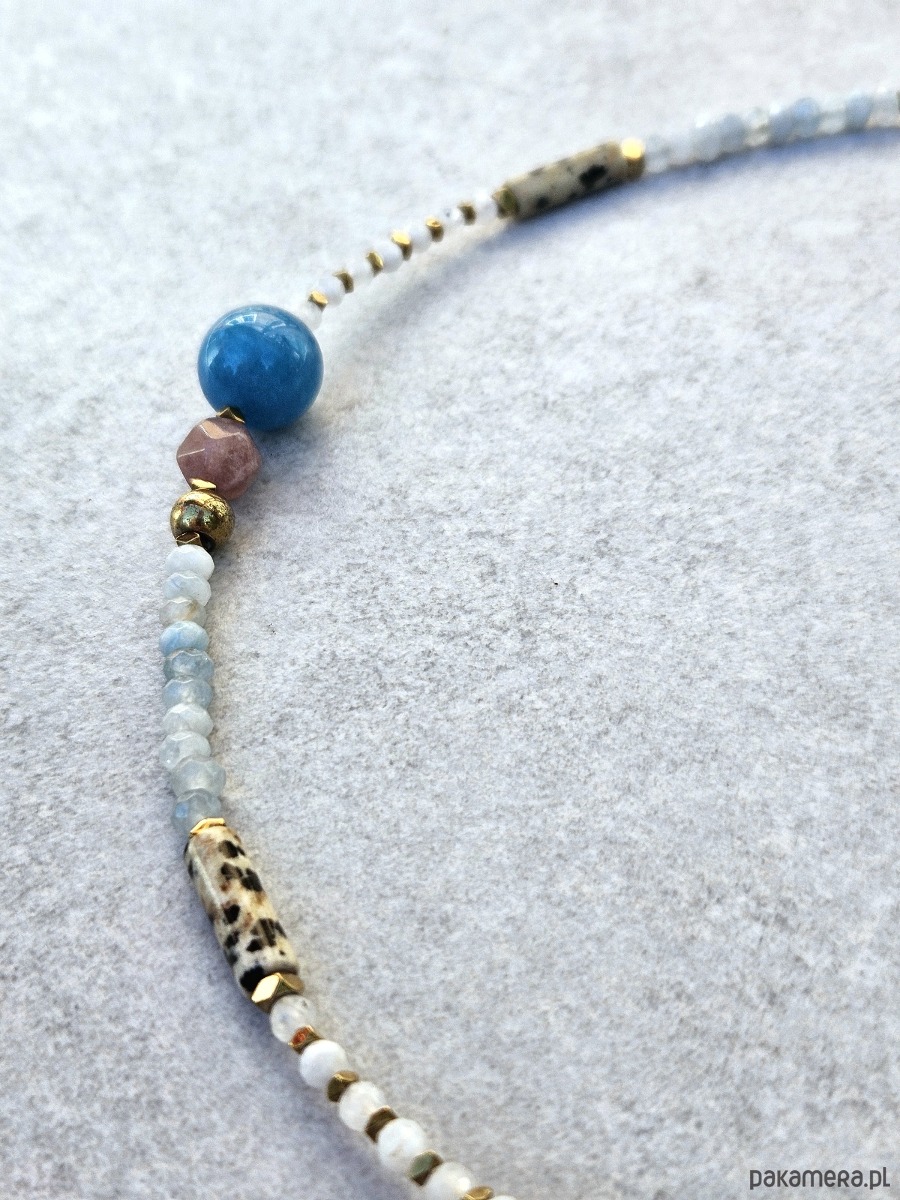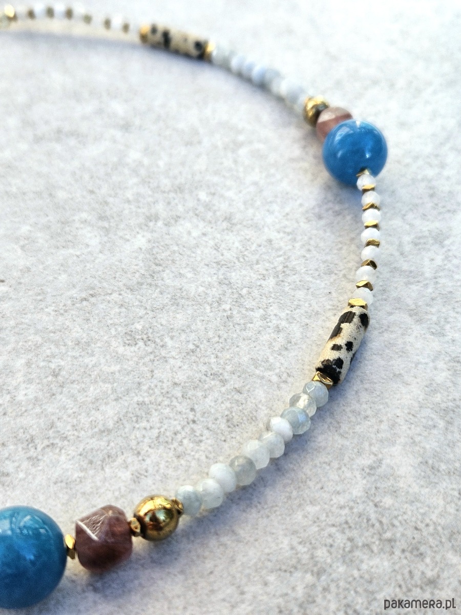 Naszyjnik wykonany z pozłacanego srebra 925. Długość: 40 cm + 3 cm przedłużka. Kamienie (kule gładkie i fasetowane, 2-12 mm): kamień księżycowy, kamień słoneczny, jadeit, jaspis dalmatyński, hematyt.