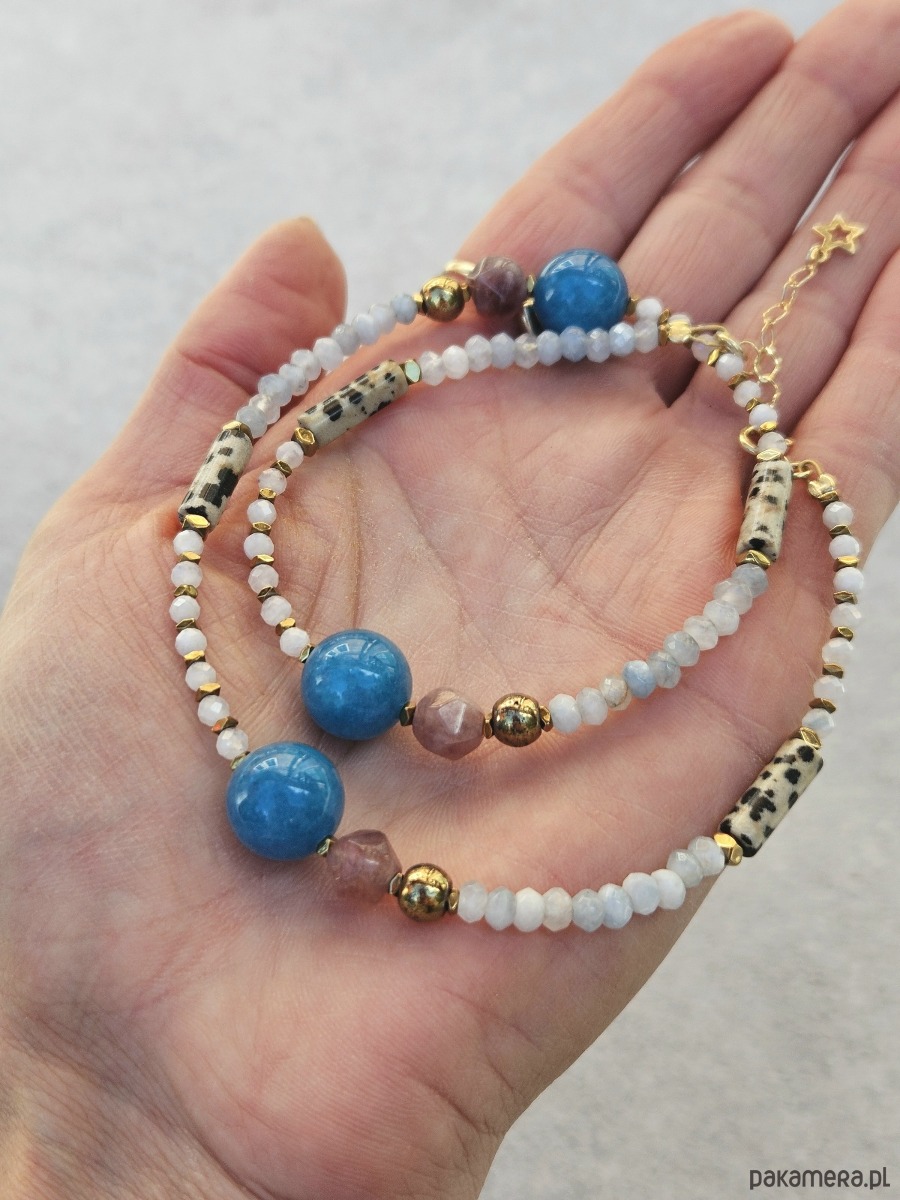 Naszyjnik wykonany z pozłacanego srebra próby 925 o długości 40 cm z 3 cm przedłużką, w którym przeplatają się fasetowane i gładkie kule kamienia księżycowego, kamienia słonecznego, jadeitu, jaspisu dalmatyńskiego oraz hematytu (2-12 mm). To biżuteria z intencją, która łączy w sobie energię Słońca i Księżyca, stając się Twoim osobistym kompasem na ścieżkach codzienności. Kamień słoneczny dodaje odwagi, kamień księżycowy wspiera intuicję, jadeit wnosi harmonię, jaspis dalmatyński uczy radości z małych rzeczy, a hematyt zapewnia mocne uziemienie.