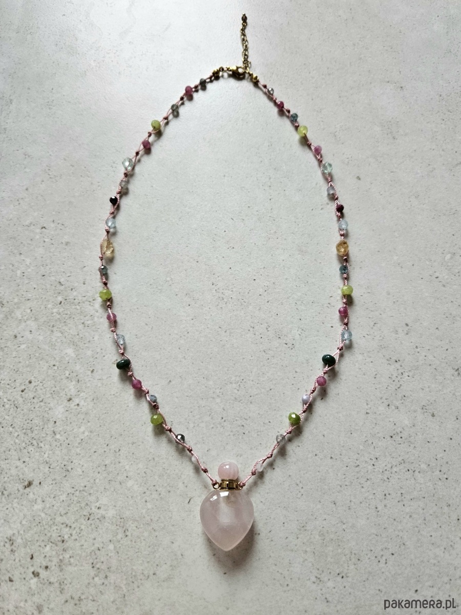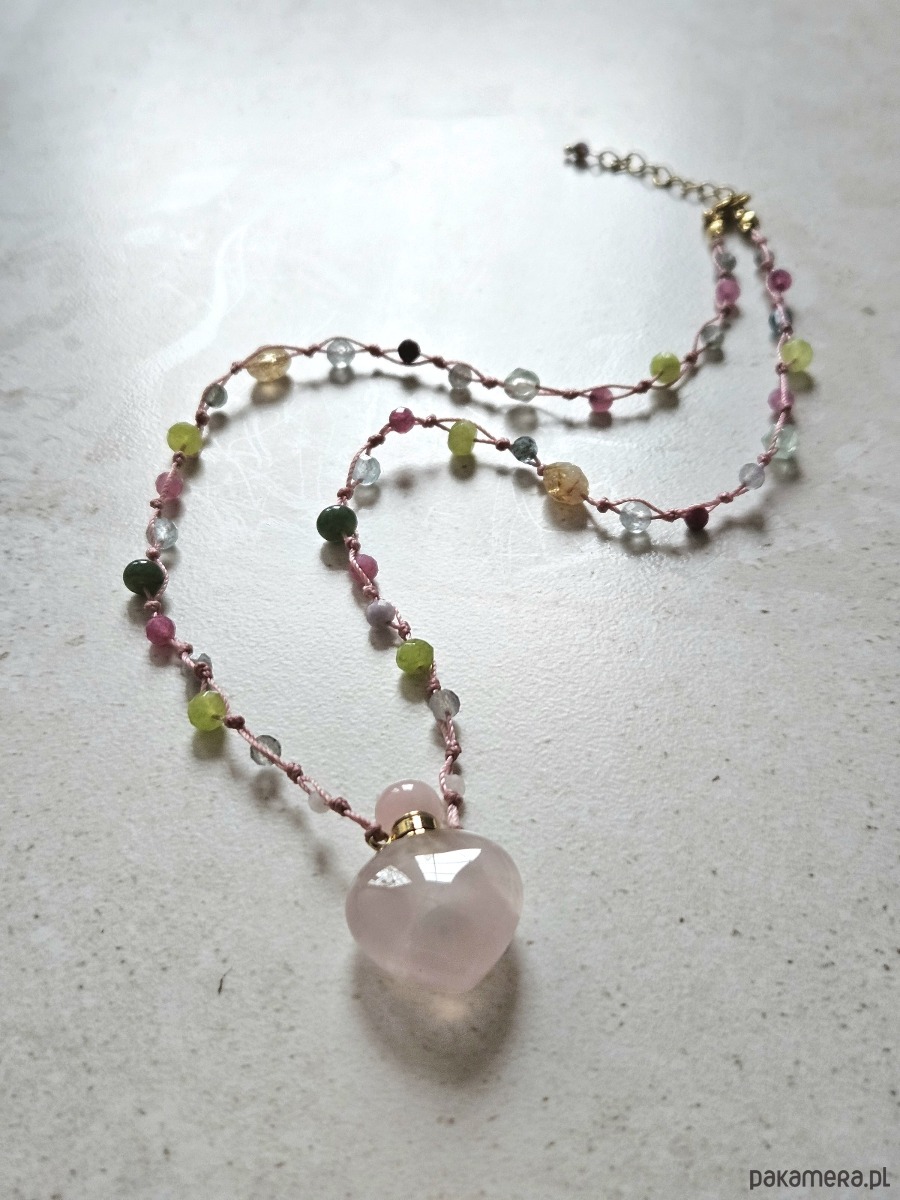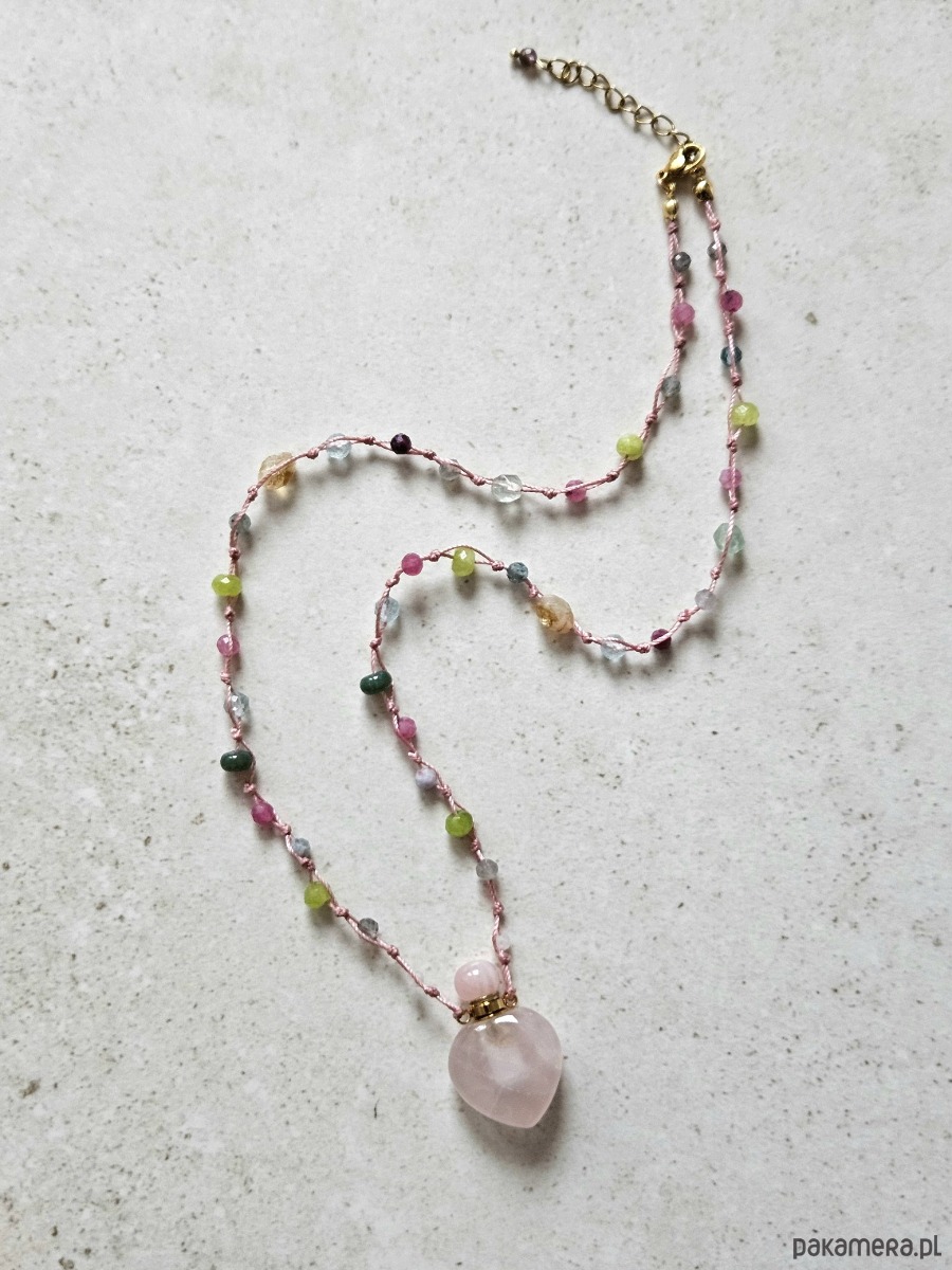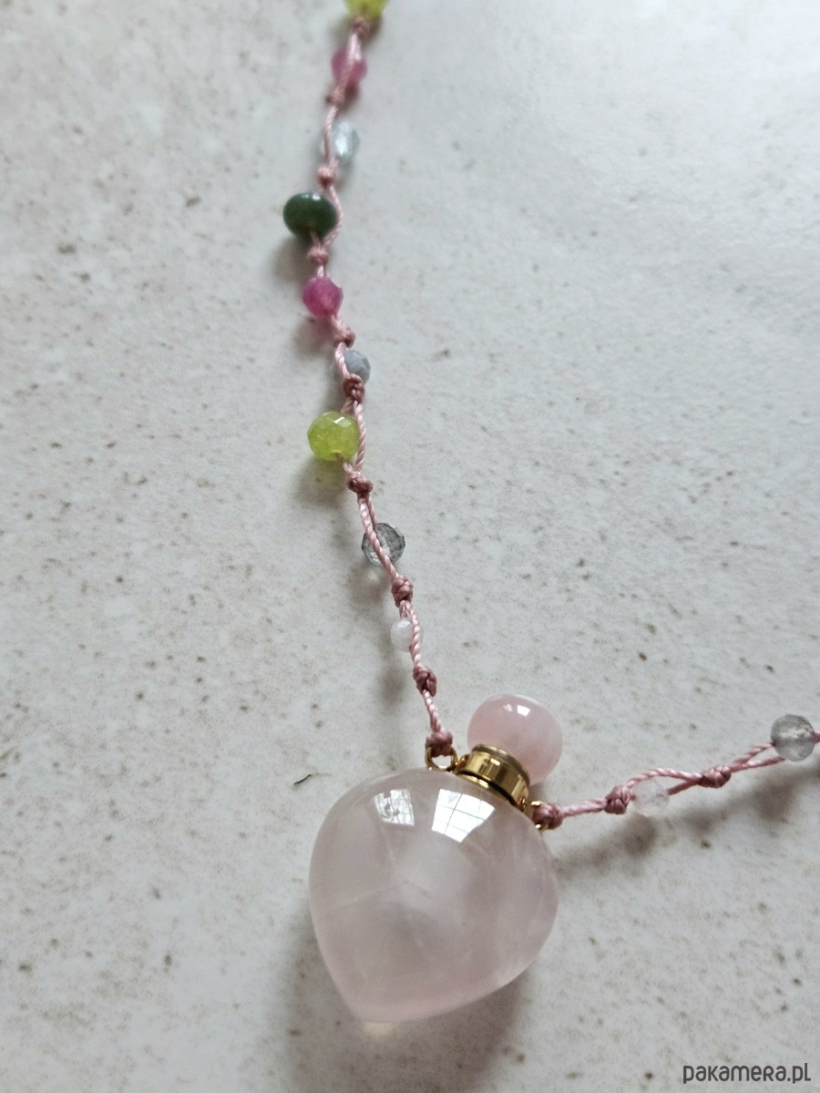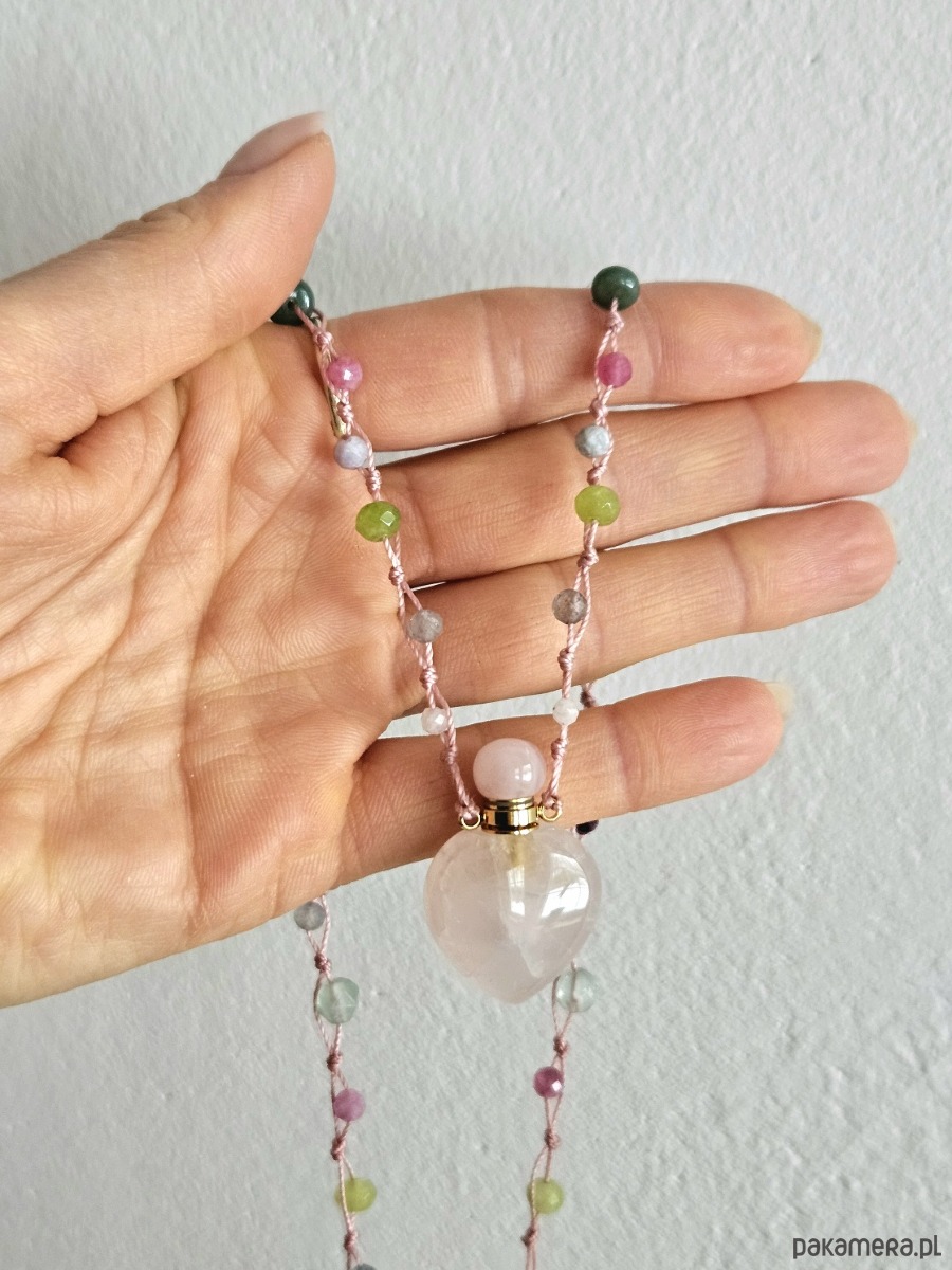 Naszyjnik o długości 51 cm został wykonany na wytrzymałej różowej nitce nylonowej z przedłużką 5 cm i zapięciem ze stali szlachetnej. Sercem projektu jest odkręcana perfumetka z kwarcu różowego, otoczona fasetowanymi kulkami takich minerałów jak cytryn, kamień księżycowy, turmalin różowy, topaz, akwamaryn, jadeit, labradoryt oraz granat.