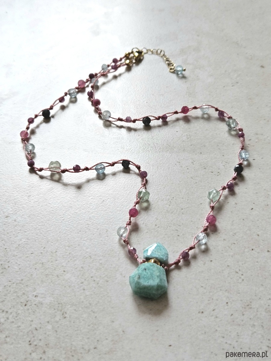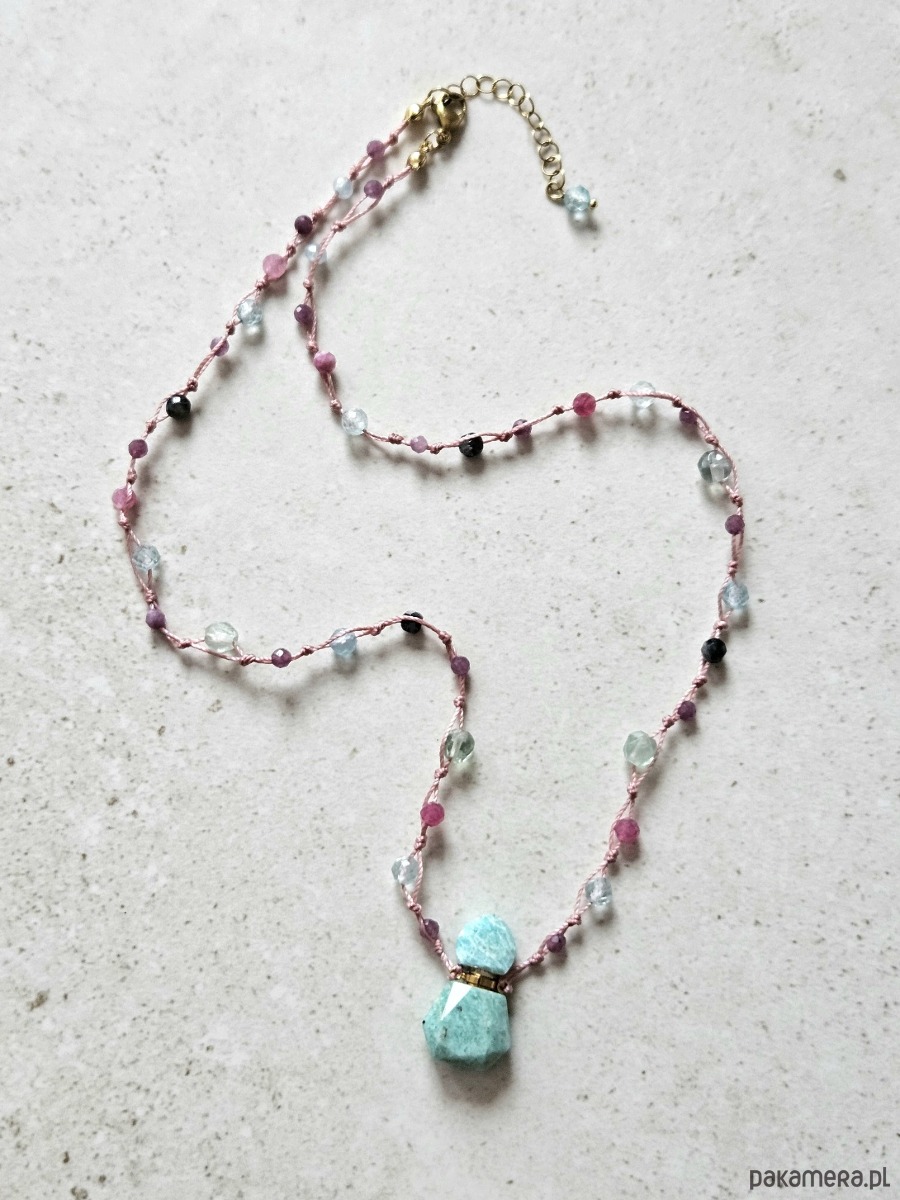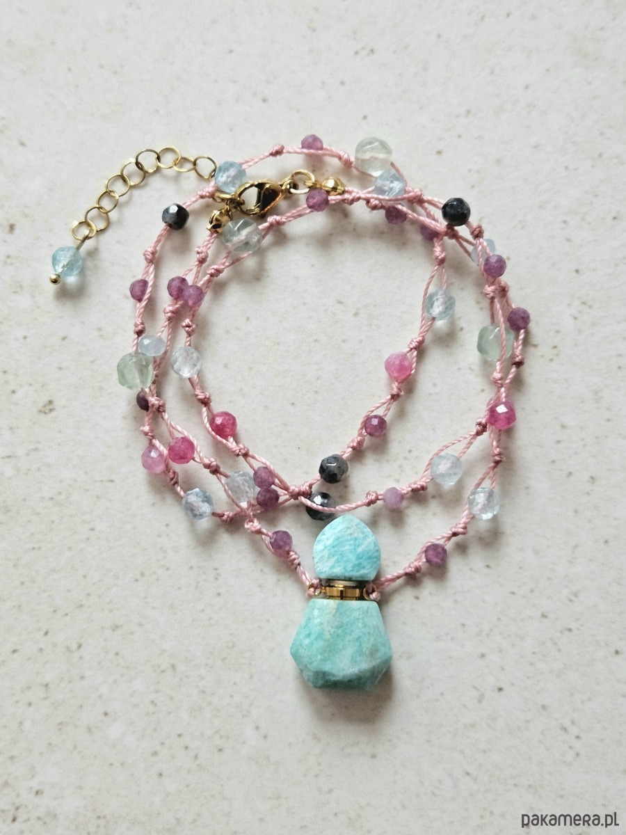 Ręcznie supełkowany naszyjnik o długości 50 cm, zdobiony fasetowaną perfumetką z amazonitu, to symbol wolności i autentyczności. Kompozycja obejmuje fasetowane kule ametystu, topazu, fluorytu, czarnego labradorytu, turmalinu różowego oraz jadeitu, nawleczone na różową nić z przedłużką 5 cm.