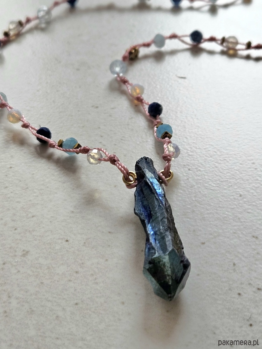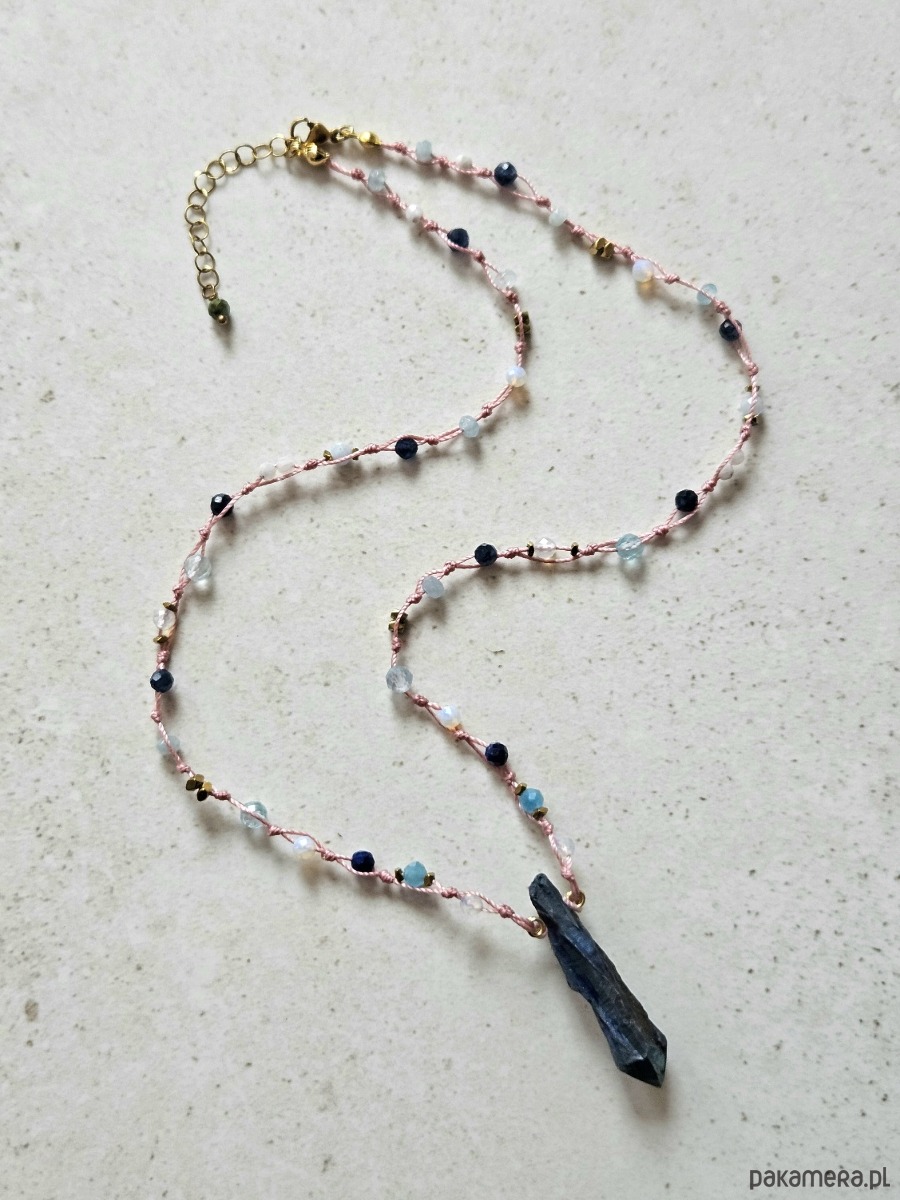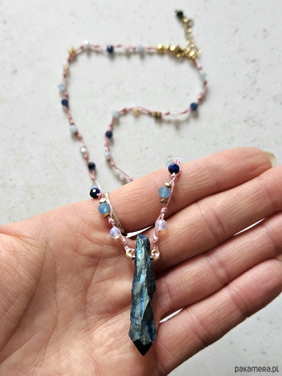 Naszyjnik o długości 52 cm z imponującym kwarcem tytanowym to propozycja dla kobiet ceniących głębię i mistycyzm. Wykonany techniką supełkowania na różowej nici, zawiera fasetowane kule lapis lazuli, akwamarynu, topazu, kamienia księżycowego oraz opalitu.