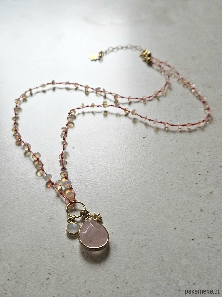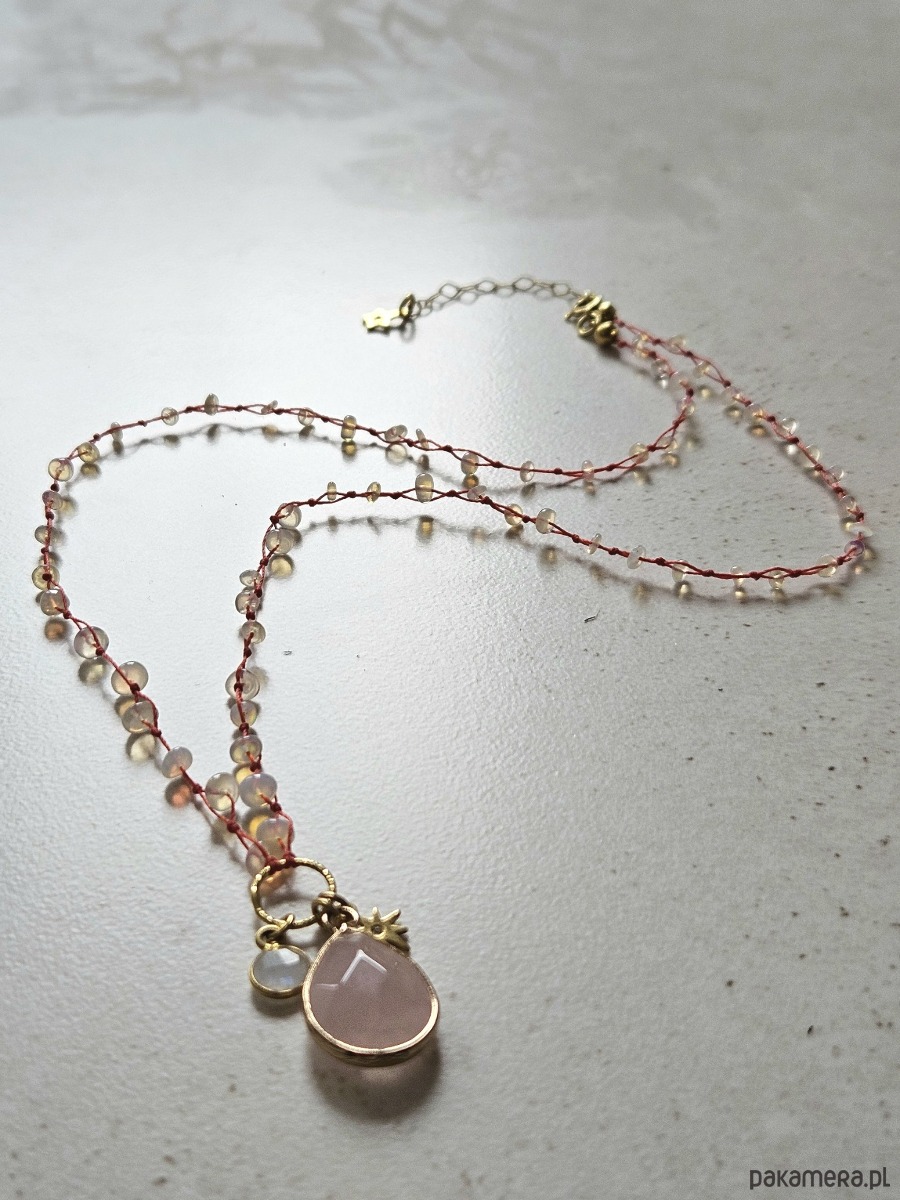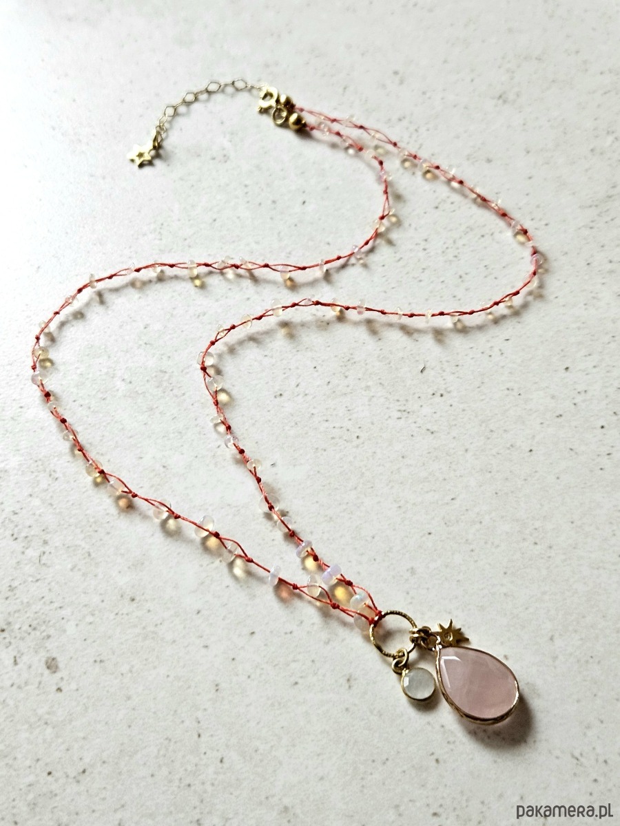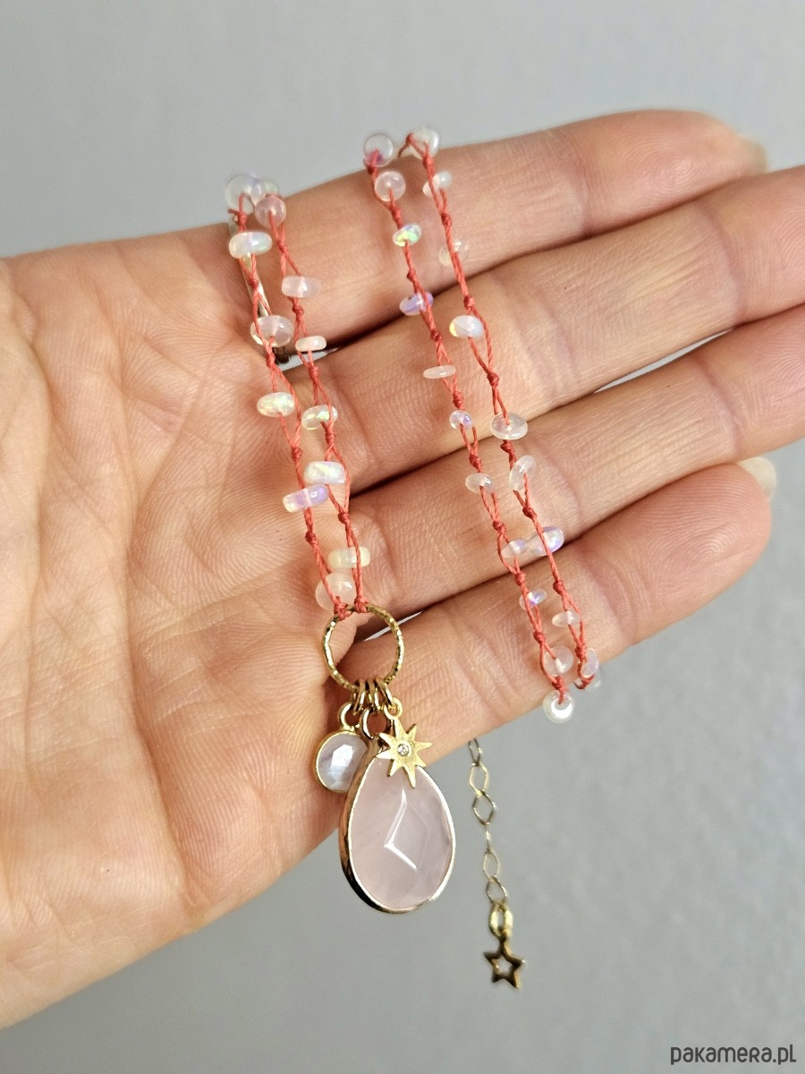Przepiękny naszyjnik o długości 55,5 cm, misternie supełkowany na czerwonej nici, prezentuje hipnotyzujące opale etiopskie. Projekt dopełniają zawieszki: kwarc różowy w oprawie, złocona gwiazdka oraz kamień księżycowy . Wykonany z najwyższej jakości srebra 925 złoconego.