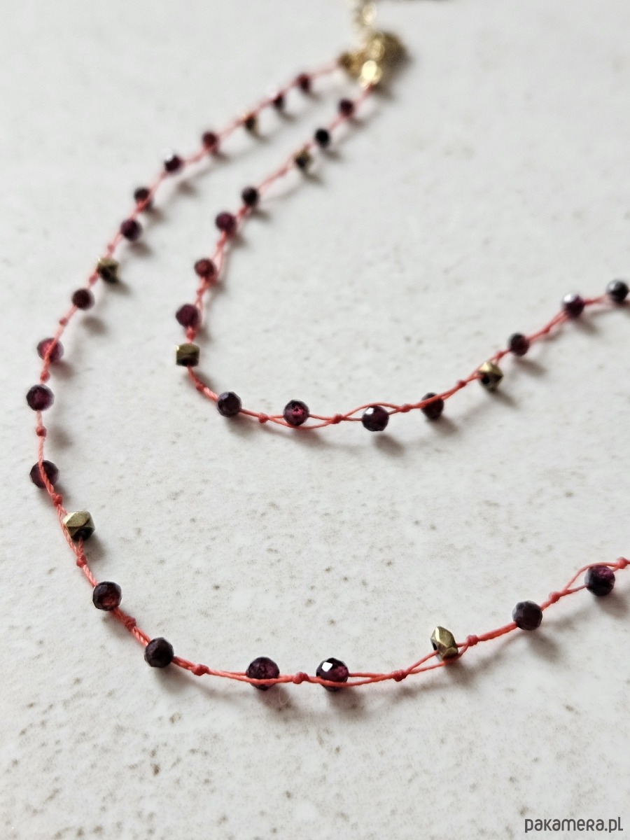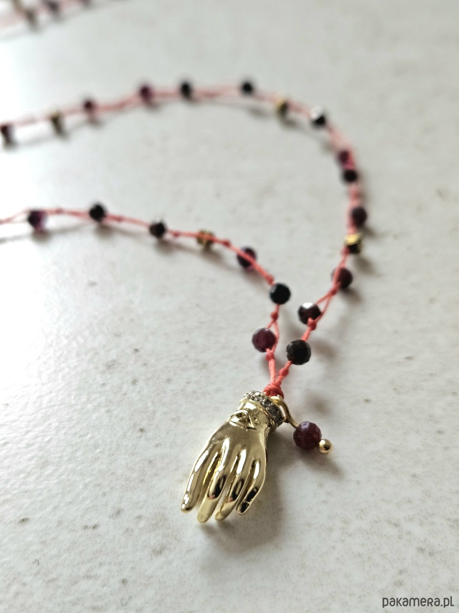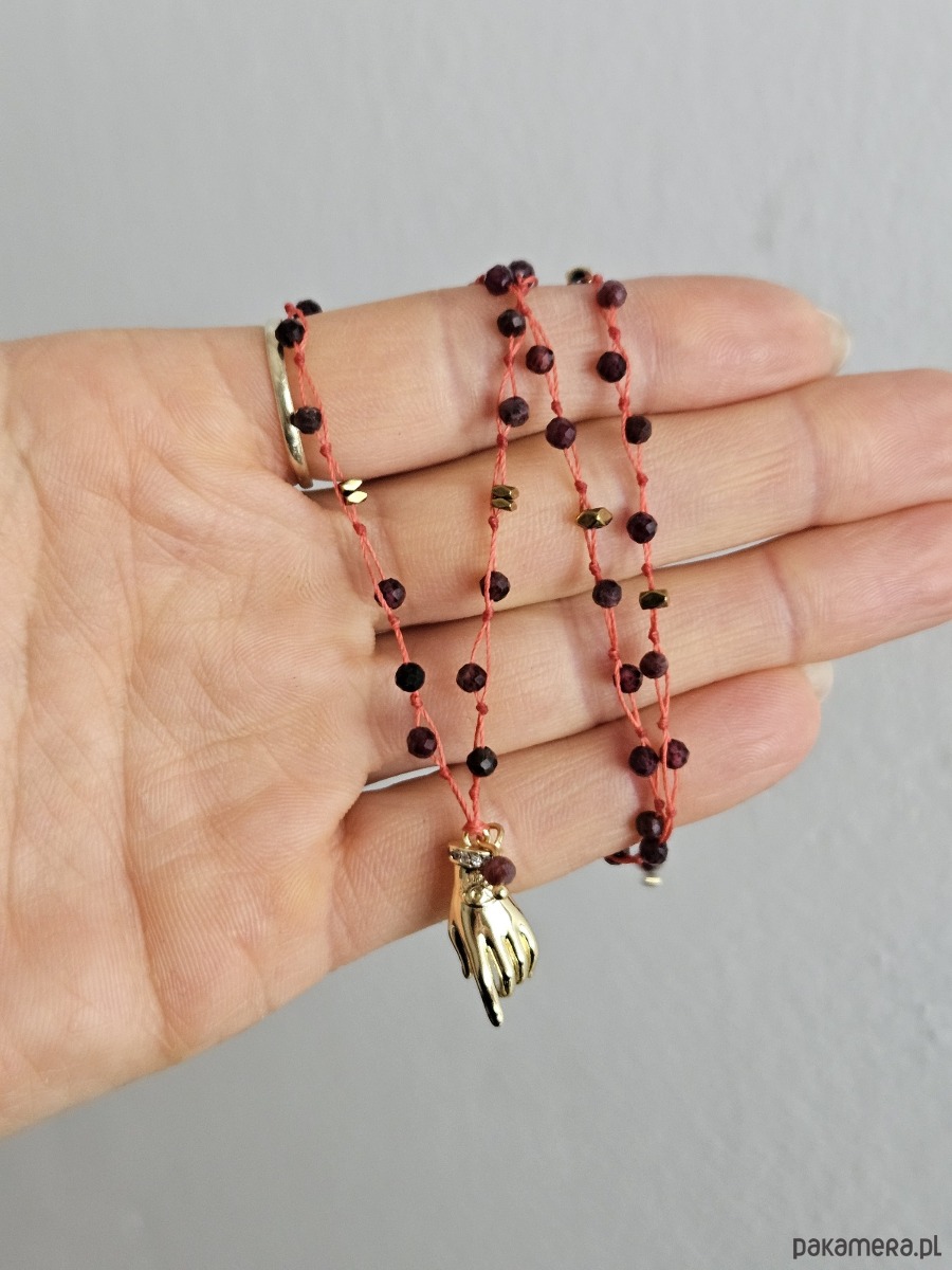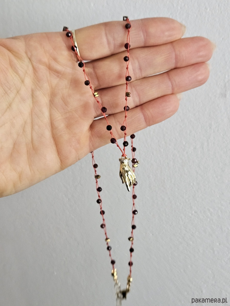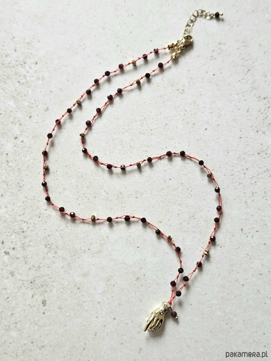 Ten wyjątkowy naszyjnik o długości 52,5 cm to amulet stworzony z okazji Roku Ognistego Konia. Wykonany na ochronnej czerwonej nitce, zdobiony zawieszką w kształcie dłoni wskazującej oraz fasetowanymi granatami i złotym hematytem.