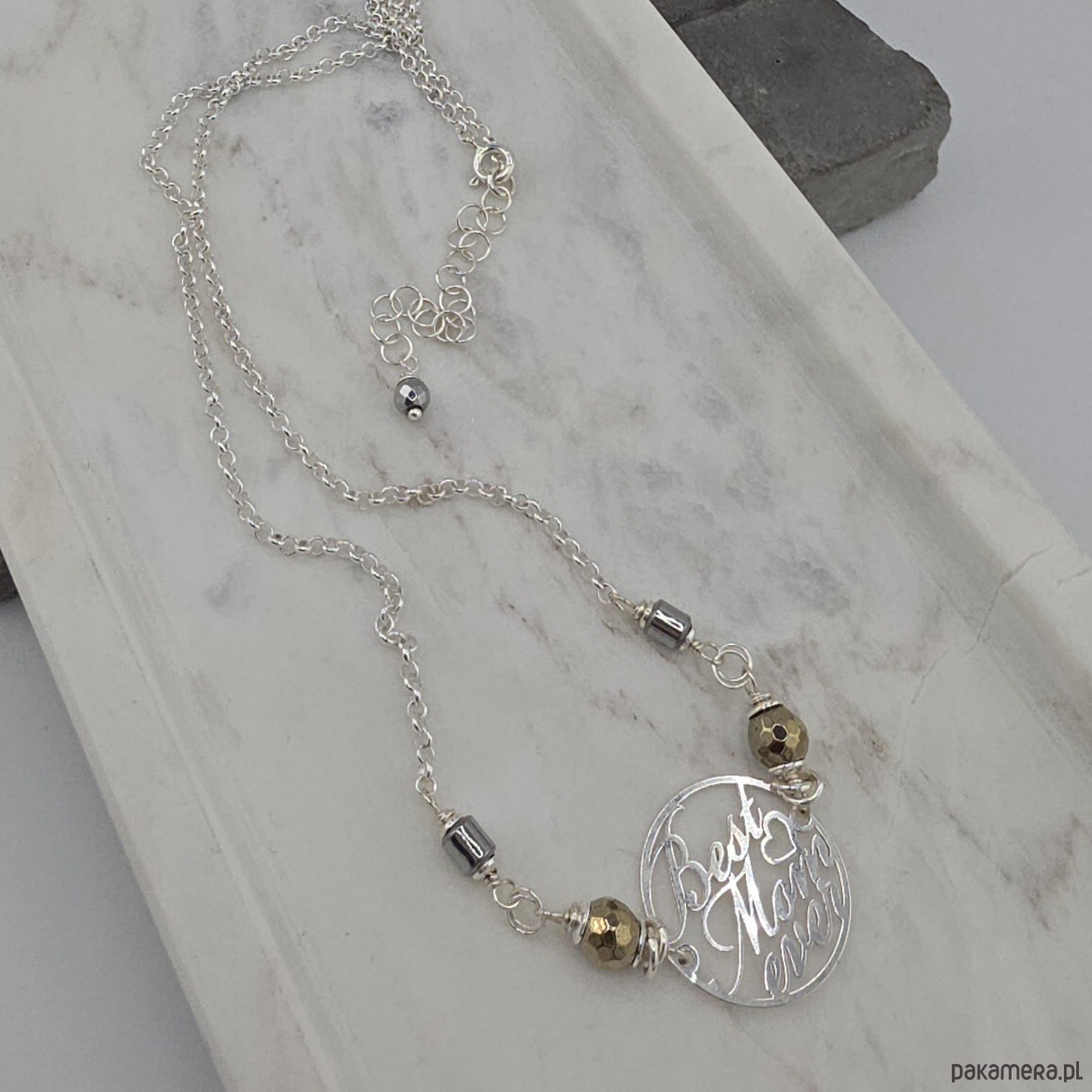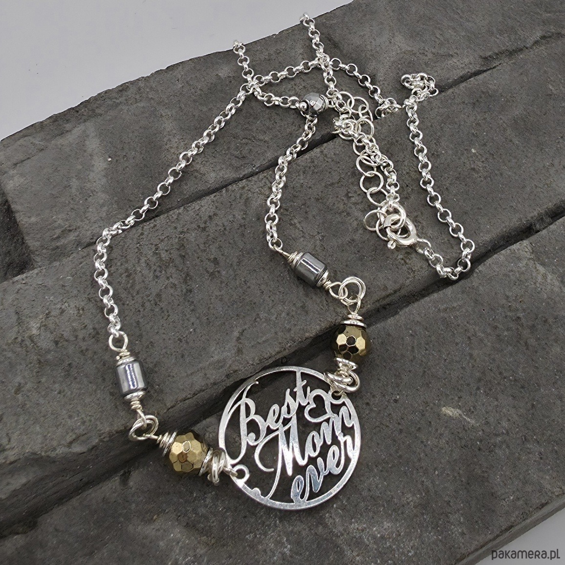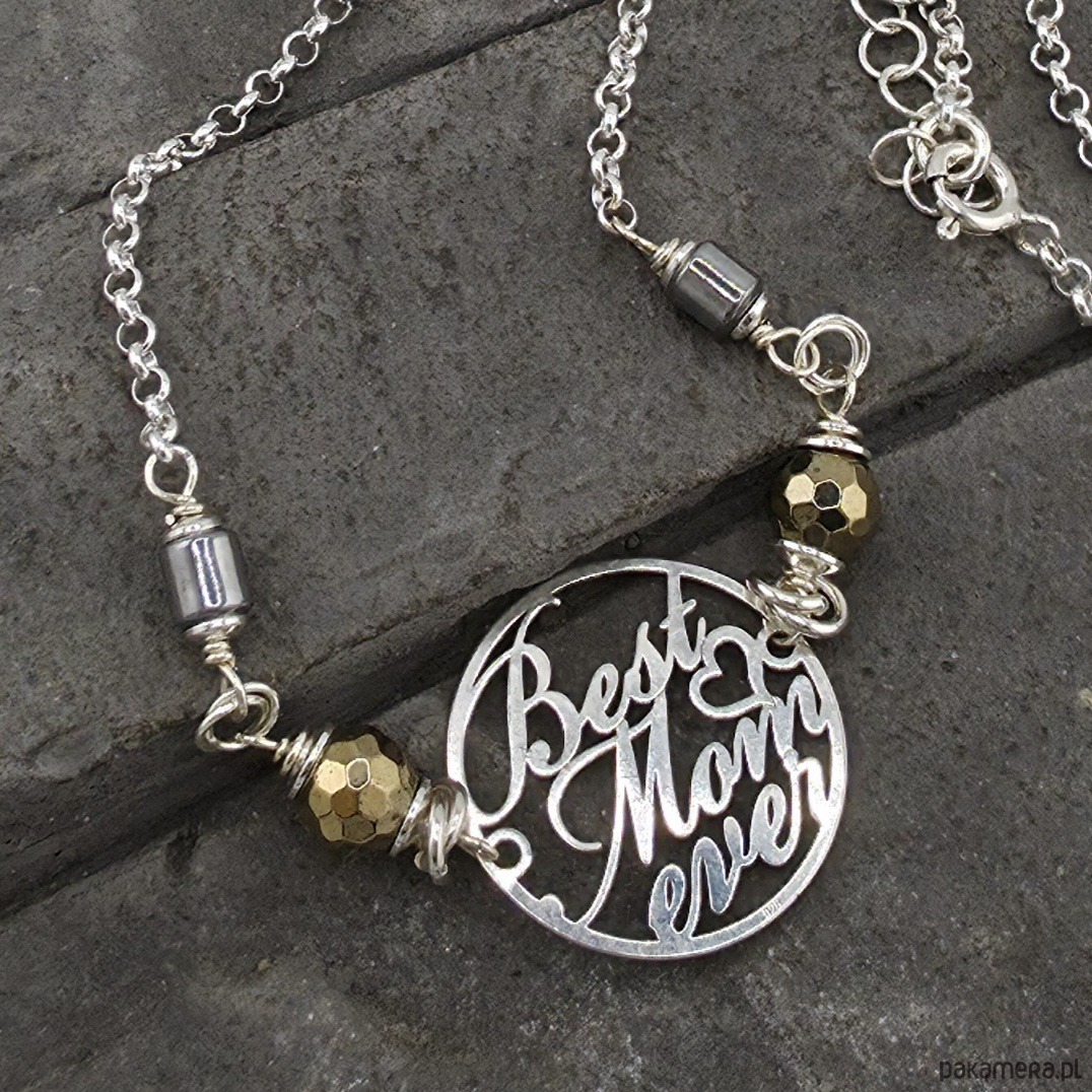 Kobiecy, wyjątkowy naszyjnik dla mamy 'best mom ever'. Wykonany w całości ze srebra próby 925 oraz złotych i srebrnych hematytów wielkości ok. 5 i 6 mm. Średnica blaszki z napisem to 2 cm . Całkowita długość naszyjnika to ok. 45 cm plus 5 cm przedłużki. Na życzenie mogę go zoksydować lub wykonać z innymi kamieniami. W mojej galerii jest dostępna podobna bransoletka. Ozdobnie zapakowany.