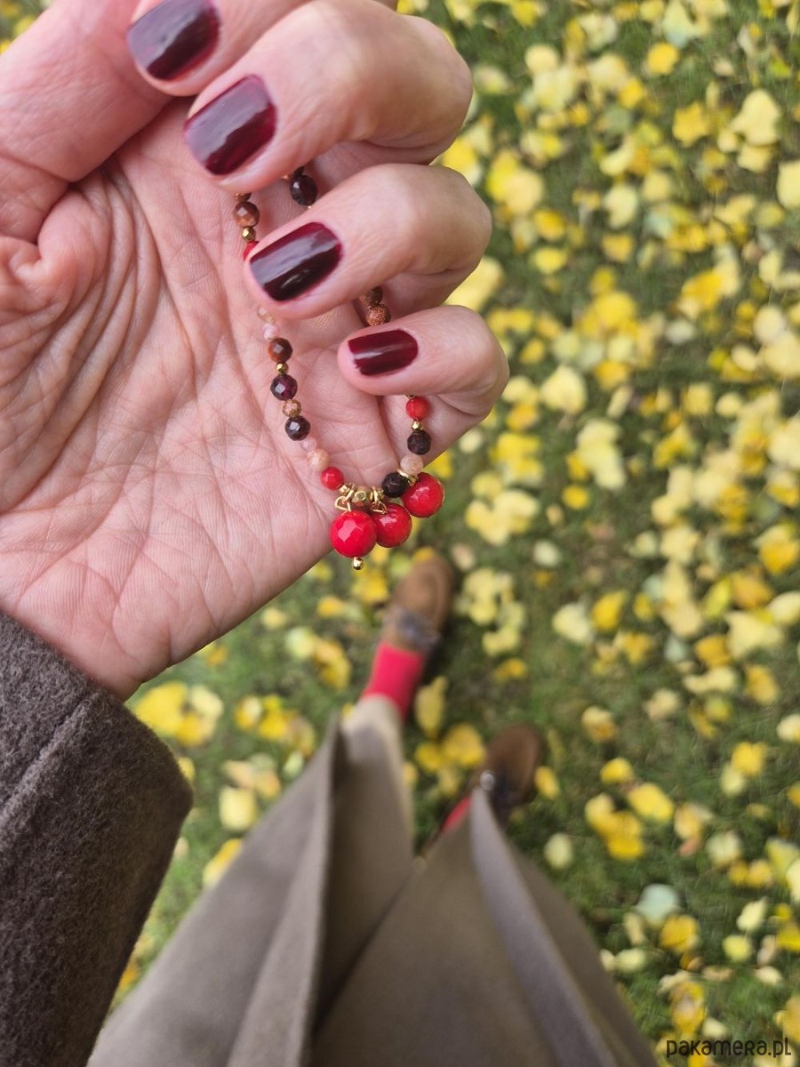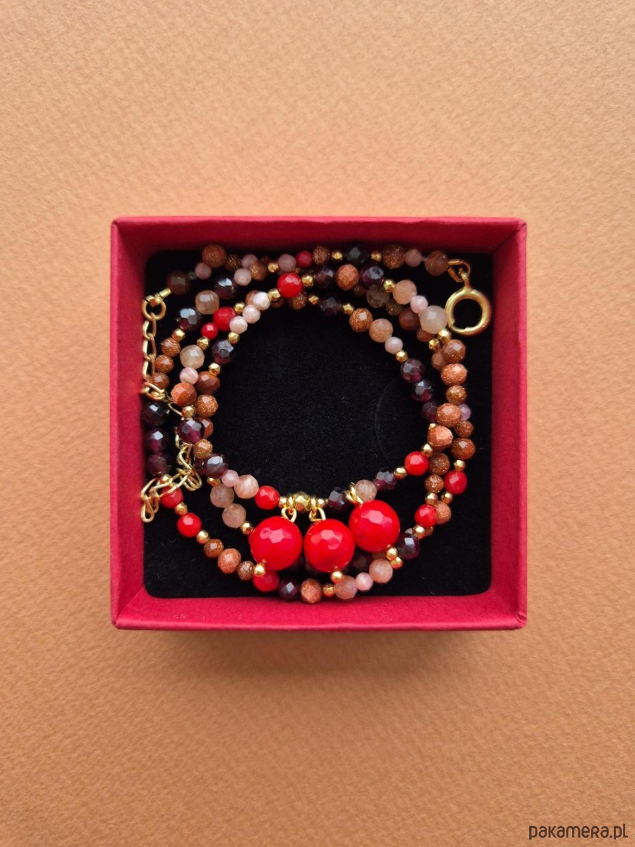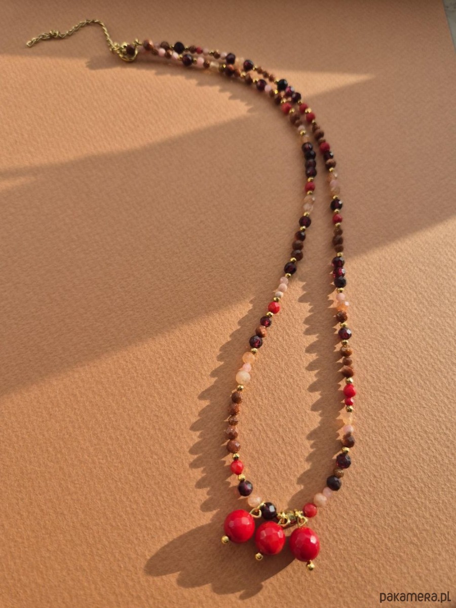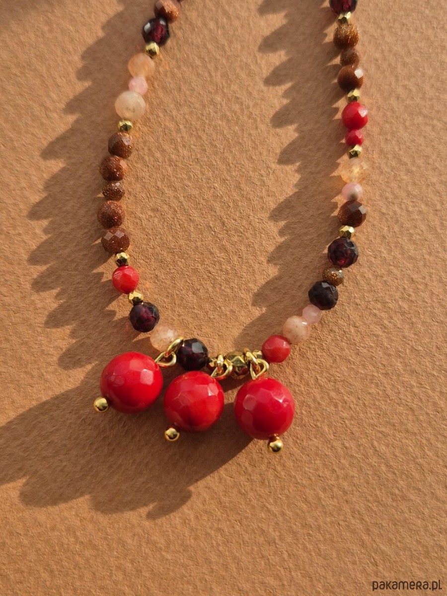 🤎 Ręcznie wykonany z naturalnych kamieni: bordowych granatów, ciepłego piasku pustyni, subtelnie połyskujących kamieni słonecznych w odcieniach różu i pomarańczy oraz intensywnie czerwonych korali.