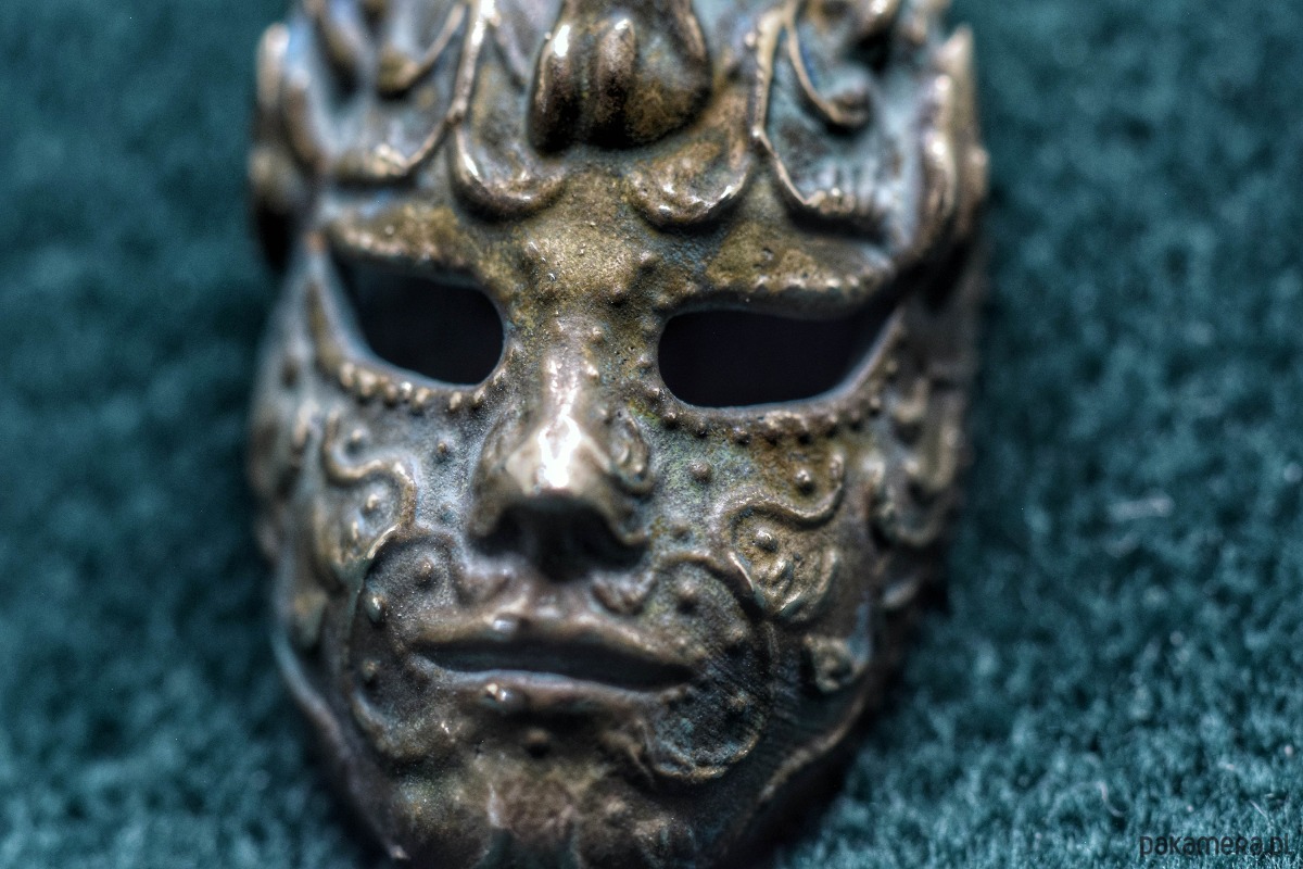 Naszyjnik na naturalnych kamieniach z wisiorkiem z projektu "To nie jest karnawał" odlanym z brązu. Pokryty zieloną patyną. Kamienie to turkus afrykański przeplatany od czasu do czasu hematytem.