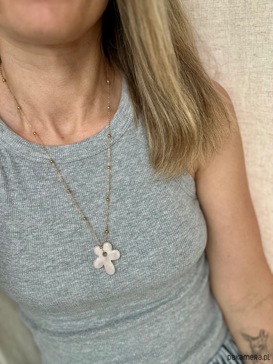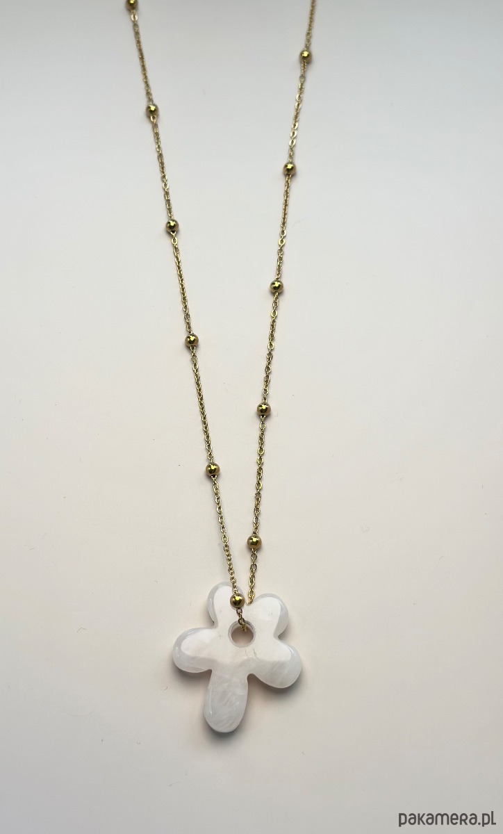 Łańcuszek z delikatnego długiego łańcucha przekładanego kuleczkami , z pięknym kamiennym wisiorem kwiatem.