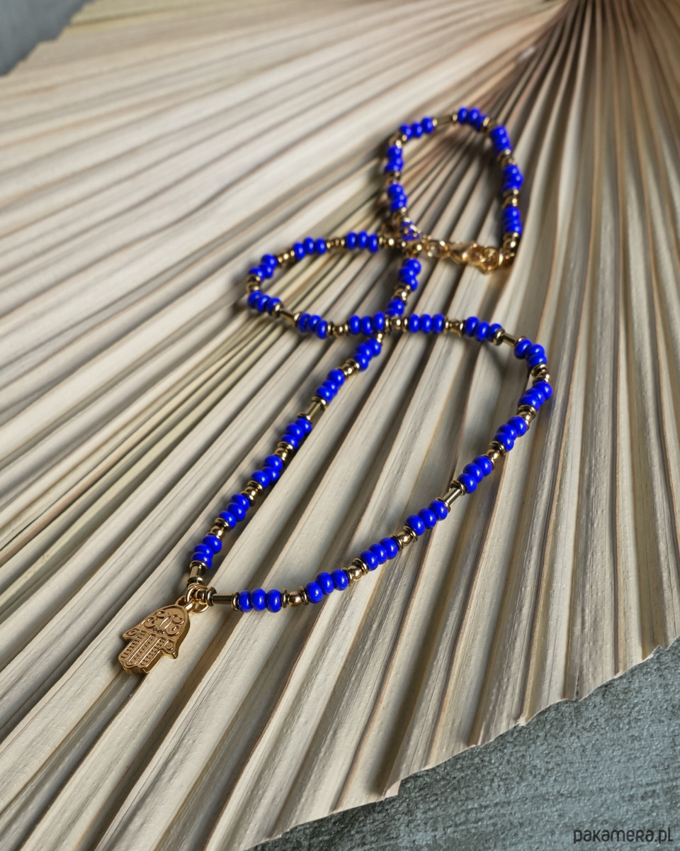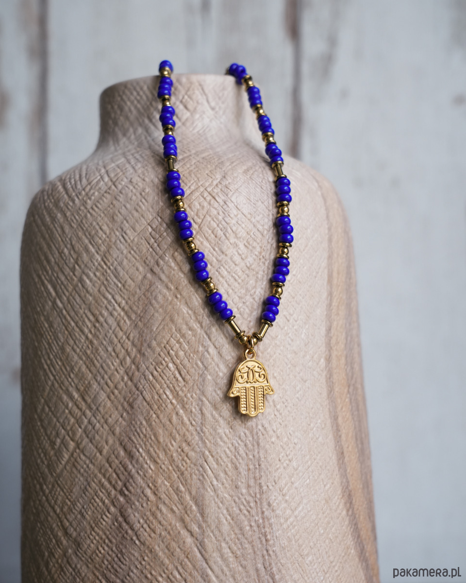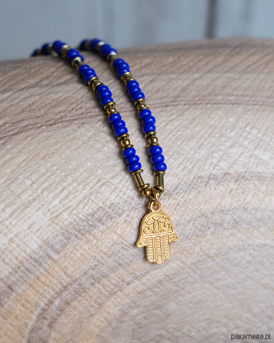 Naszyjnik w intensywnym, kobaltowym kolorze, wykonany ze SZKLANYCH KORALIKÓW i złotego HEMATYTU. Gruba zawieszka z Hamsą/Ręką Fatimy wykonana jest ze STALI SZLACHETNEJ w kolorze złotym. Zapięcie i łańcuszek to również stal szlachetna.