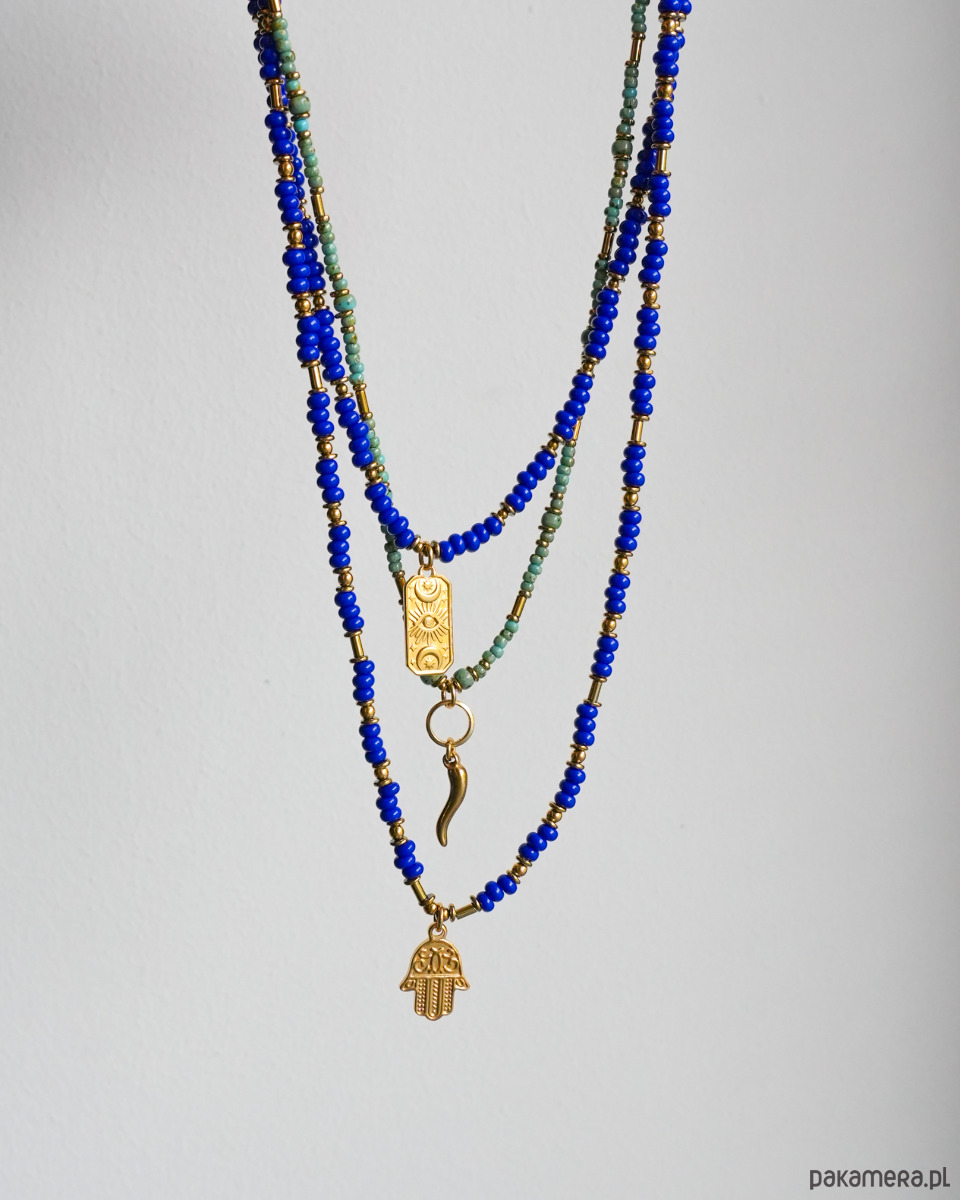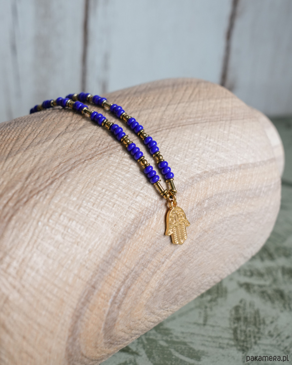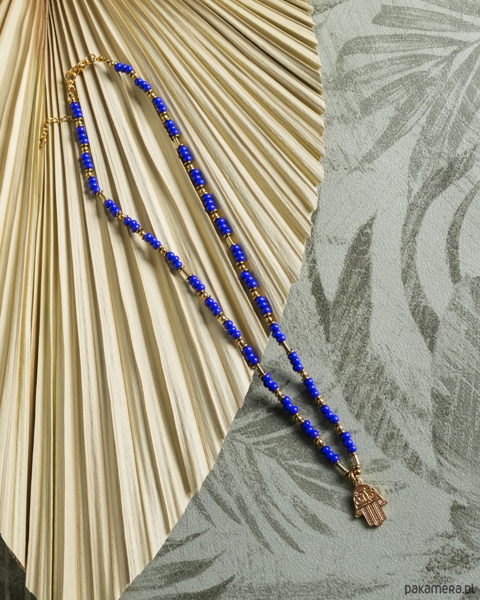 Naszyjnik w intensywnym, kobaltowym kolorze, wykonany ze SZKLANYCH KORALIKÓW i złotego HEMATYTU. Gruba zawieszka z Hamsą/Ręką Fatimy wykonana jest ze STALI SZLACHETNEJ w kolorze złotym. Zapięcie i łańcuszek to również stal szlachetna.