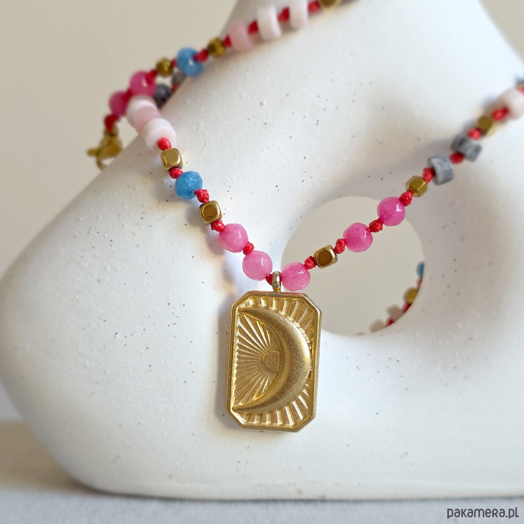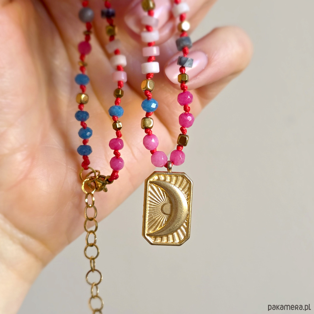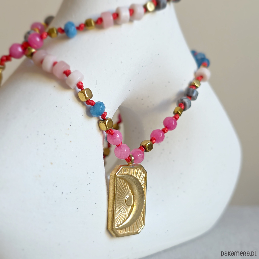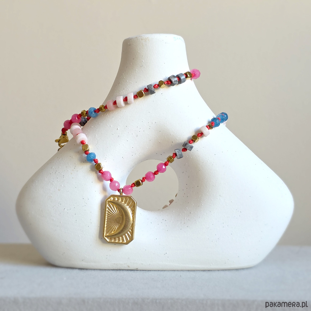 Ten unikatowy naszyjnik to spokojna, harmonijna kompozycja naturalnych kamieni osadzonych na czerwonym sznurku, który dodaje całości subtelnej wyrazistości i elegancji. Połączenie agatu, opalu różowego, jaspisu szarego i hematytu tworzy biżuterię o wyciszającej, miękkiej energii – idealną, gdy chcesz zwolnić i wrócić do siebie. Centralna zawieszka w kształcie prostokąta z wpisanym księżycem podkreśla intuicyjny, kobiecy charakter naszyjnika. To symbol cykliczności, wewnętrznego świata i życia w zgodzie z własnym rytmem.