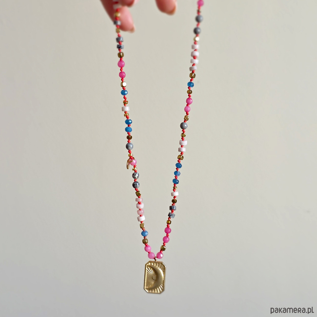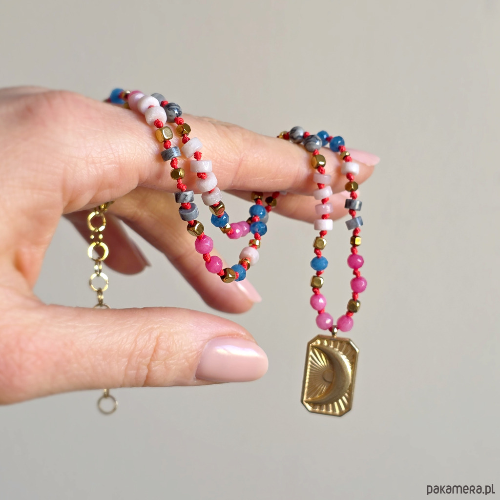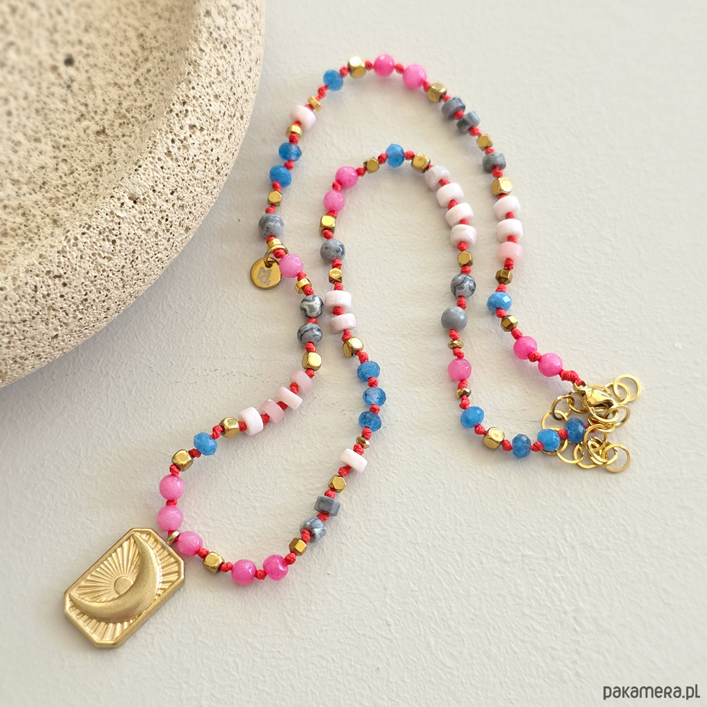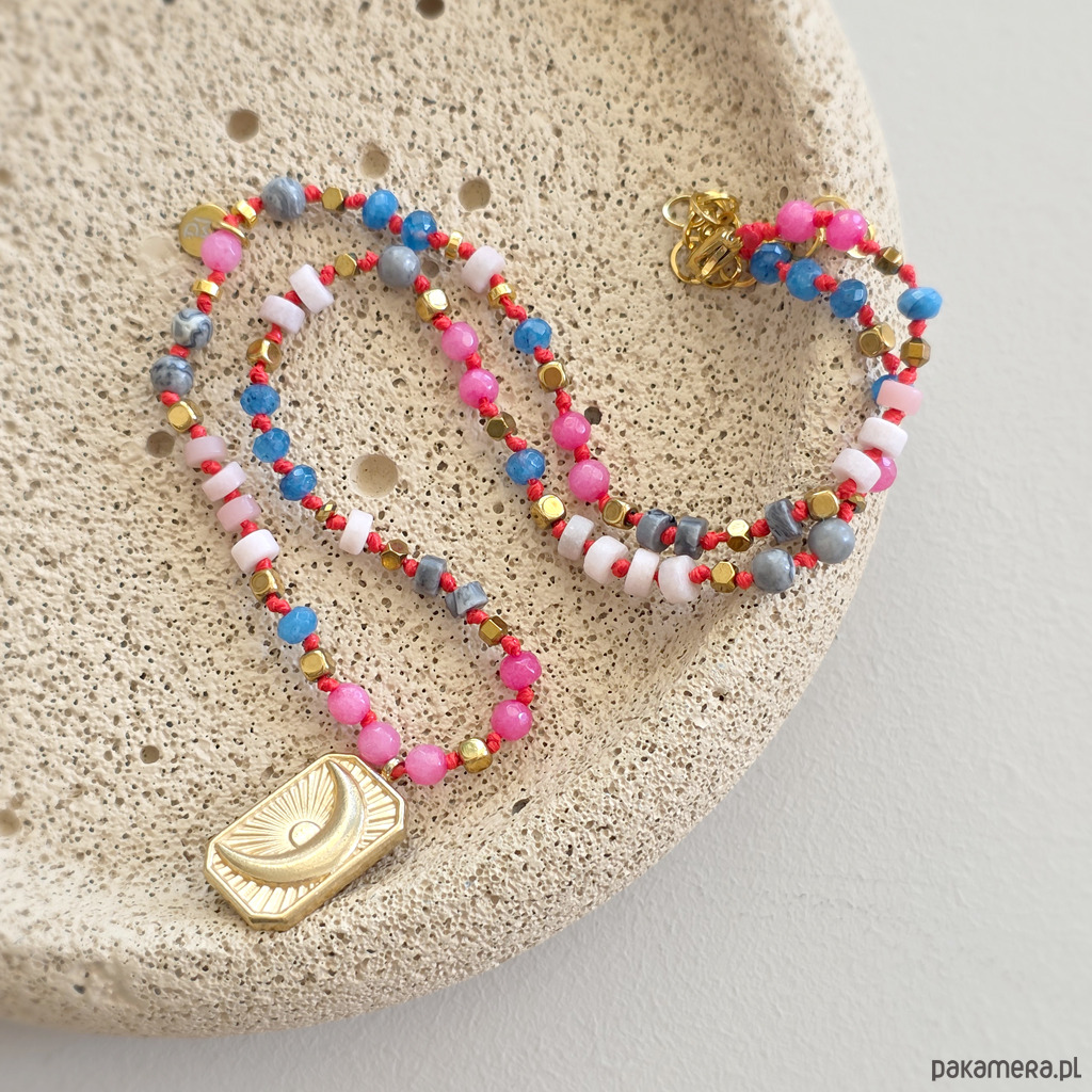 Ten unikatowy naszyjnik to spokojna, harmonijna kompozycja naturalnych kamieni osadzonych na czerwonym sznurku, który dodaje całości subtelnej wyrazistości i elegancji. Połączenie agatu, opalu różowego, jaspisu szarego i hematytu tworzy biżuterię o wyciszającej, miękkiej energii – idealną, gdy chcesz zwolnić i wrócić do siebie. Centralna zawieszka w kształcie prostokąta z wpisanym księżycem podkreśla intuicyjny, kobiecy charakter naszyjnika. To symbol cykliczności, wewnętrznego świata i życia w zgodzie z własnym rytmem.