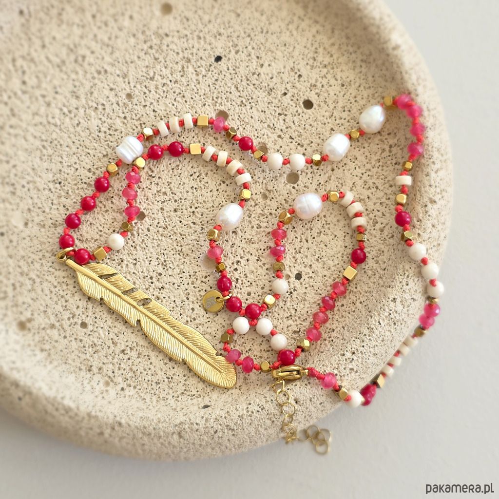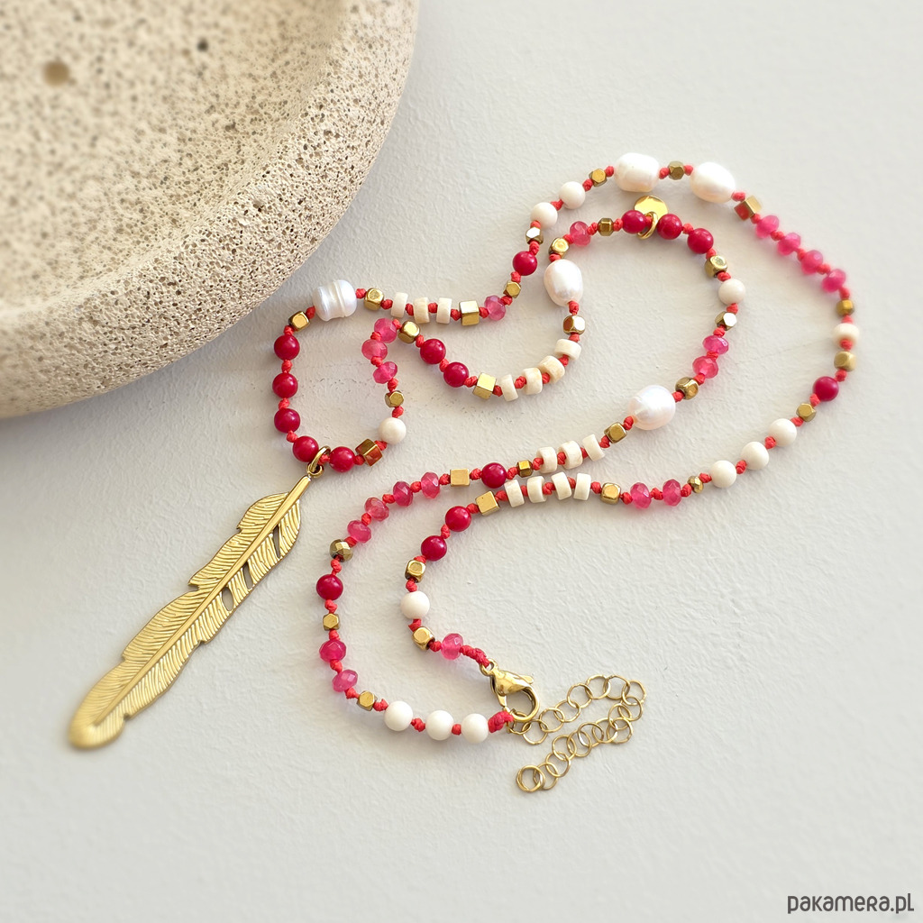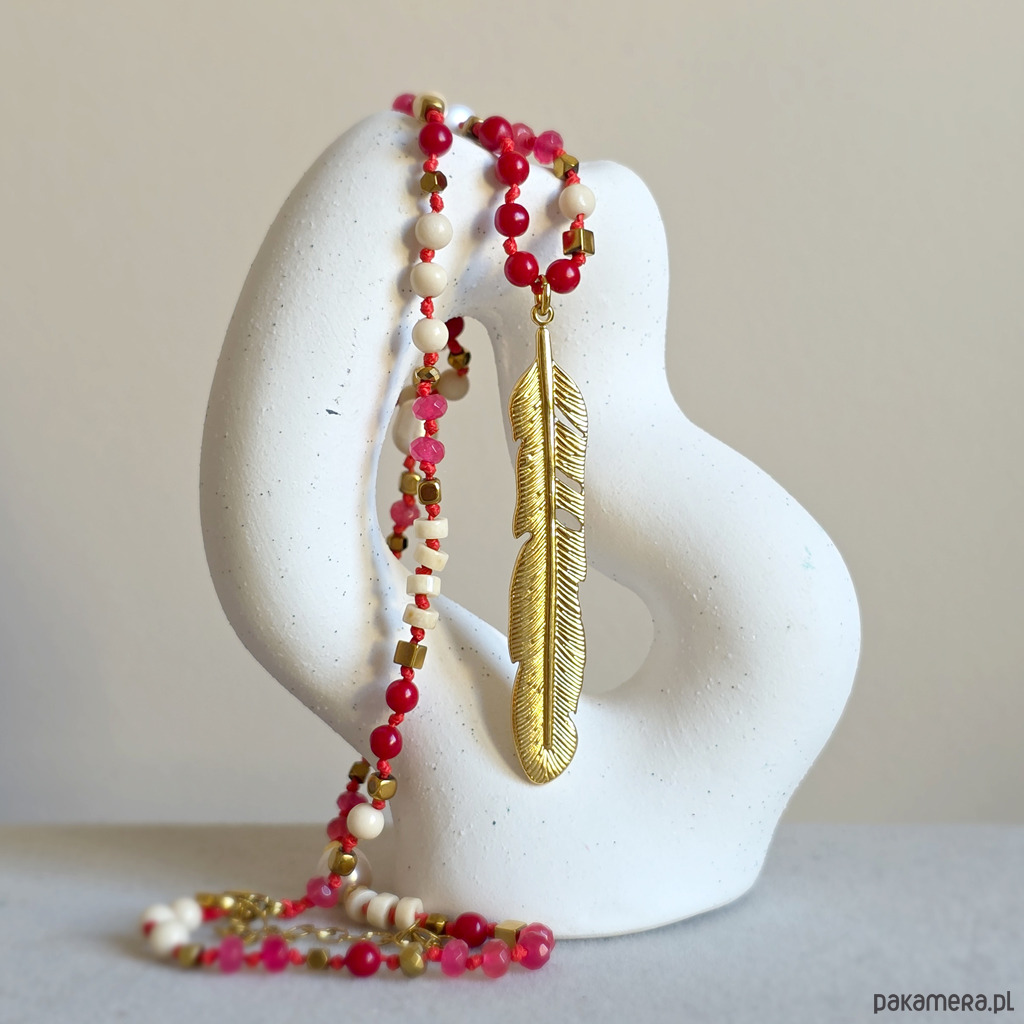 Ten unikatowy naszyjnik to wyraziste połączenie naturalnych kamieni z lekką, symboliczną formą. Agat, koral, perła, kamień rzeczny i hematyt zostały zestawione na intensywnie czerwonym sznurku, który dodaje całości energii i charakteru. Centralna zawieszka w formie pióra przyciąga uwagę i nadaje naszyjnikowi lekkości. To symbol wolności, swobody i podążania własną drogą – bez presji, w zgodzie ze sobą.