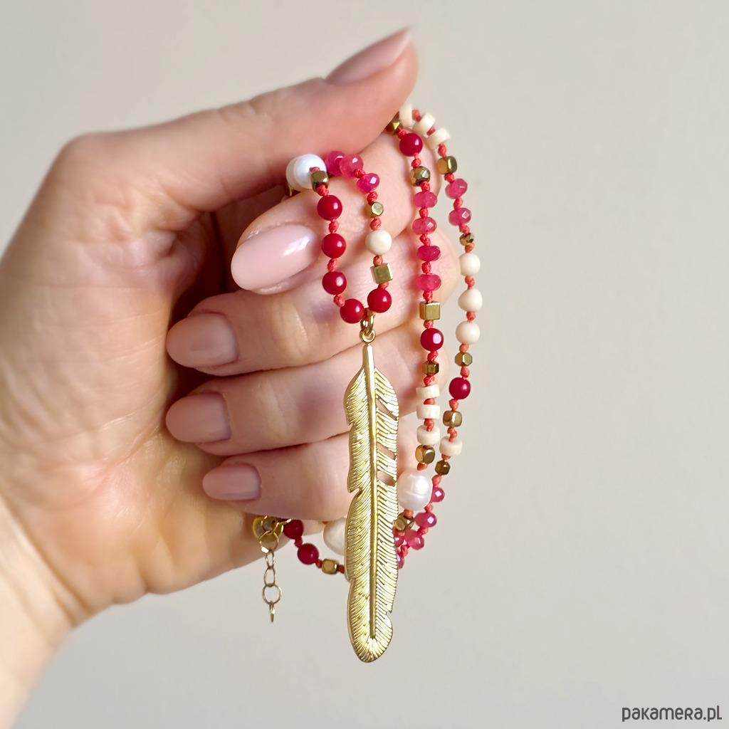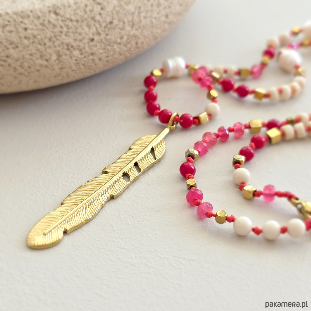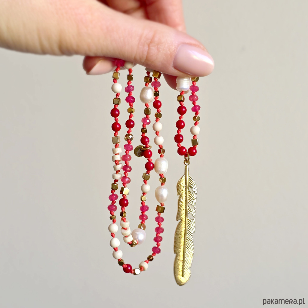 Ten unikatowy naszyjnik to wyraziste połączenie naturalnych kamieni z lekką, symboliczną formą. Agat, koral, perła, kamień rzeczny i hematyt zostały zestawione na intensywnie czerwonym sznurku, który dodaje całości energii i charakteru. Centralna zawieszka w formie pióra przyciąga uwagę i nadaje naszyjnikowi lekkości. To symbol wolności, swobody i podążania własną drogą – bez presji, w zgodzie ze sobą.