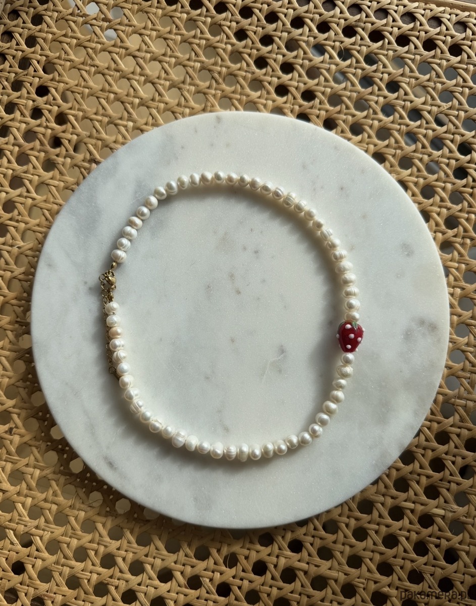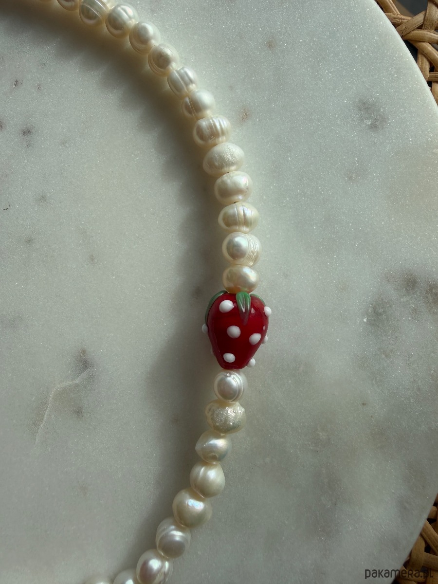 Ręcznie robiony naszyjnik z naturalnych pereł słodkowodnych o nieregularnych kształtach ze szklaną truskawką.
