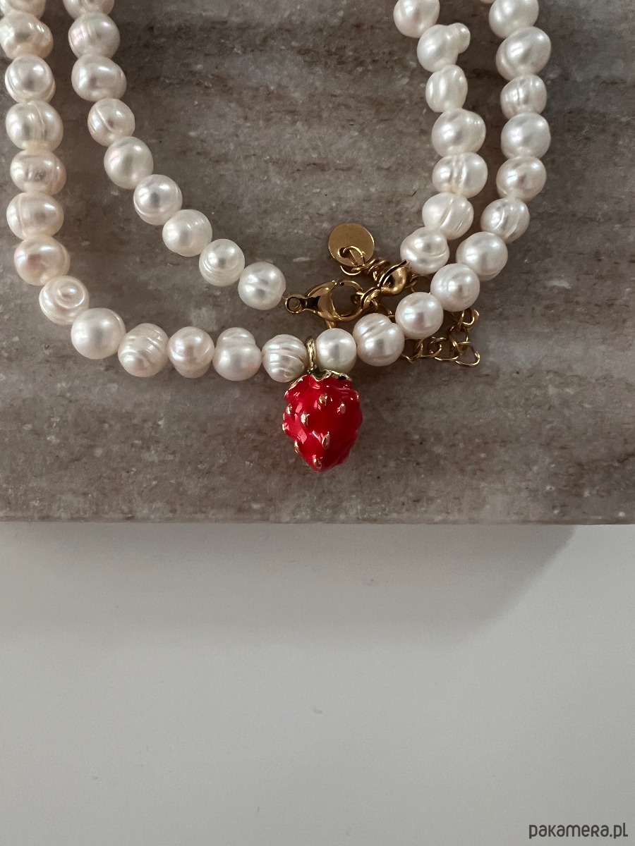 Ręcznie robiony naszyjnik z naturalnych pereł słodkowodnych o nieregularnych ale okrągłych kształtach z truskawką.