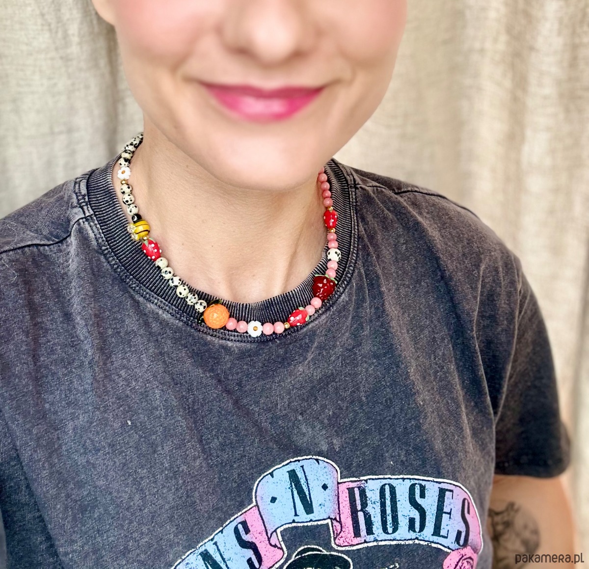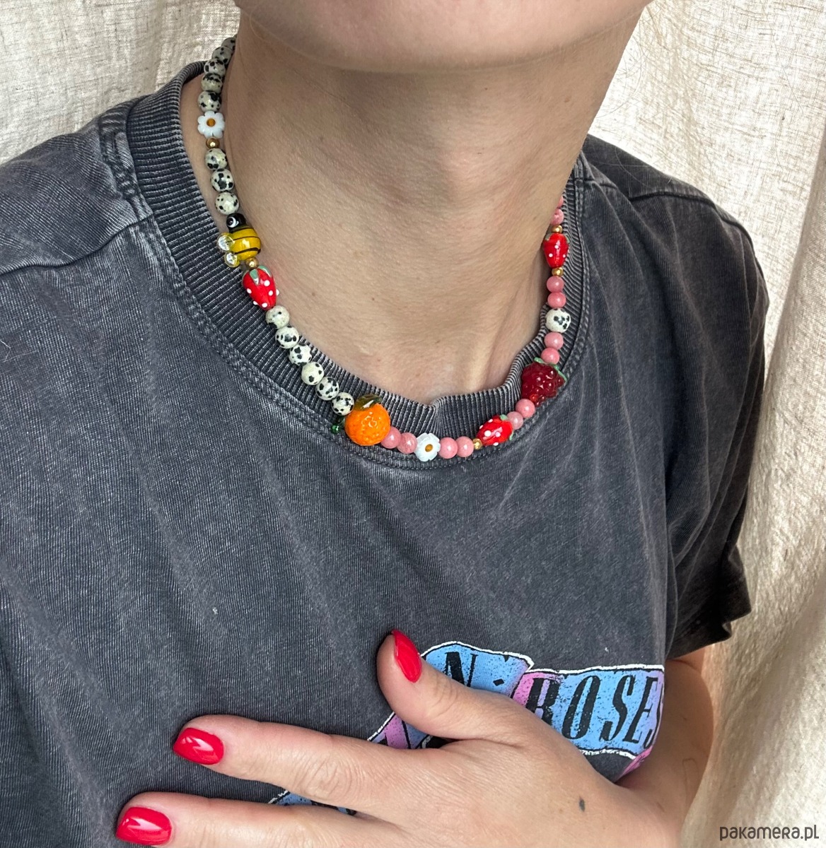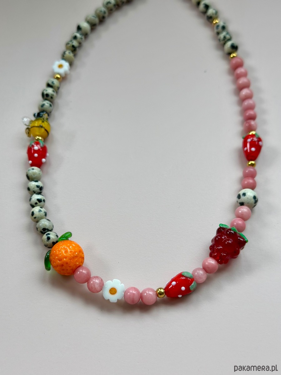 Przepiękny bogaty naszyjnik na lato o długości w okolicach 42 cm . Kolory, owocki, wdzięczna pracowita pszczółka w otuleniu różowych chalcedonów i jaspisów dalmatyńskich , to połączenie idealne. Lekkości dodają stokrotki.