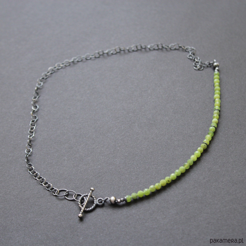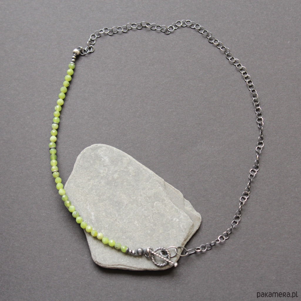 Naszyjnik wykonany został zoksydowanego srebra próby 925 oraz przepięknych fasetowanych kuleczek nefrytów wielkości 0,4 cm.