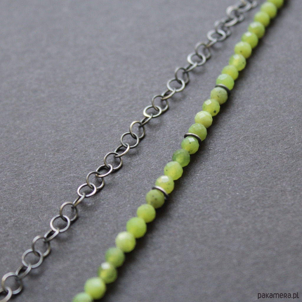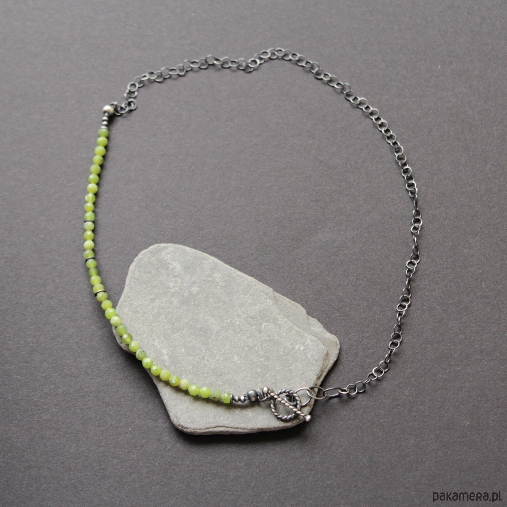 Naszyjnik wykonany został zoksydowanego srebra próby 925 oraz przepięknych fasetowanych kuleczek nefrytów wielkości 0,4 cm.