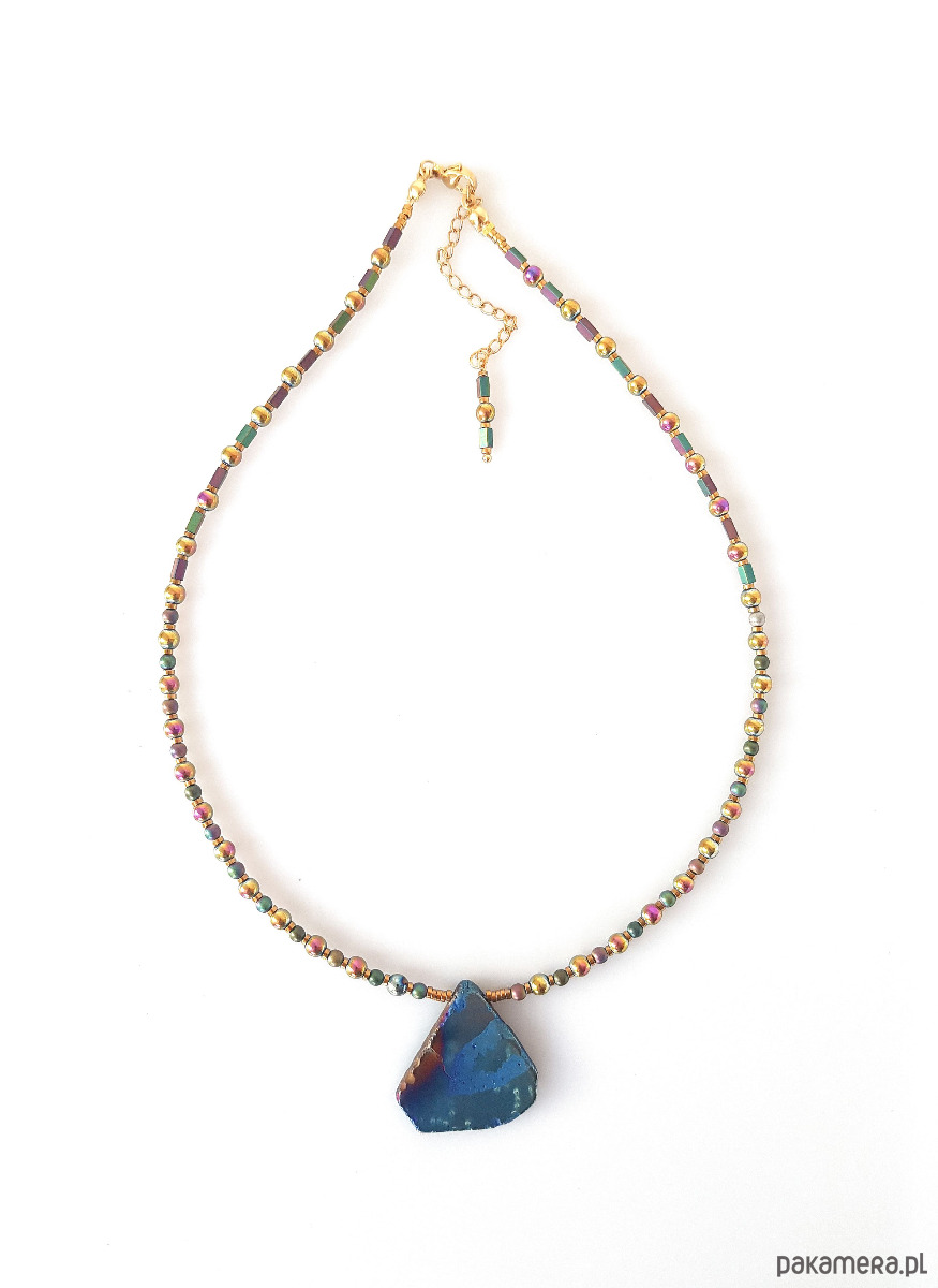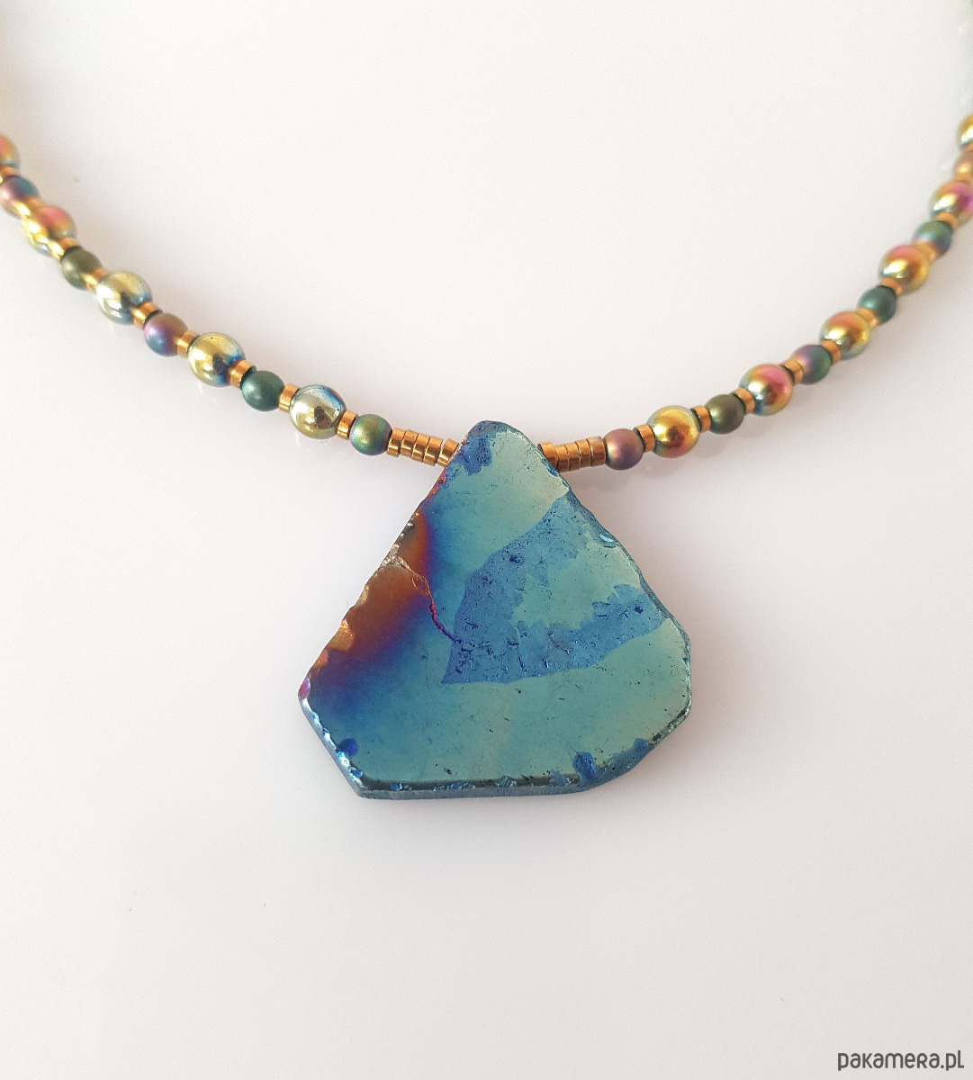 Naturalny agat pokryty cienką warstwą tytanu zachowuje swoje właściwości, a warstwa tytanu nadaje mu nowoczesny, wręcz kosmiczny charakter. Wisior jest z jednej strony niebieski, z drugiej zielonkawy.