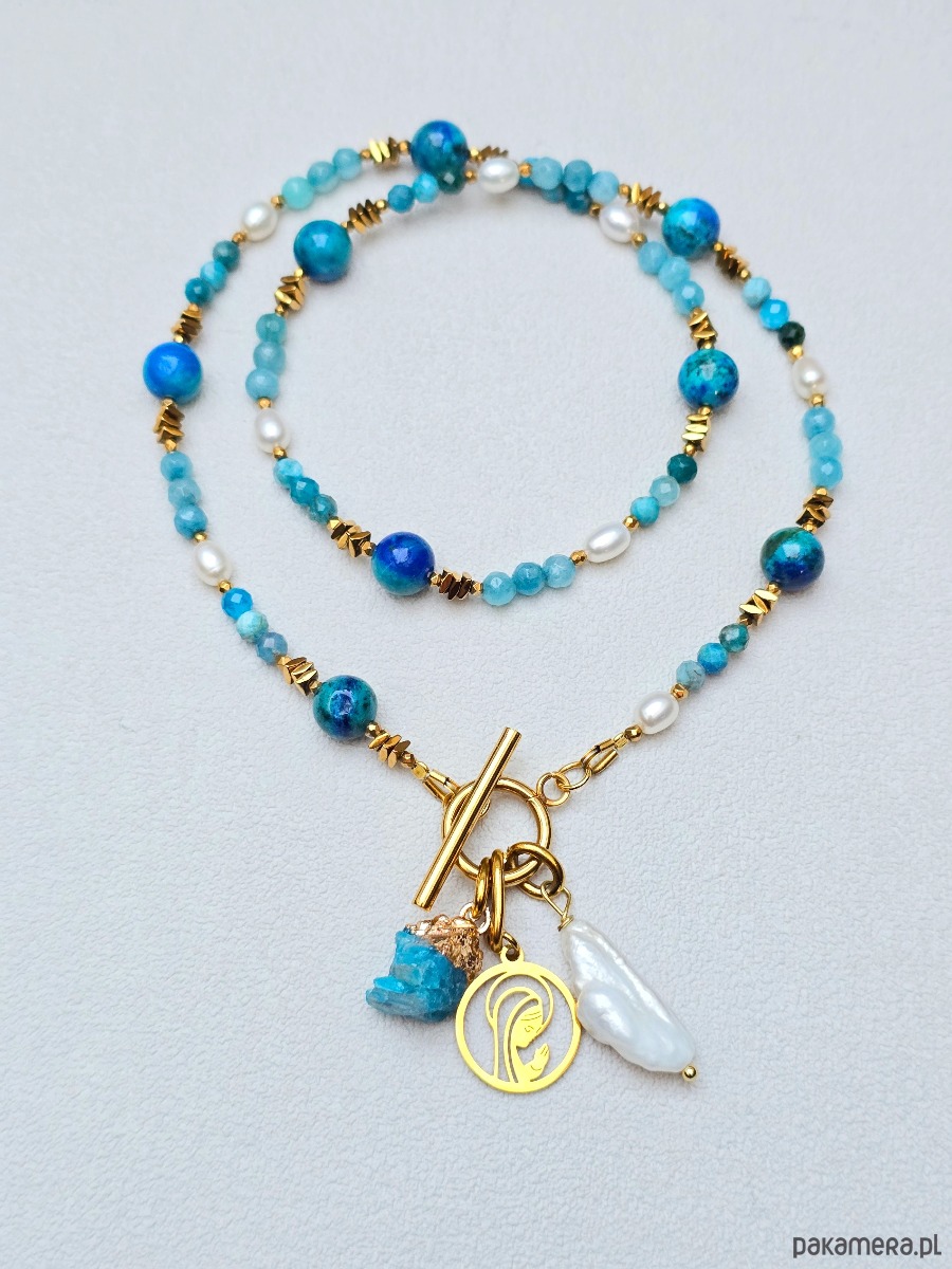 Naszyjnik z wykonany z kamieni naturalnych tj.: azuryt, apatyt, jadeit, perły naturalne, złocony hematyt.