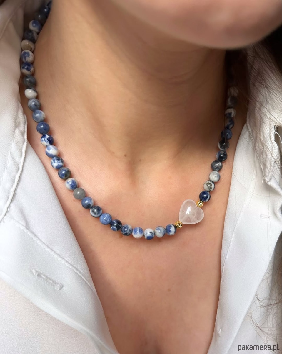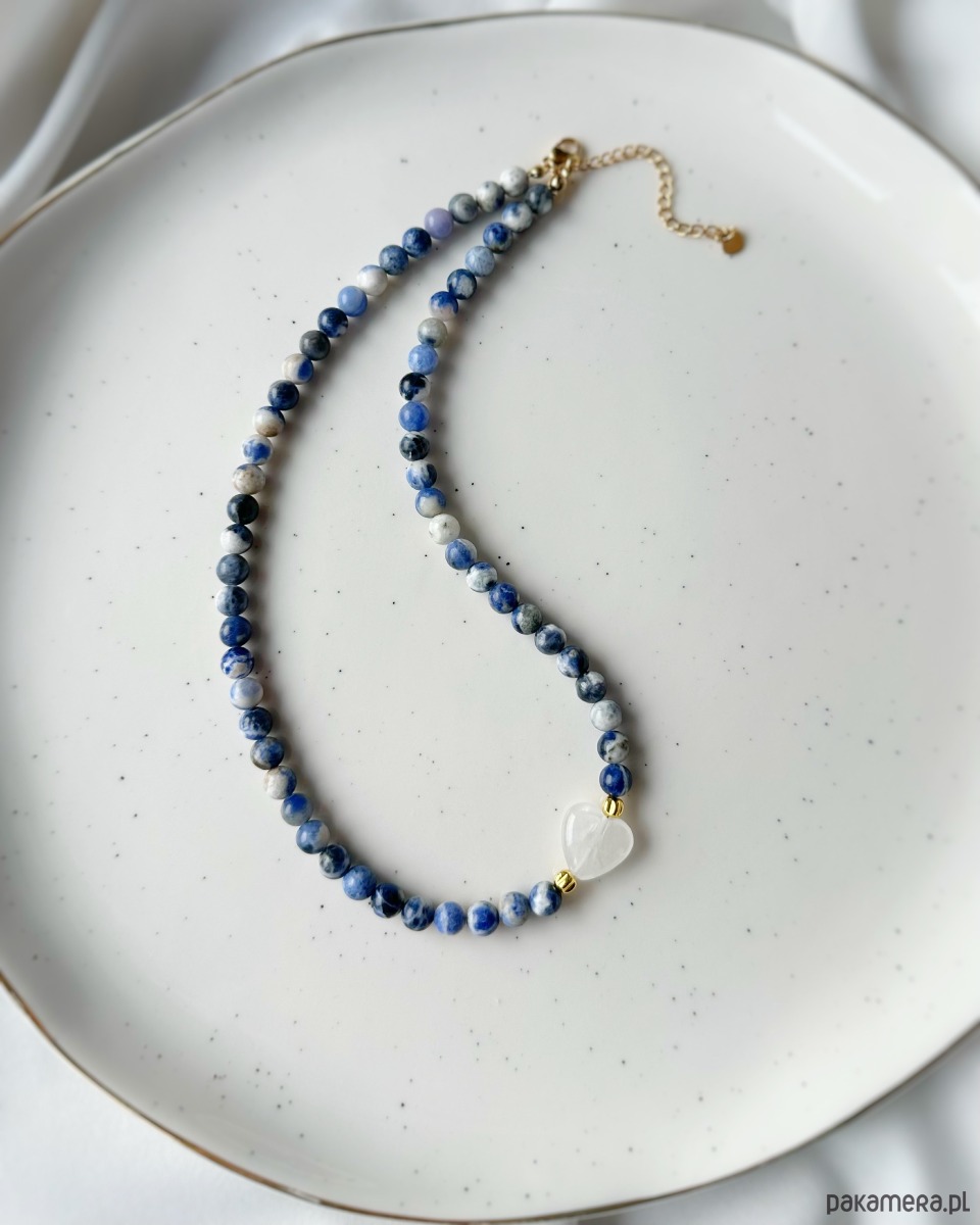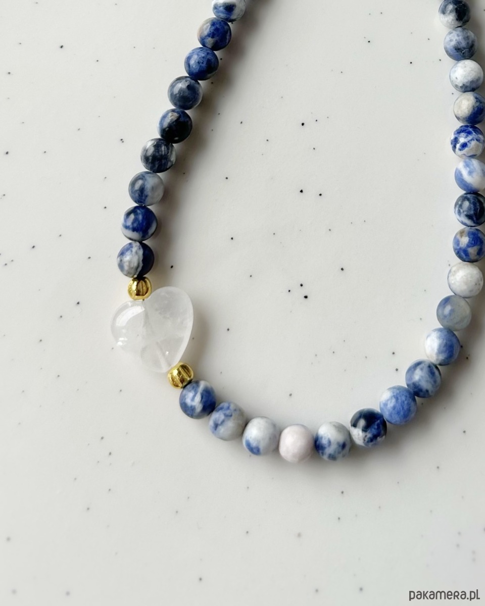 Piękny naszyjnik w niebiesko-białych odcieniach. Wykonany z gładkich koralików z sodalitu i serca z kryształu górskiego, z dodatkiem złotego hematytu. Idealny do codziennych stylizacji dla każdej romantyczki!
