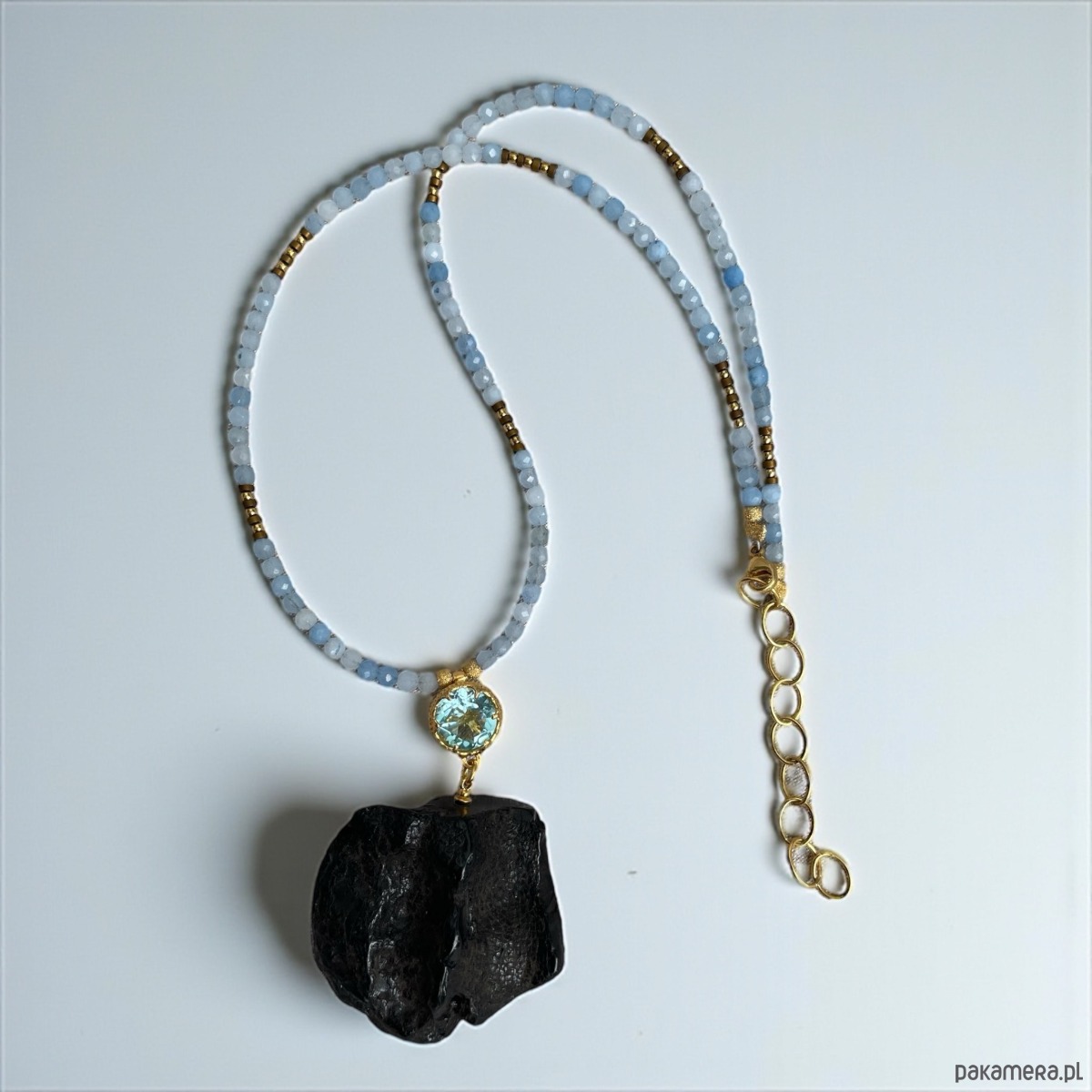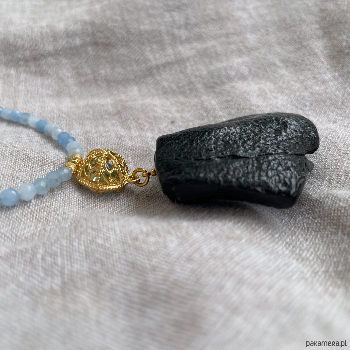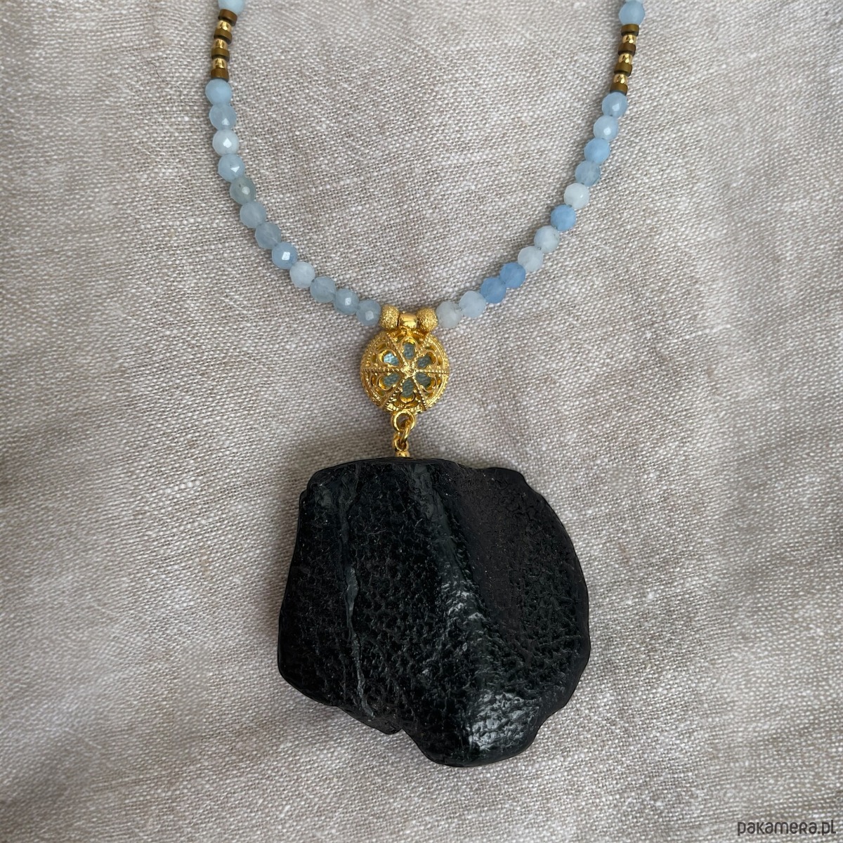 Stylowy naszyjnik z naturalnym czarnym bursztynem bałtyckim w centrum - jego nieregularna, matowa faktura i głęboka barwa przyciągają wzrok i emanują surowym pięknem. Drobny fasetowany niebieski topaz dodaje lekkości tej formie naszyjnika.