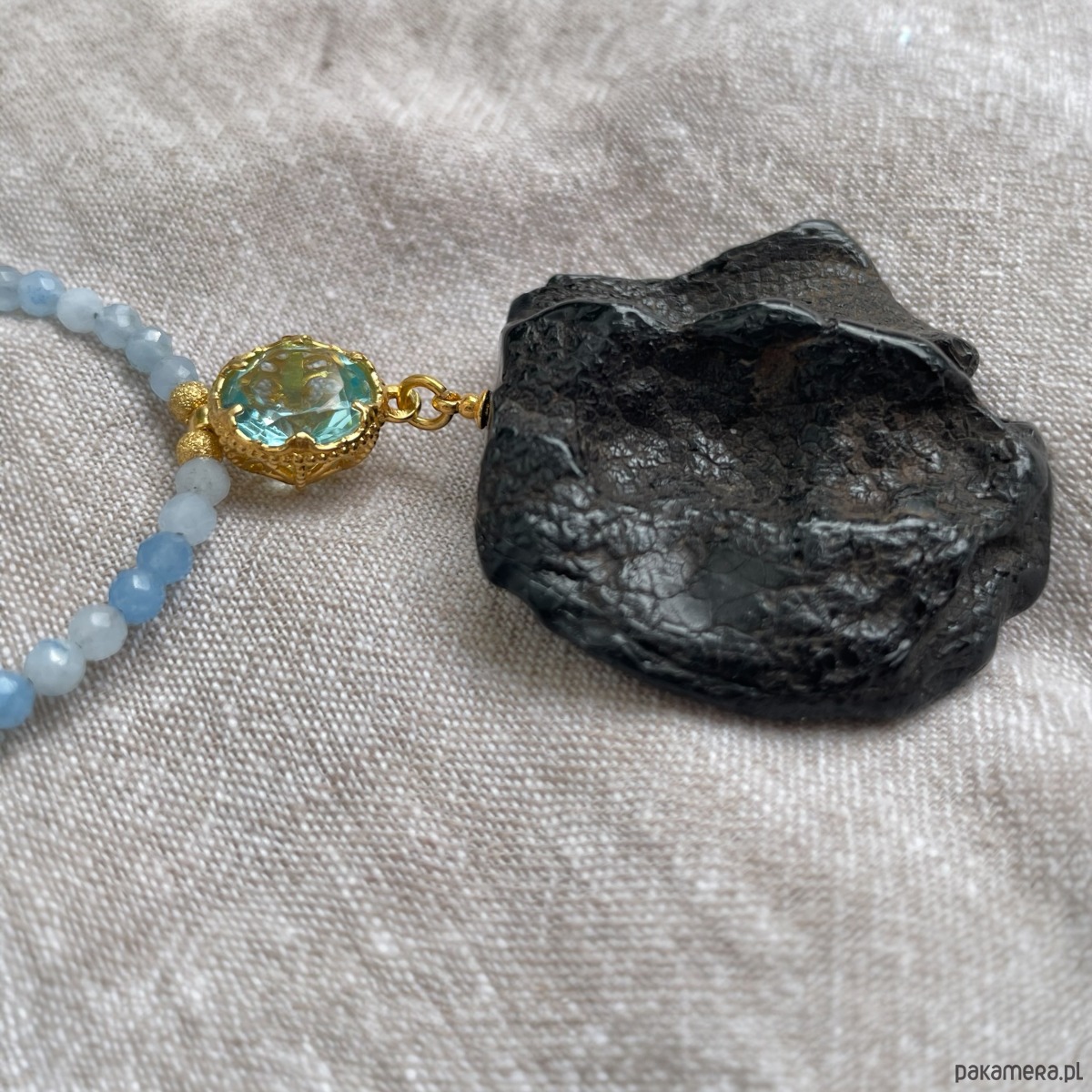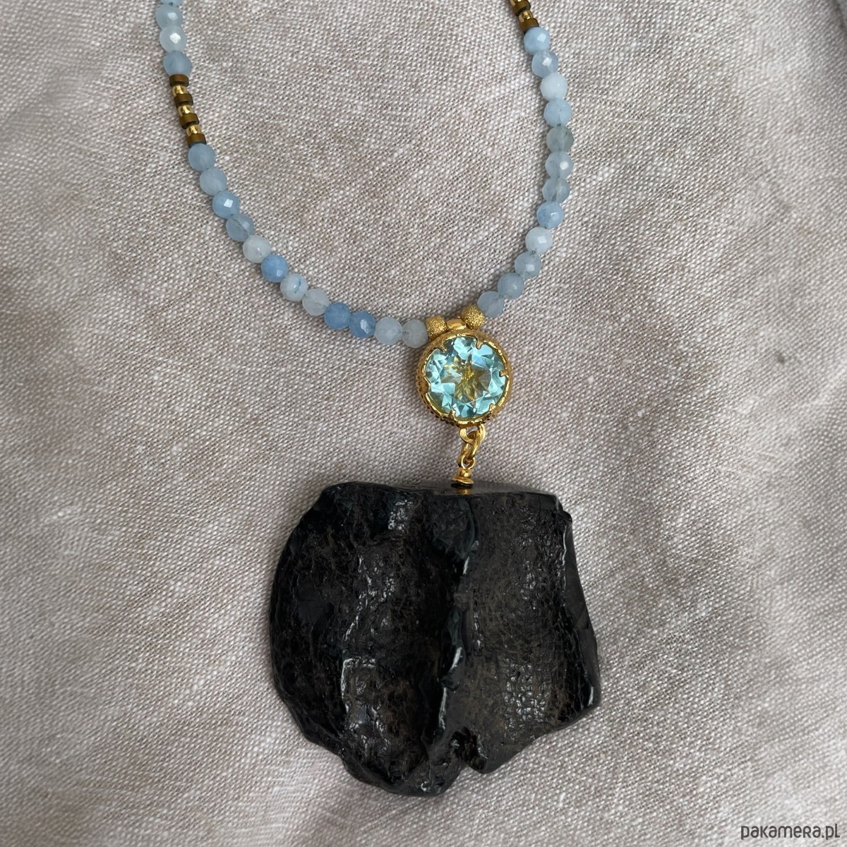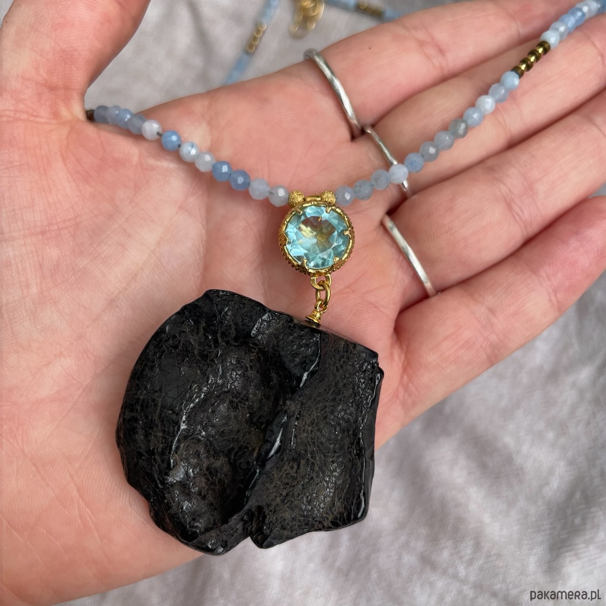 Stylowy naszyjnik z naturalnym czarnym bursztynem bałtyckim w centrum - jego nieregularna, matowa faktura i głęboka barwa przyciągają wzrok i emanują surowym pięknem. Drobny fasetowany niebieski topaz dodaje lekkości tej formie naszyjnika.
