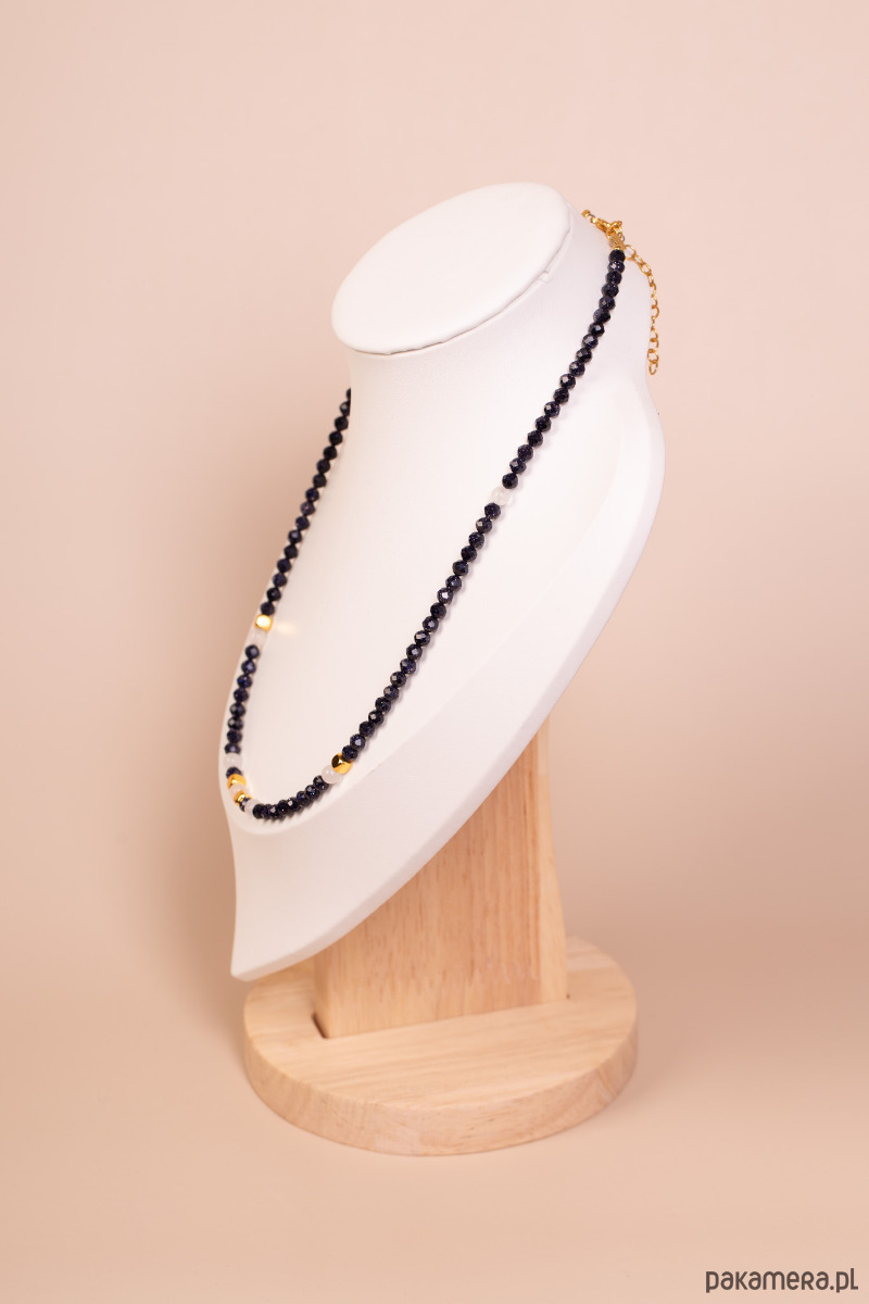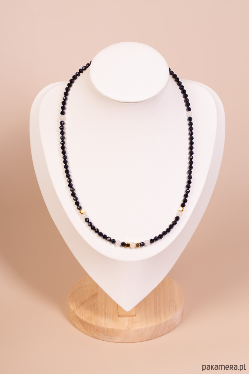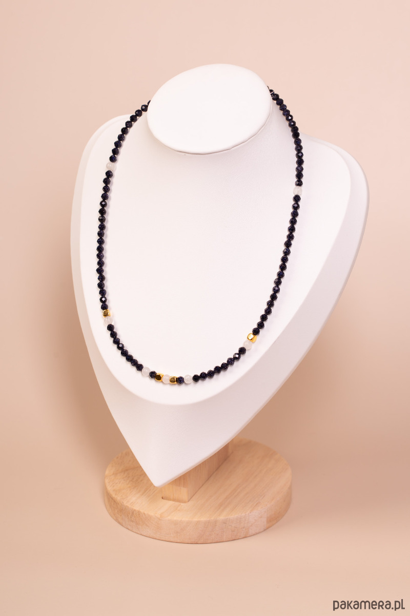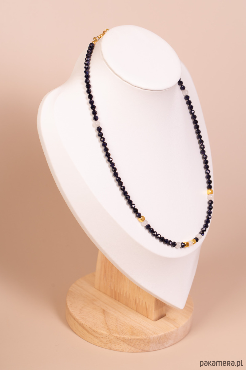Elegancki, ręcznie wykonany naszyjnik, który swoją kolorystyką przywodzi na myśl rozgwieżdżone, nocne niebo. Główną linię tworzą drobne, fasetowane kuleczki Nocy Kairu – kamienia o głębokim, ciemnym odcieniu z tysiącem mieniących się, jasnych drobinek. Te świetliste punkty efektownie kontrastują z mleczno-białymi koralikami kwarcu oraz złotymi akcentami, tworząc biżuterię o klasycznym, a zarazem intrygującym charakterze.