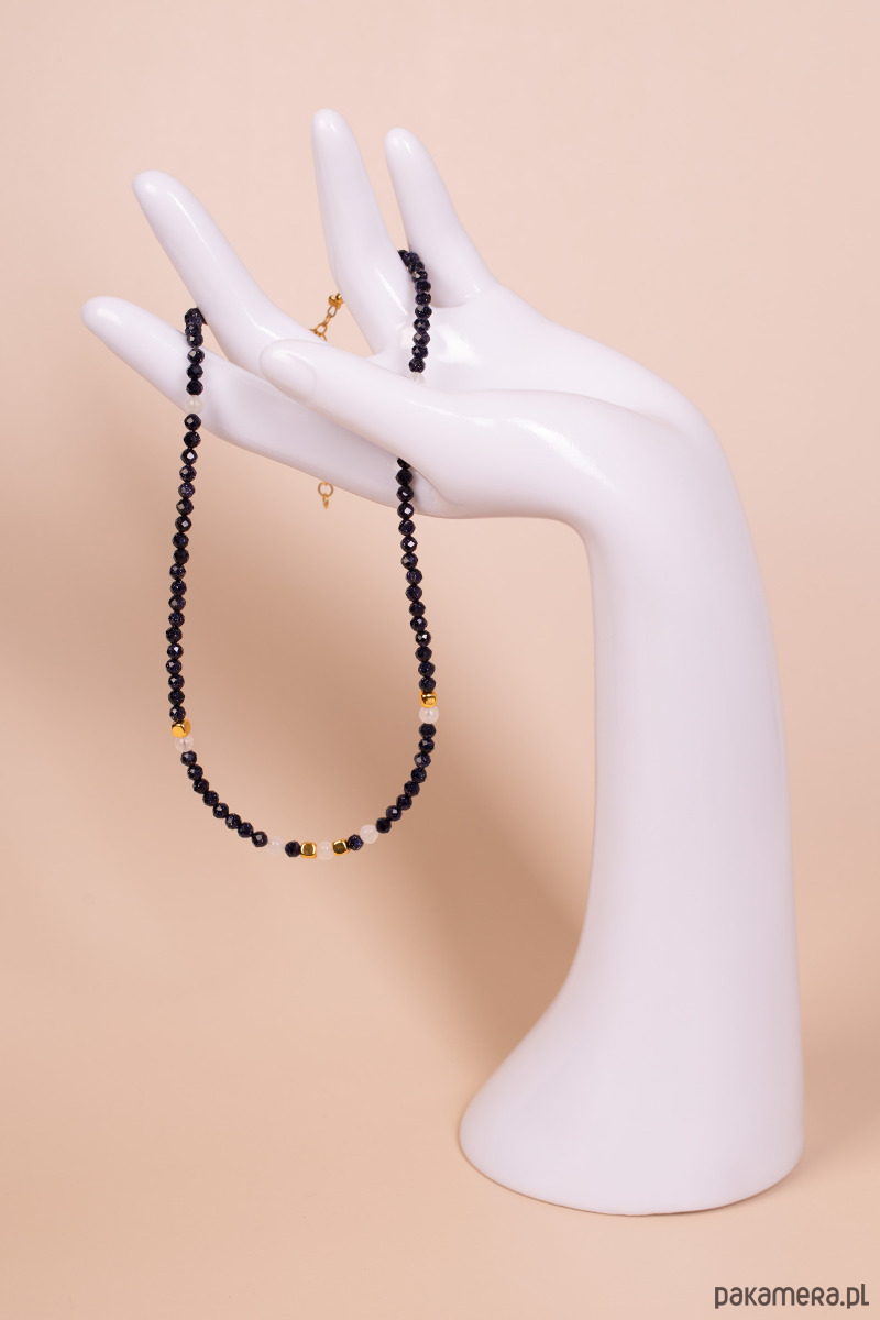 Elegancki, ręcznie wykonany naszyjnik, który swoją kolorystyką przywodzi na myśl rozgwieżdżone, nocne niebo. Główną linię tworzą drobne, fasetowane kuleczki Nocy Kairu – kamienia o głębokim, ciemnym odcieniu z tysiącem mieniących się, jasnych drobinek. Te świetliste punkty efektownie kontrastują z mleczno-białymi koralikami kwarcu oraz złotymi akcentami, tworząc biżuterię o klasycznym, a zarazem intrygującym charakterze.