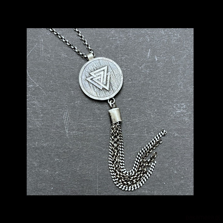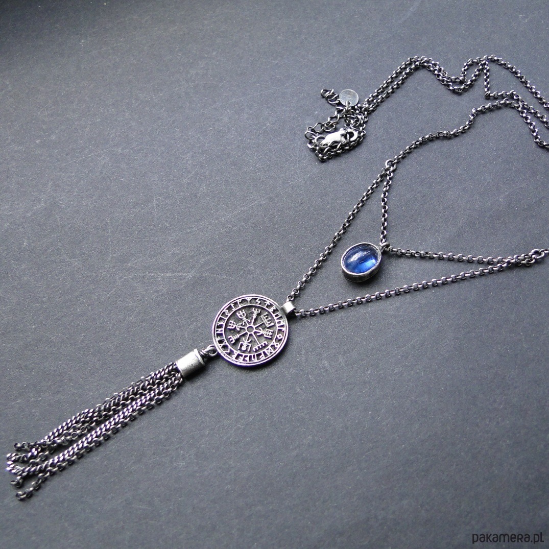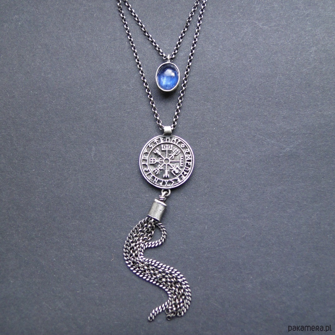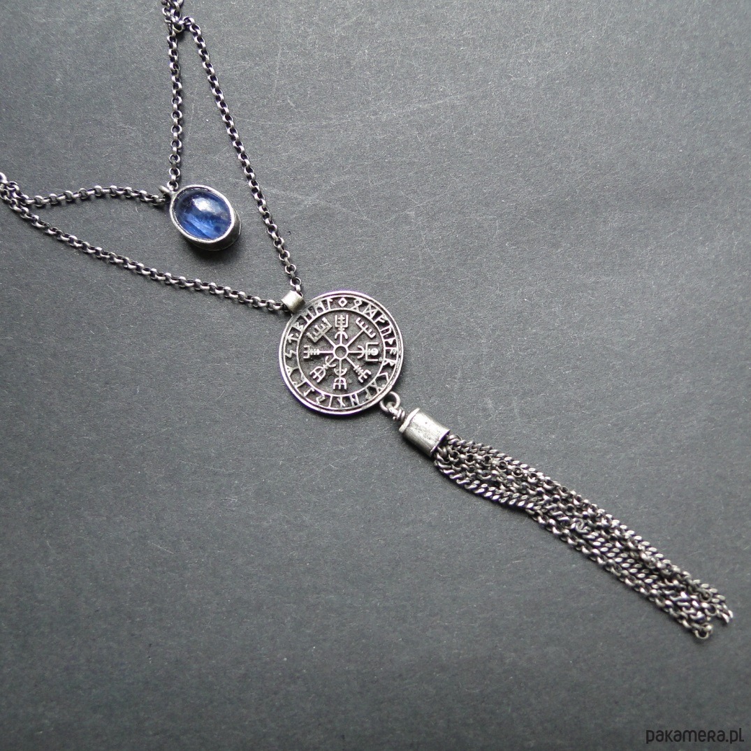 Surowy naszyjnik-amulet wykonany ze srebra 925,oksydowany i szorowany. Nordycki medalion z pismem obrazkowym, z tyłu Valknut-symbol wojowników . Kamień; naturalny kianit dł.1 cm , poch. Indie. Naszyjnik ma długość 50 cm plus 6 cm przedłużka.Nie moczyć w wodzie.