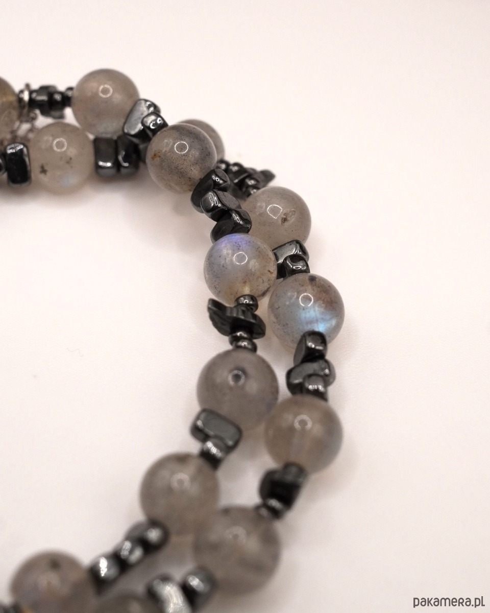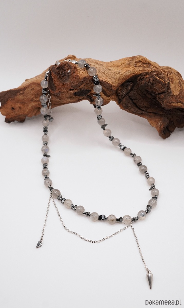 Tajemniczy i pociągający, ten naszyjnik wydaje się zamykać w sobie blask zorzy polarnej. Połączenie mistycznego labradorytu, który zmienia odcień od szarości po głęboki błękit i złoto, z chłodnym metalicznym blaskiem hematytu, sprawia, że ta biżuteria staje się wyrazistym akcentem każdej stylizacji.