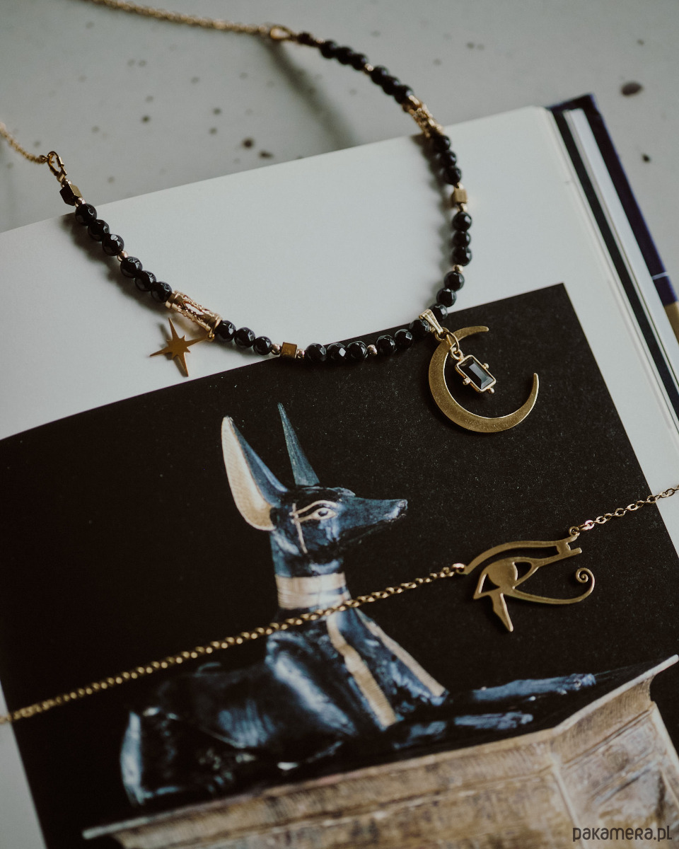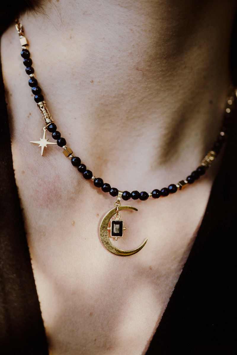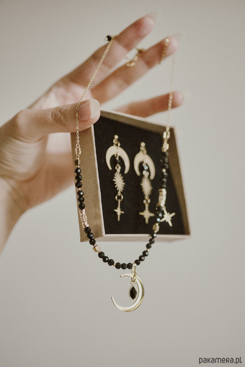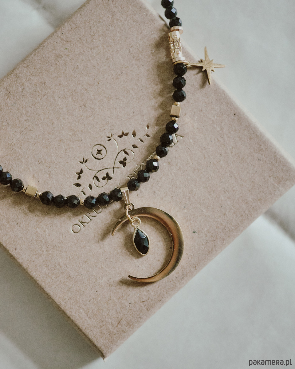 Naszyjnik wykonany jest z naturalnego onyksu oraz hematytu. Ozdobiony trzema zawieszkami, półksiężycem, asymetryczną gwiazdą i pozłacaną zawieszką z łezką* onyksu. Naszyjnik wykończony jest stalą jubilerską, nie ciemnieje i nie uczula. Długość to 40cm + 5 cm przedłużki.
