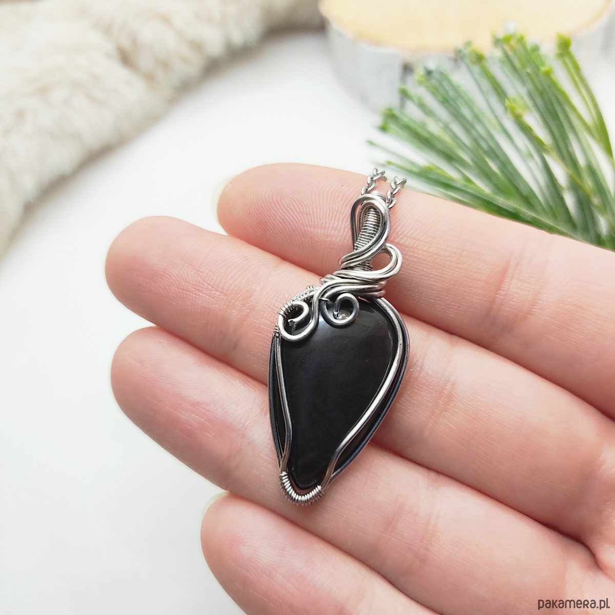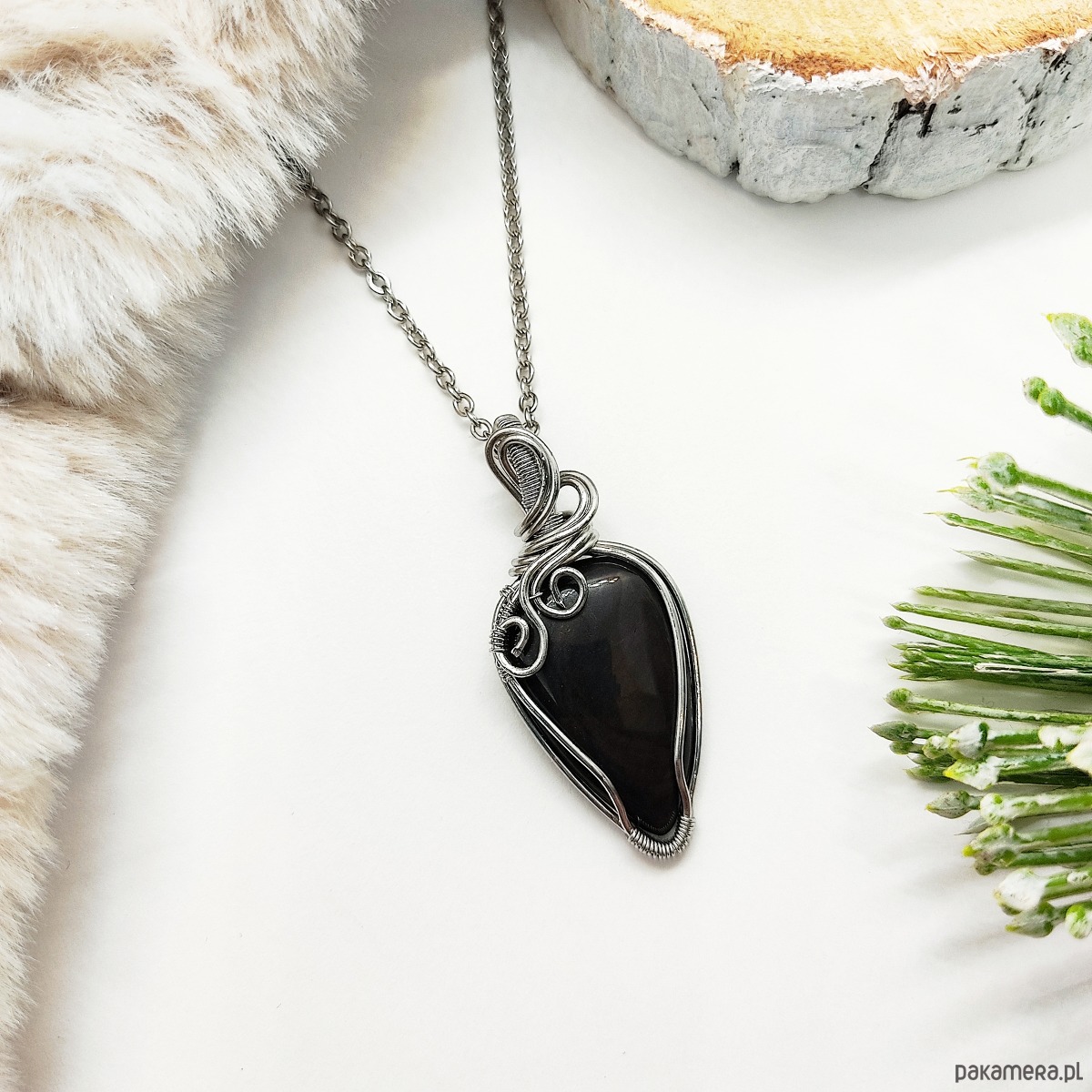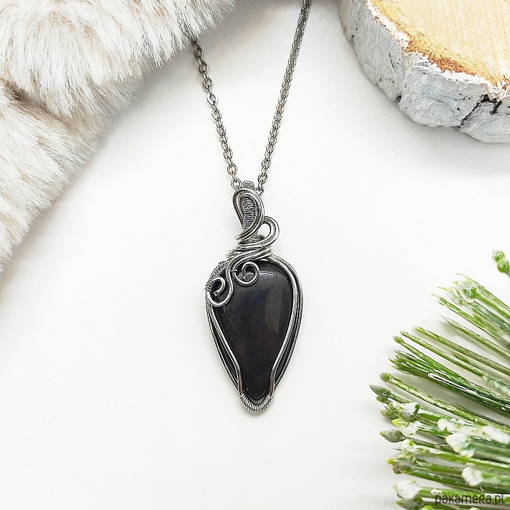 Naszyjnik Obsydian Złocisty stal chirurgiczna wisiorek handmade wirewrapping