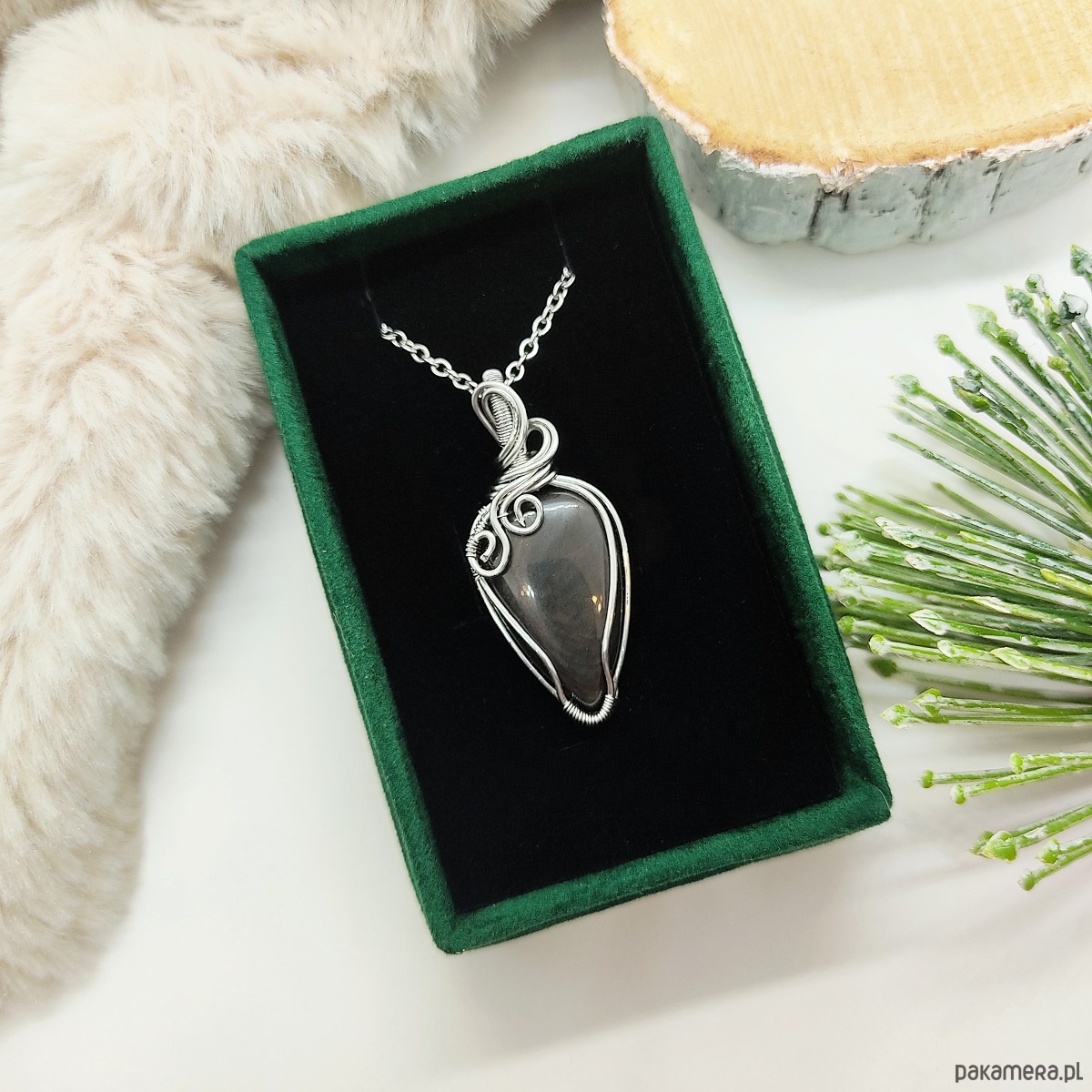 Naszyjnik Obsydian Złocisty ręcznie robiony. Wykonany techniką wire wrapping z drutów ze stali chirurgicznej. Kamień pod odpowiednim kątem mieni się na złoty kolor.