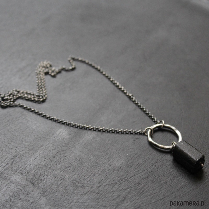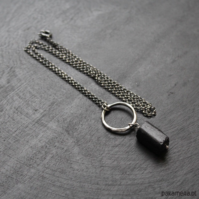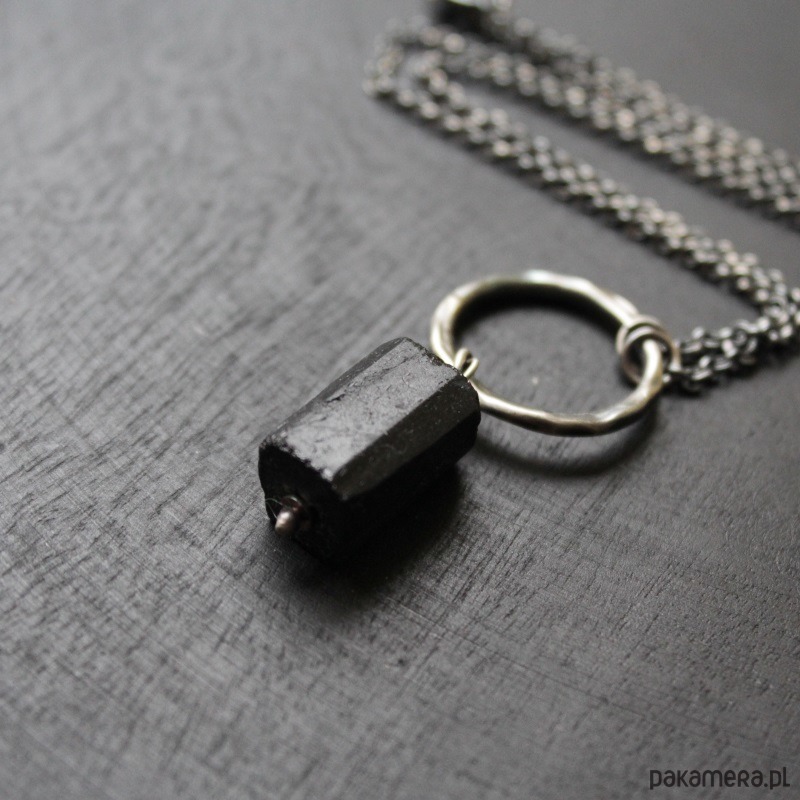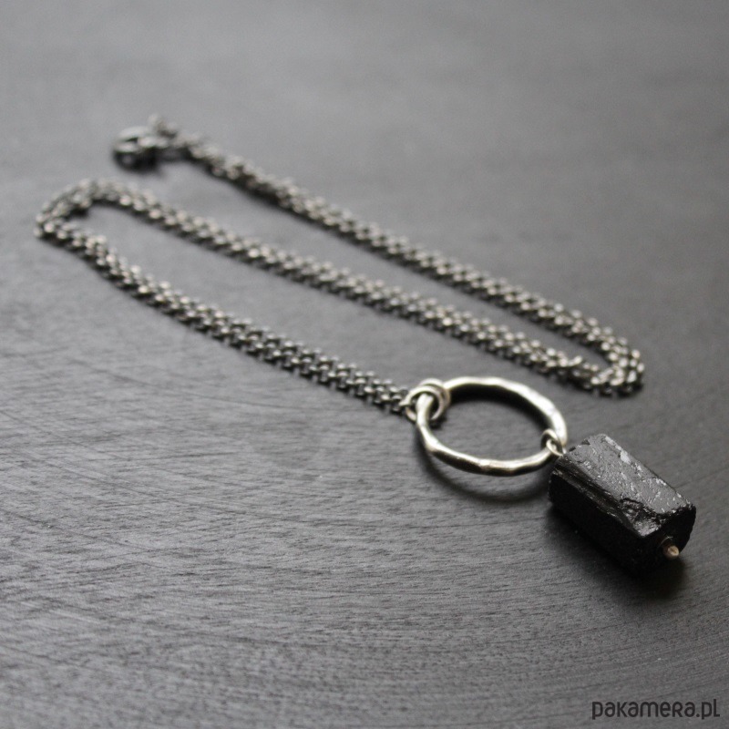 Naszyjnik został wykonany z oksydowanego srebra próby 925 oraz surowego czarnego turmalinu (1,6 cm).