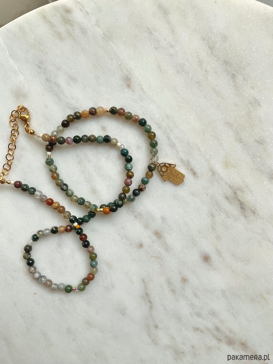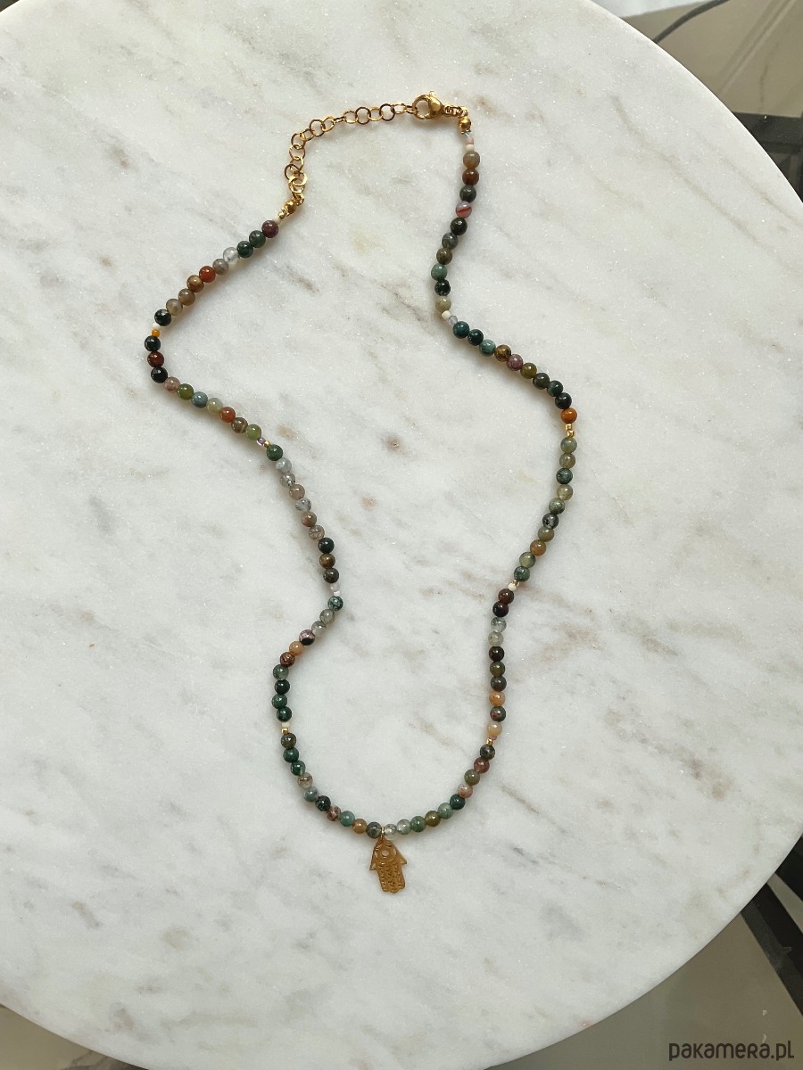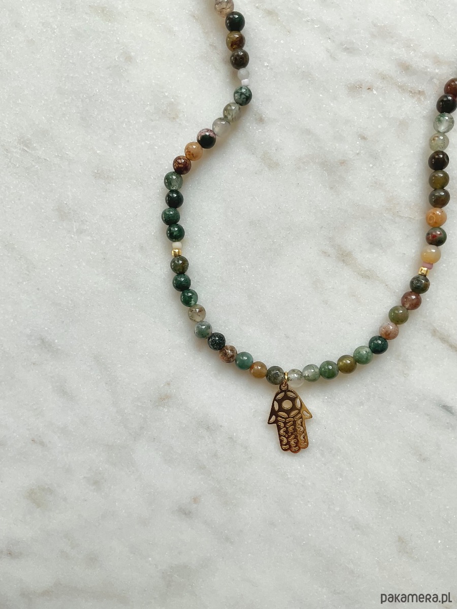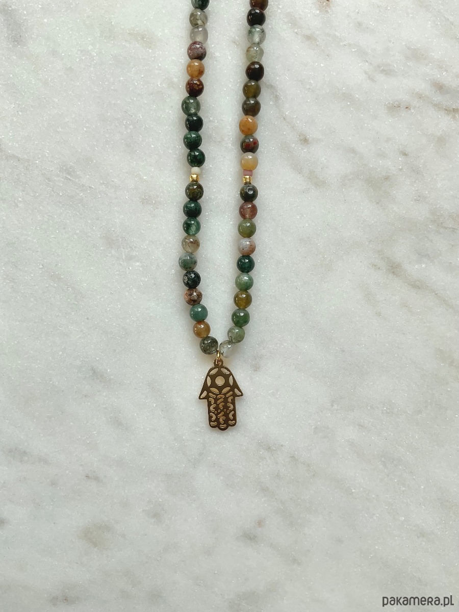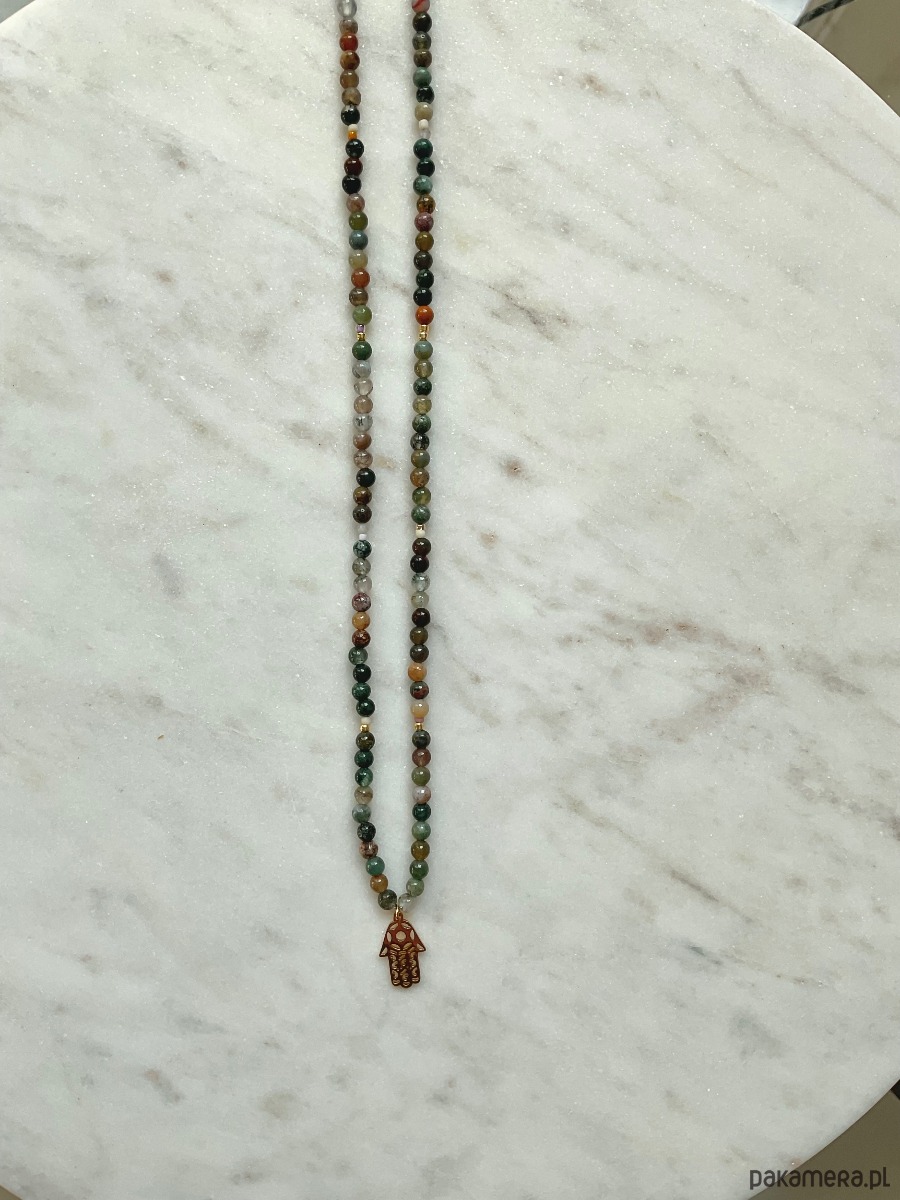 Bazą naszyjnika jest jest agat indyjski, który również ma swoje właściwości, ten kamień przynosi równowagę, spokój i pomaga rozwinąć się wewnętrznie.