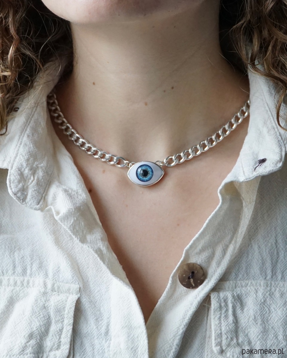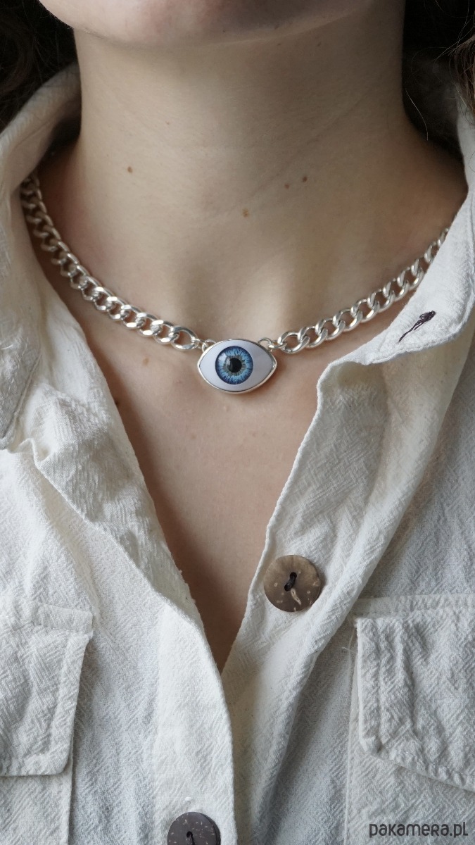 Srebrny naszyjnik OCULA chain na grubym łańcuchu z niebieskim okiem.