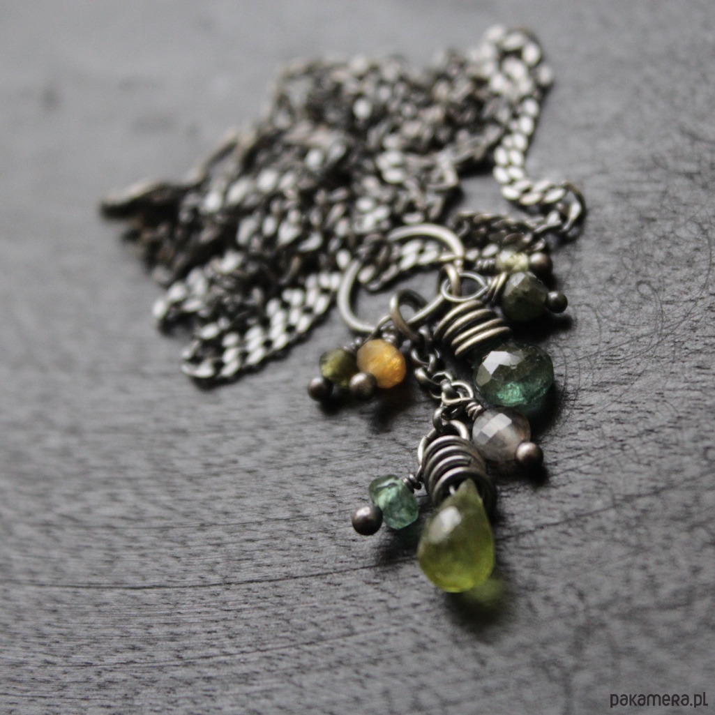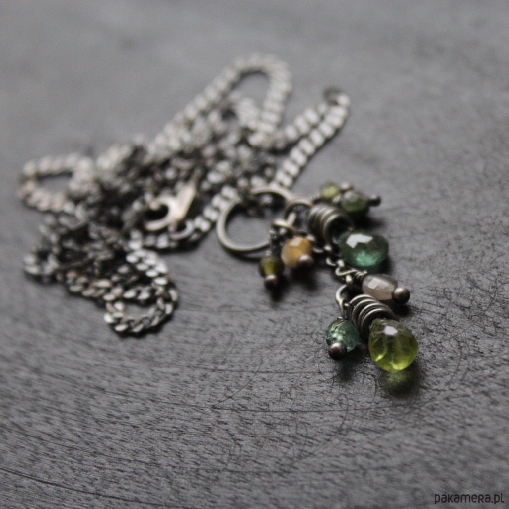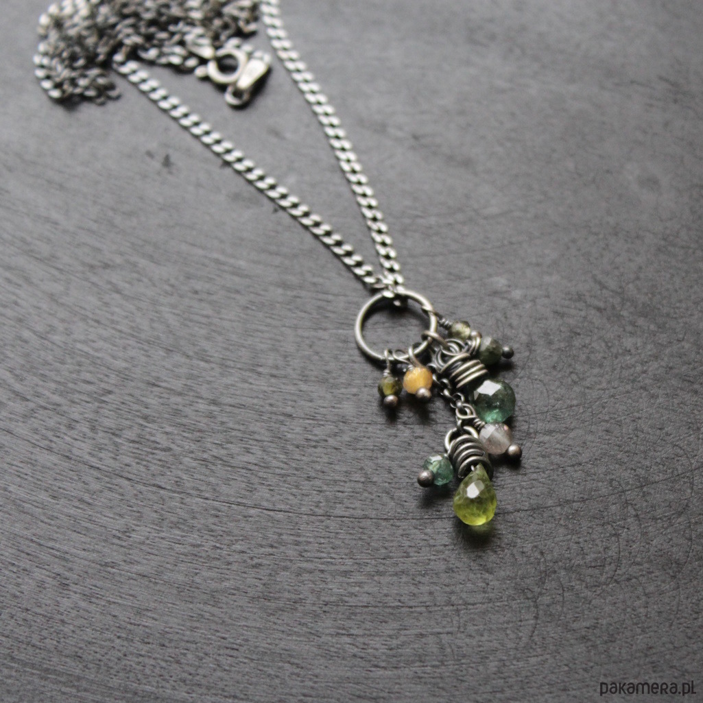 Główną ozdobą naszyjnika są przepiękne fasetowany minerały: oliwin 0,6 cm, fasetowany turmalinów (0,25-0, cm) oraz diopsydu 0,35 cm.