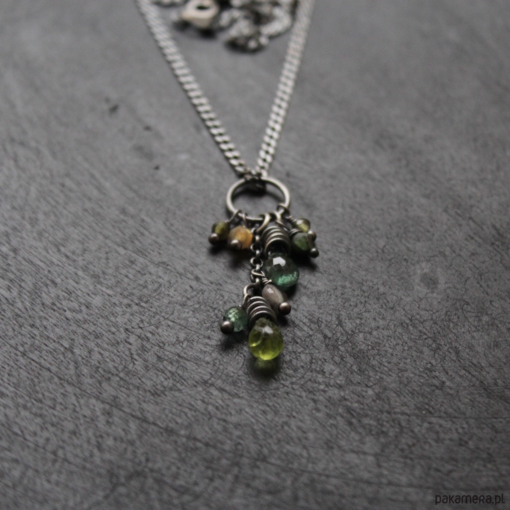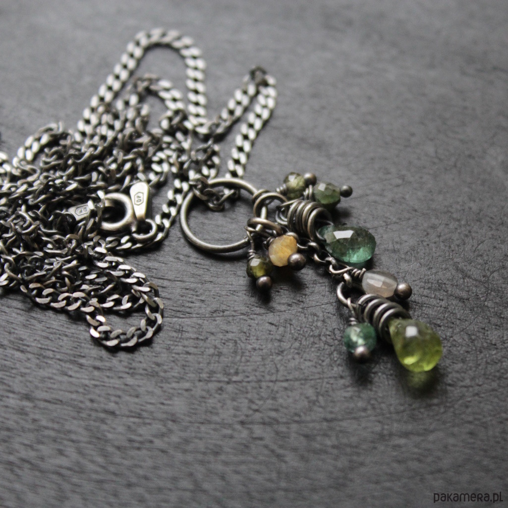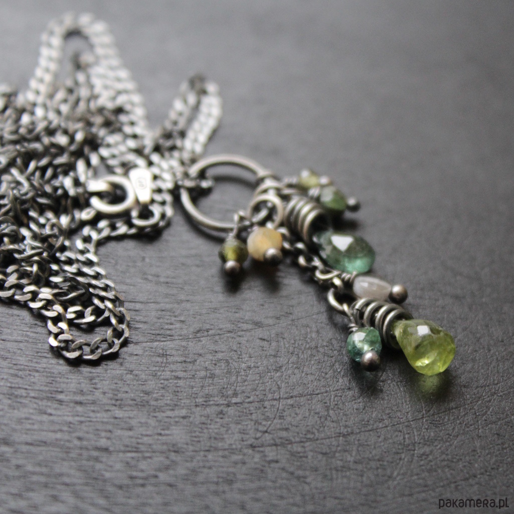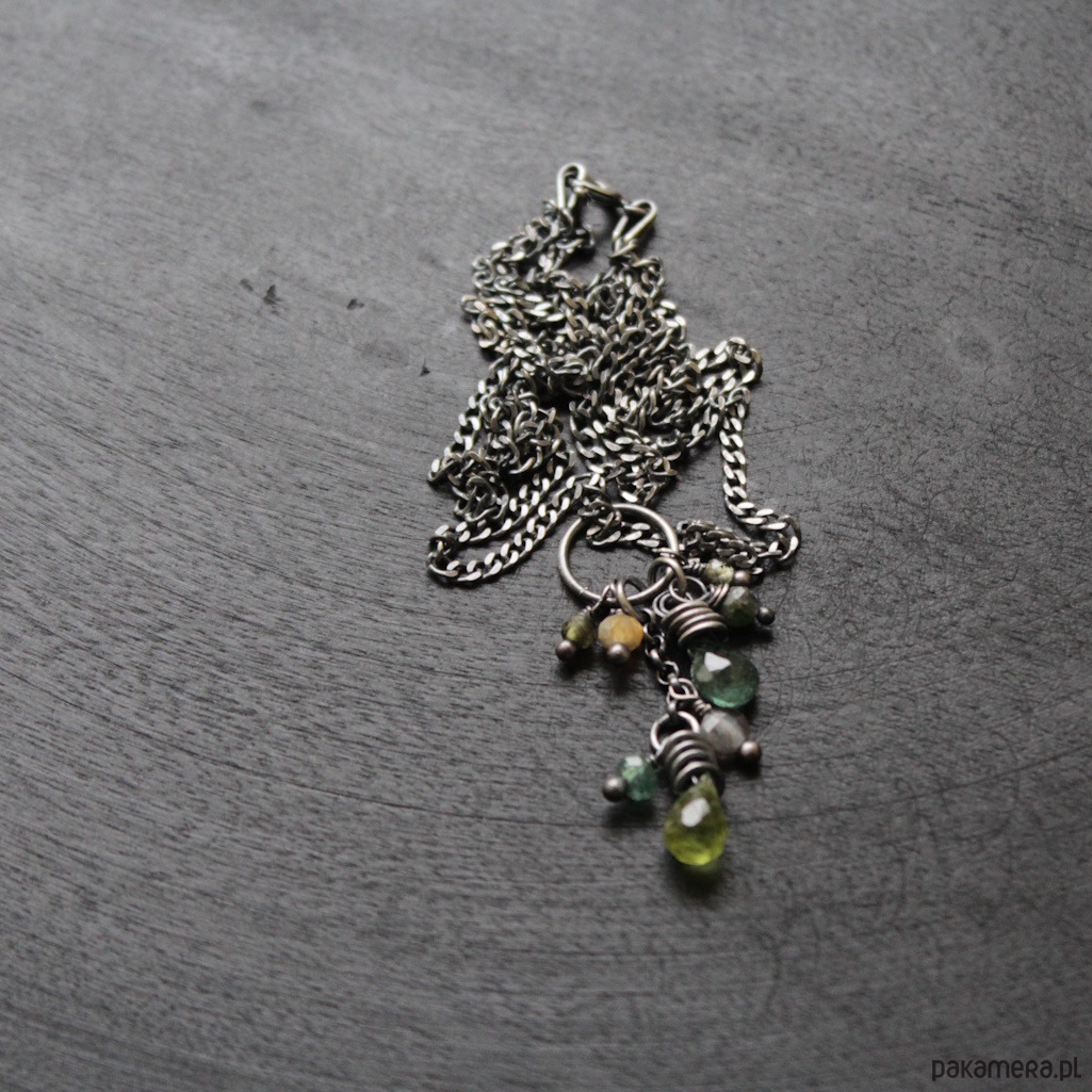 Główną ozdobą naszyjnika są przepiękne fasetowany minerały: oliwin 0,6 cm, fasetowany turmalinów (0,25-0, cm) oraz diopsydu 0,35 cm.