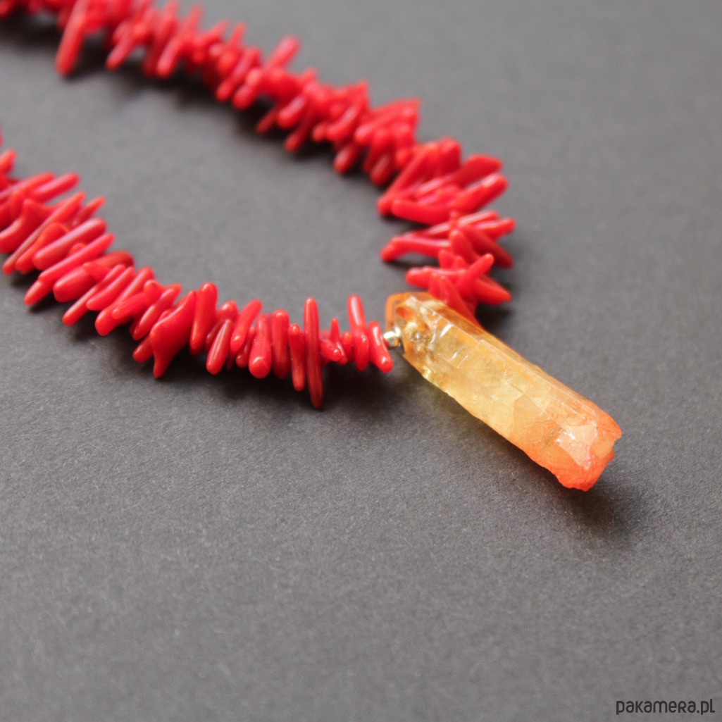 Unikatowy naszyjnik zostały wykonany z patyczków korala czerwonego wielkości 0,3-0,4 cm i wykończony srebrnymi elementami.