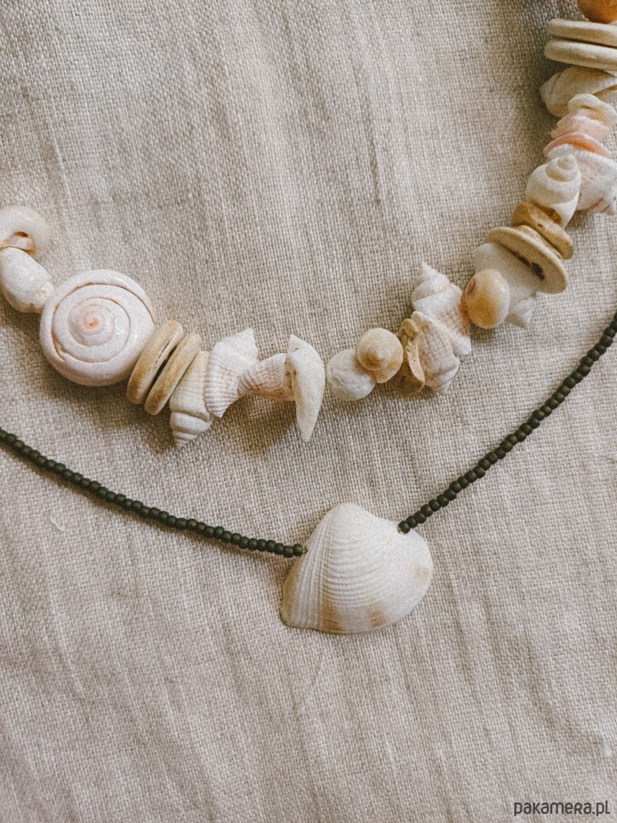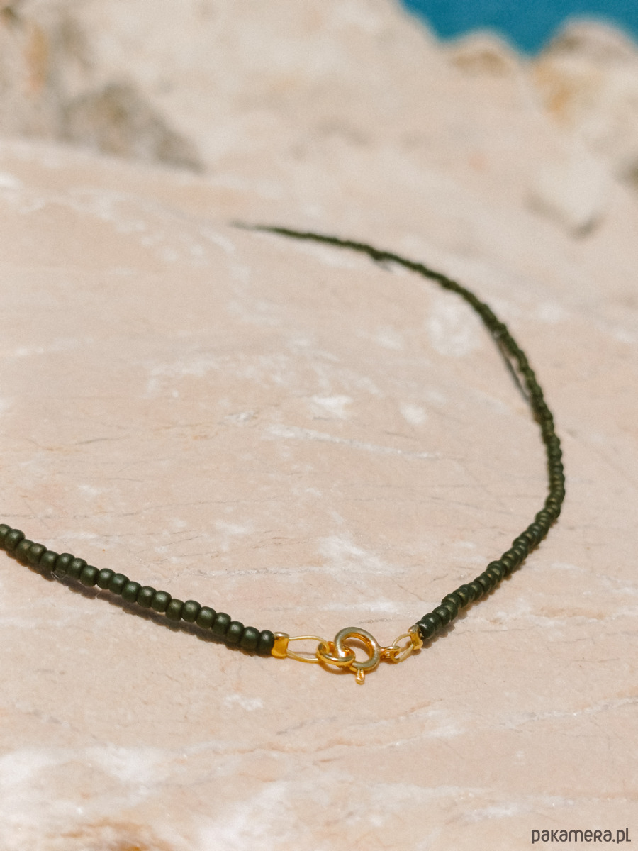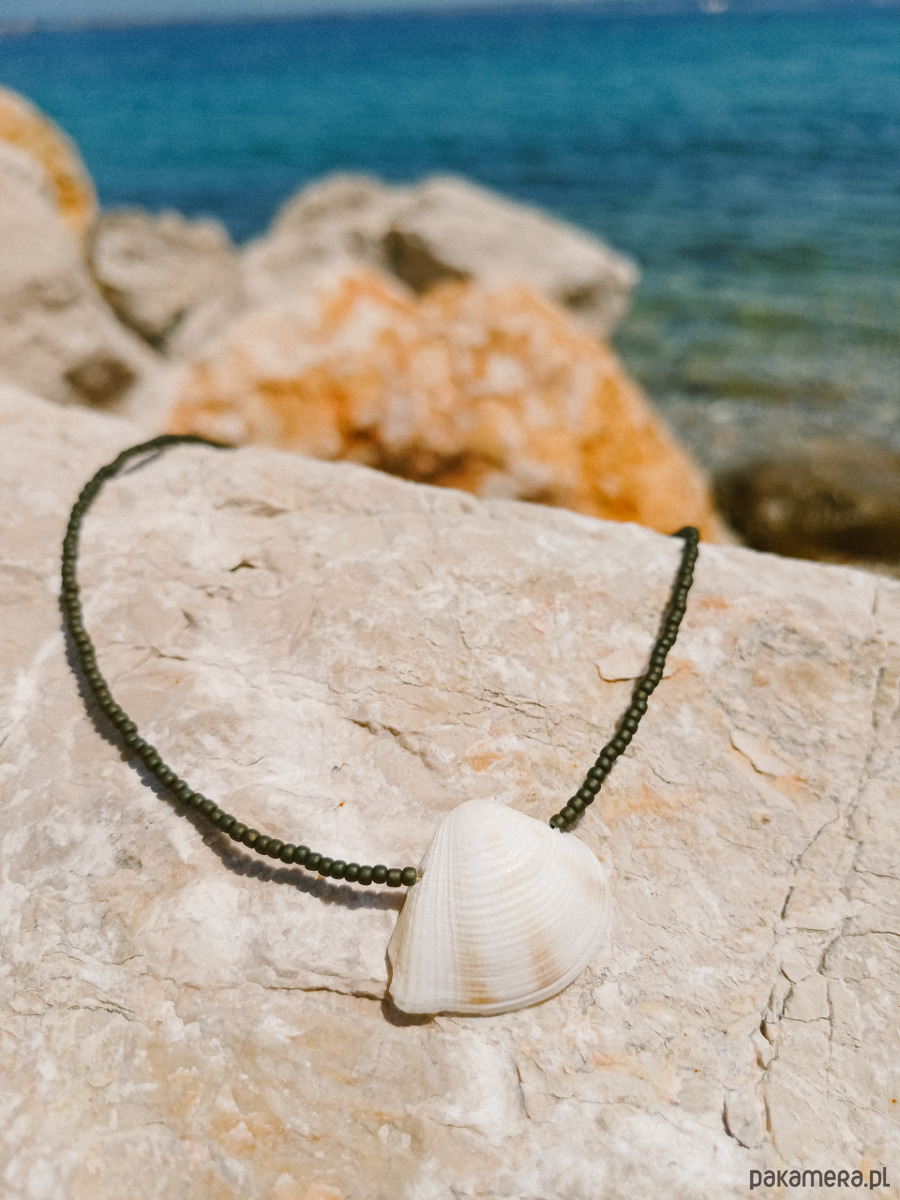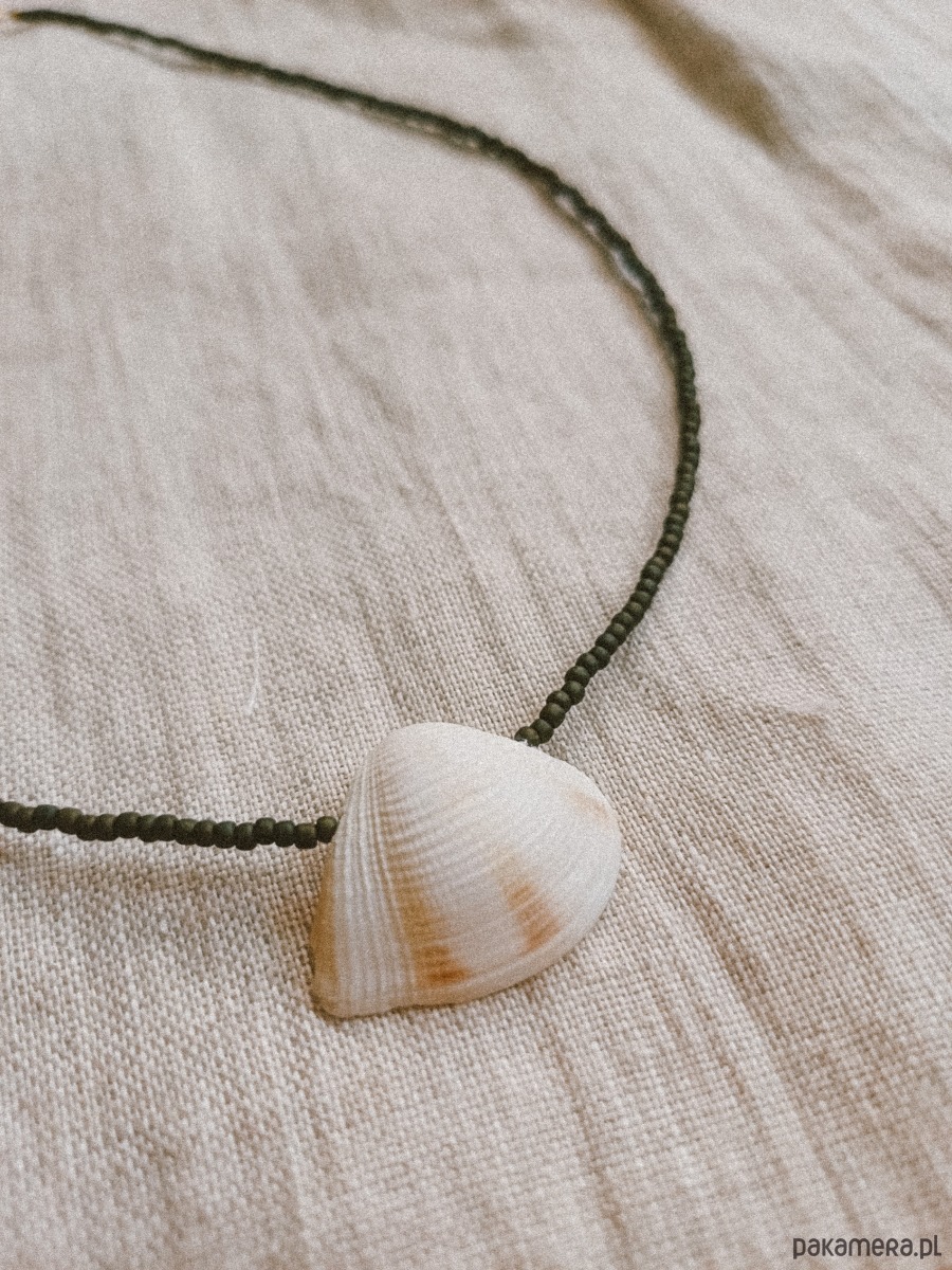 Naturalna muszelka, szklane koraliki w kolorze ciemnej oliwki z matowym wykńczeniem, japońska stalowa linka, stal szlachetna .
