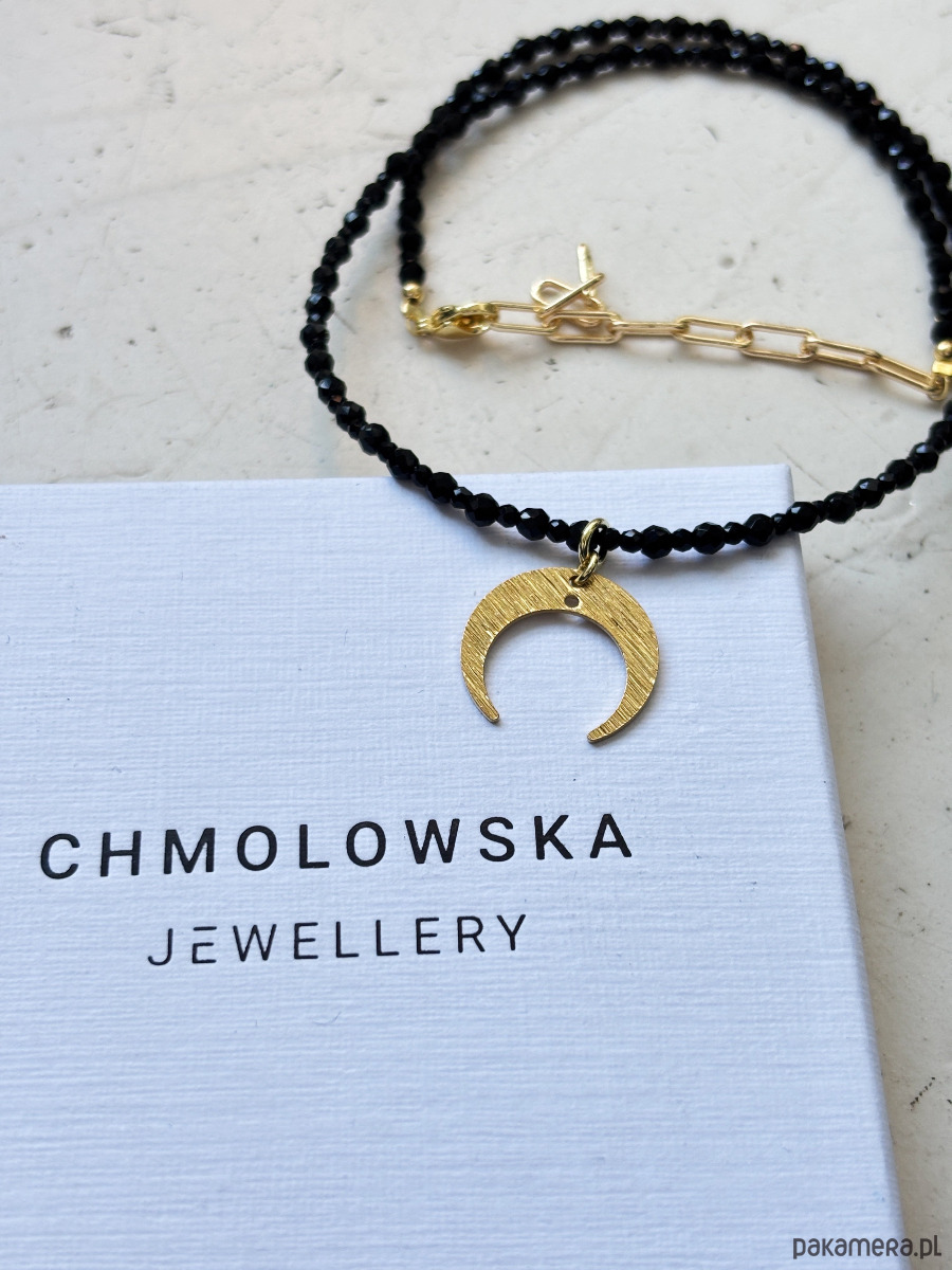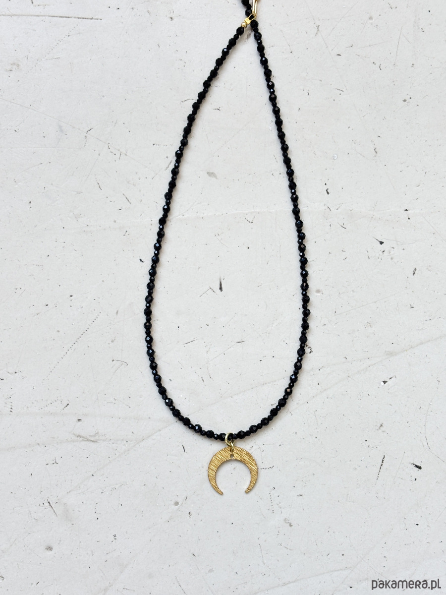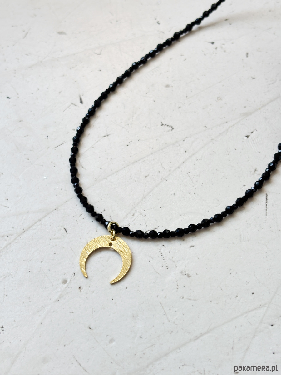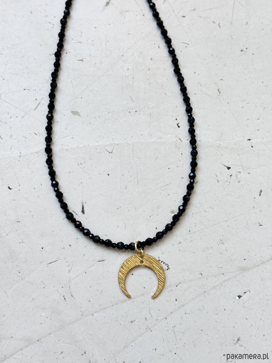 Naszyjnik wykonany jest na lince jubilerskiej z użyciem onyksu oraz zawieszki księżyca. Naszyjnik jest z łańcuszkiem regulowanym, wykonanym ze stali ch.