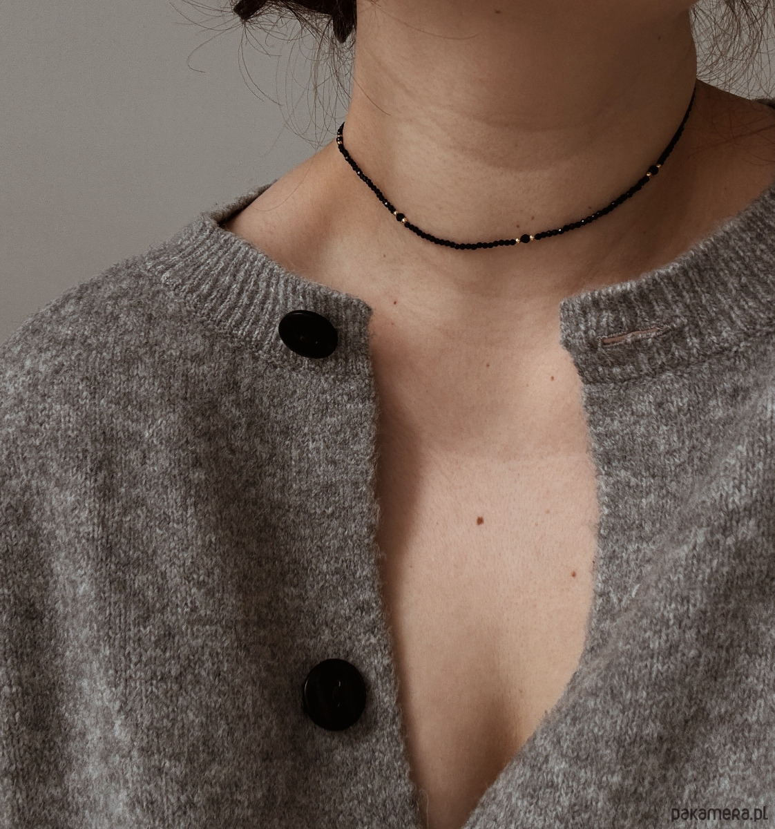 Naszyjnik wykonany jest na lince jubilerskiej z użyciem onyksu oraz pozłacanych przekładek, zapięcie wykonane ze stali ch.