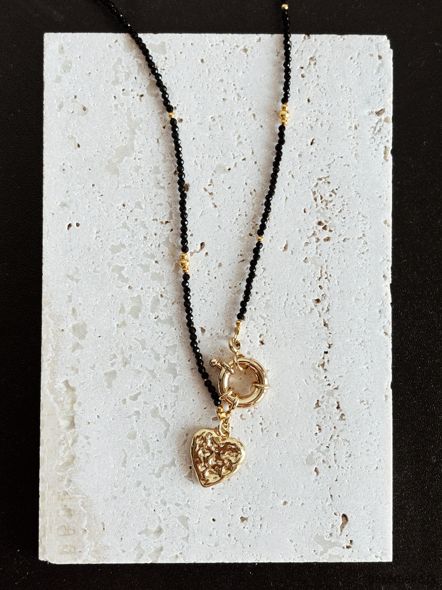 Naszyjnik wykonany jest na lince jubilerskiej z użyciem onyksu oraz zawieszki w kształcie serca, zapięcie ozdobne wykonane z mosiądzu rodowanego złotem.