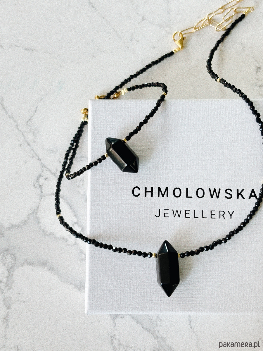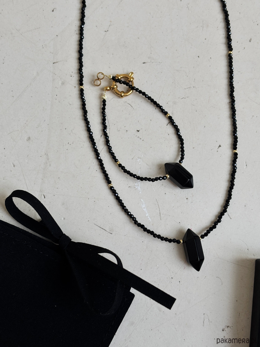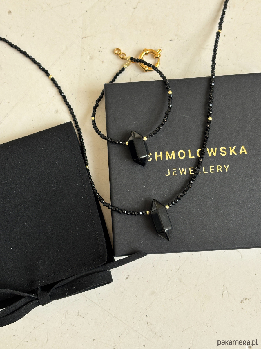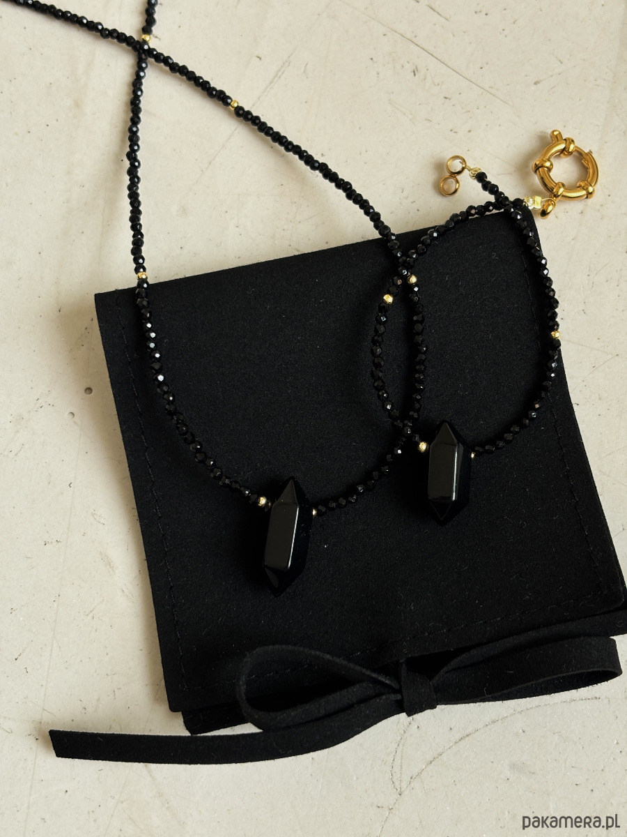 Naszyjnik wykonany jest na lince jubilerskiej z użyciem onyksu, zapięcia i łańcuszka rodowanego złotem oraz grot z onyksu.